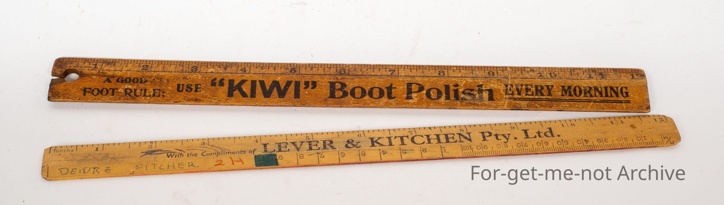 2 wooden rulers. 1 advertising Kiwi boot polish. The other one, lever and kitchen.