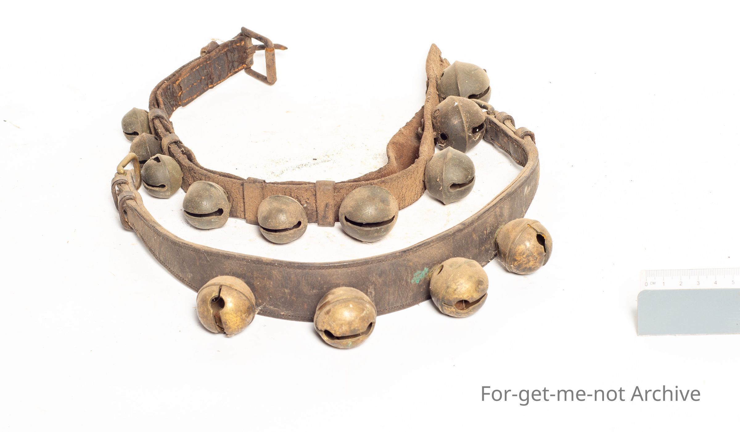 these are a group of bells on a leather strap. These are referred to as rumbler bells. They were used not just as a decorative purse purpose, but also to make people aware that the horse drawn vehicle was coming down the street. These are hard to find.Collection