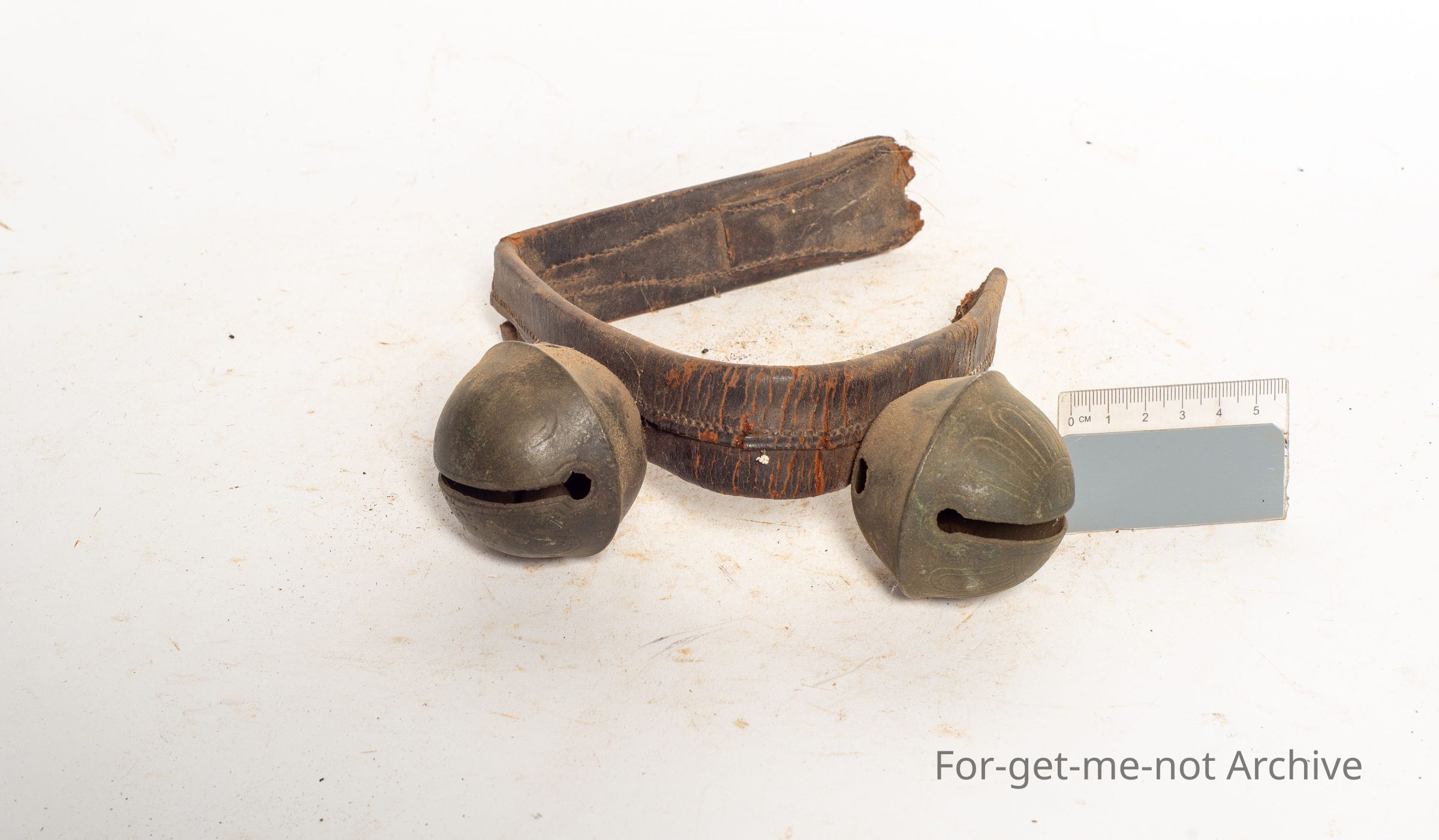 This is another shortened length rumbler bell. 2 existing bells left on the leather strap.
