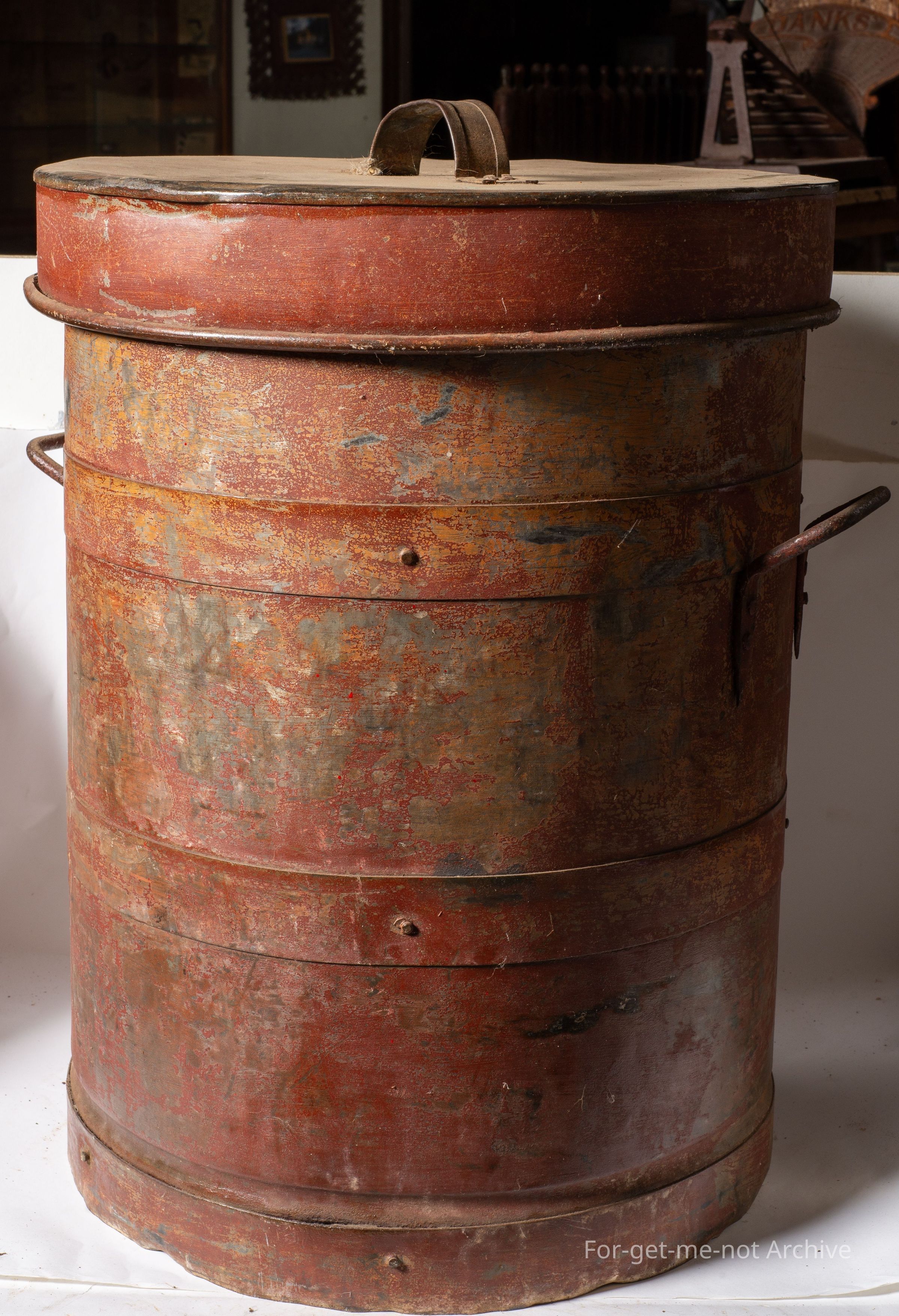 A rural drum description. This is quite a large capacity drum. Perhaps, 20 gallons. Handles on the side, quite a heavy lid. These, reputedly come from a general store in Narromine, New South Wales. Could have held, any number of grains or flour or what have you. There are 2 of these drums. Exactly the same.Collection