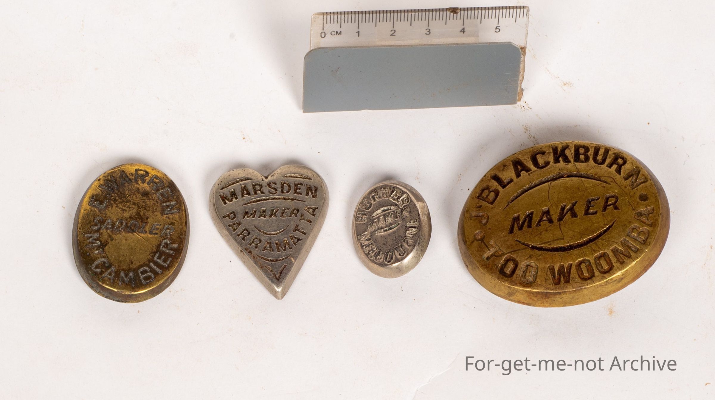 These are cast, saddlers plaques, each identifying the saddler and his whereabouts. First one Blackburn Toowoomba, second one Hunter, Melbourne, third one Marsden, Parramatta, the 4th one Warren, Mount Gambier. Beautiful piecesCollection