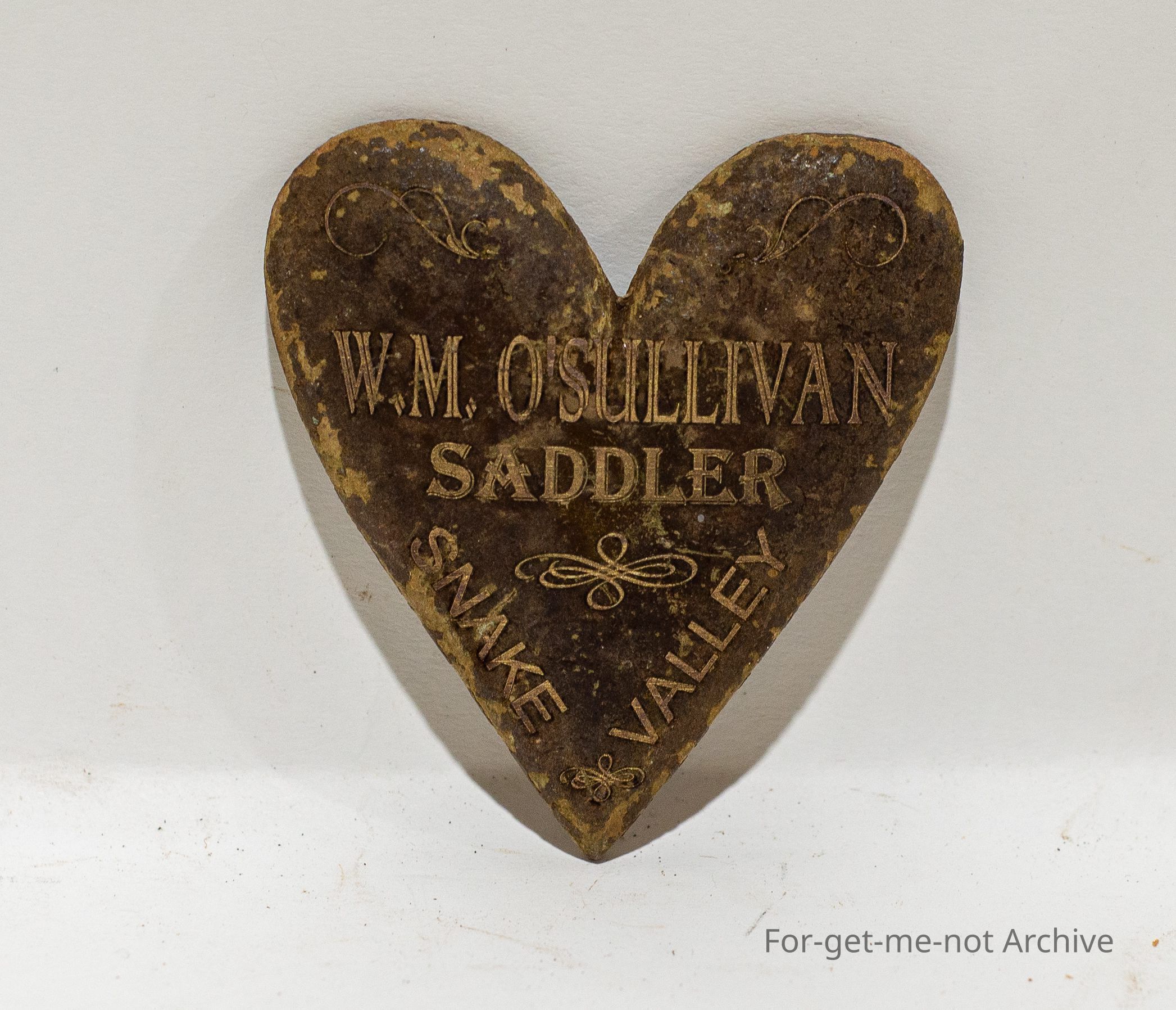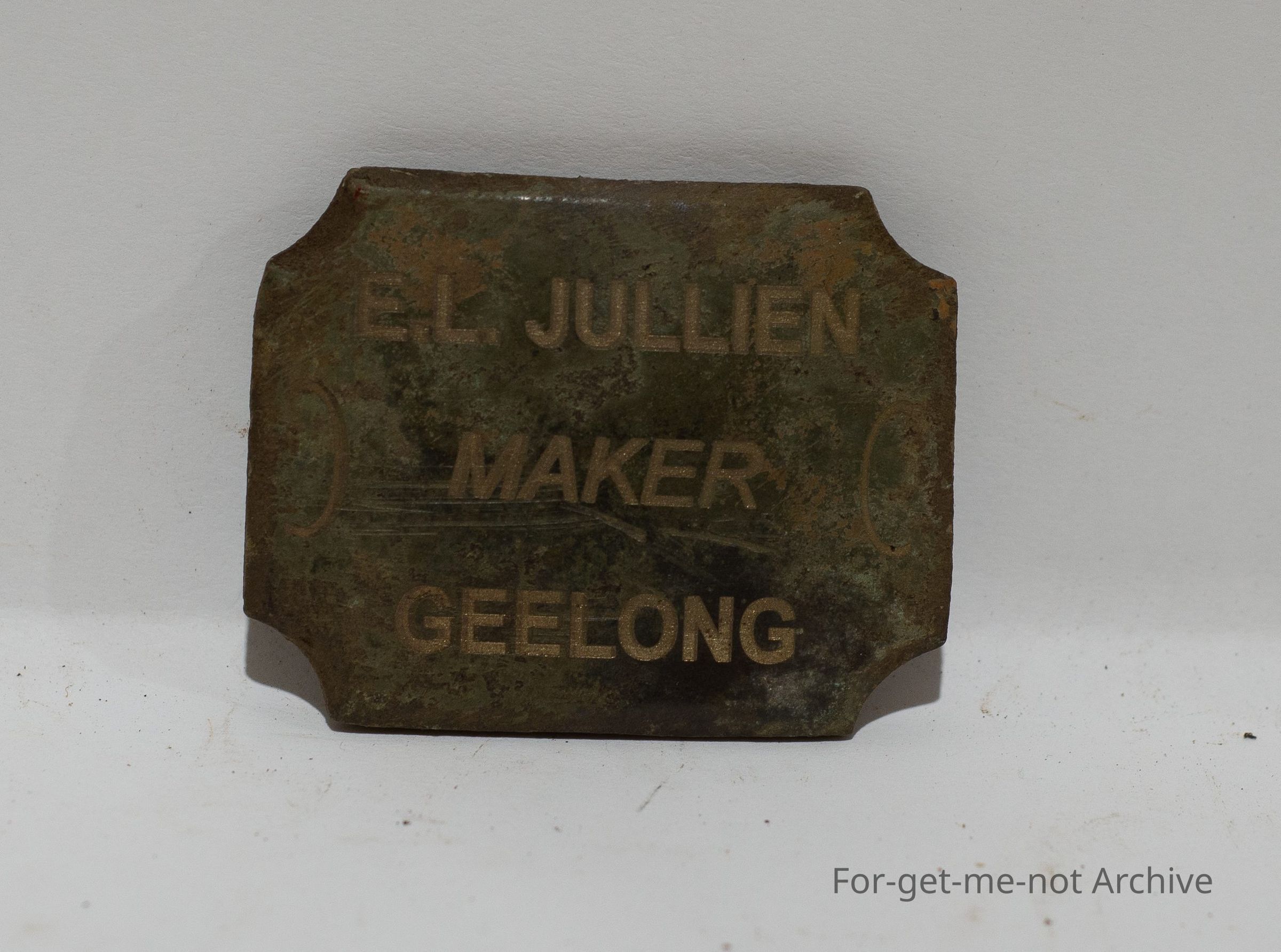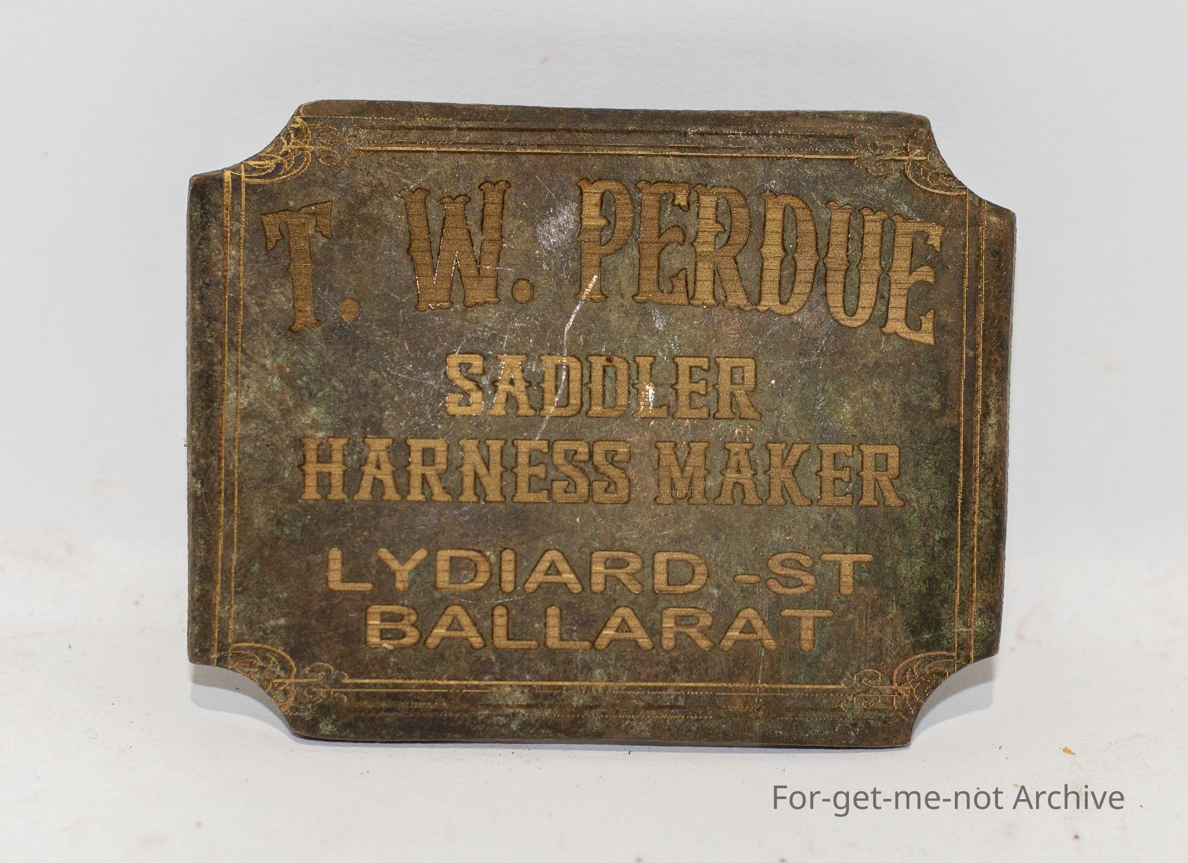 3 x Saddlers plaques, E.L. Jullien Maker Geelong, T.W. Perdue, Saddler harness maker Lydiard St. Ballarat ( Very nice/unusual form of scribing on this saddlers plaque, They were operating in 1866), W.M. O'Sullivan Saddler Snake Vally, All plaques are about 50mmCollection