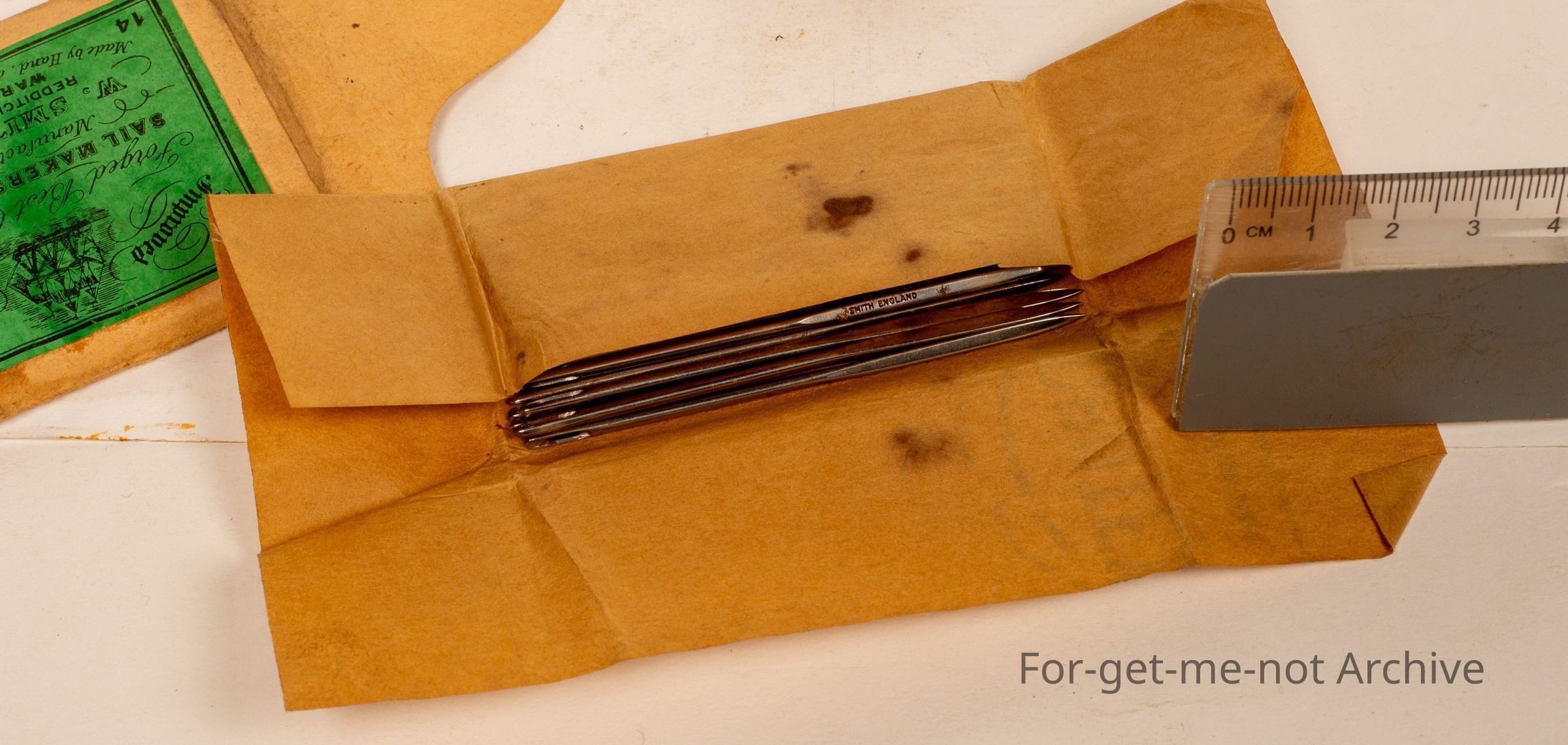 Is a small, package of Sail makers' needles made by W Smith and Son Redditch England. These haven't been opened. Beautiful patent of a sailing ship on the front. Made by hand not to cut the twine.Collection