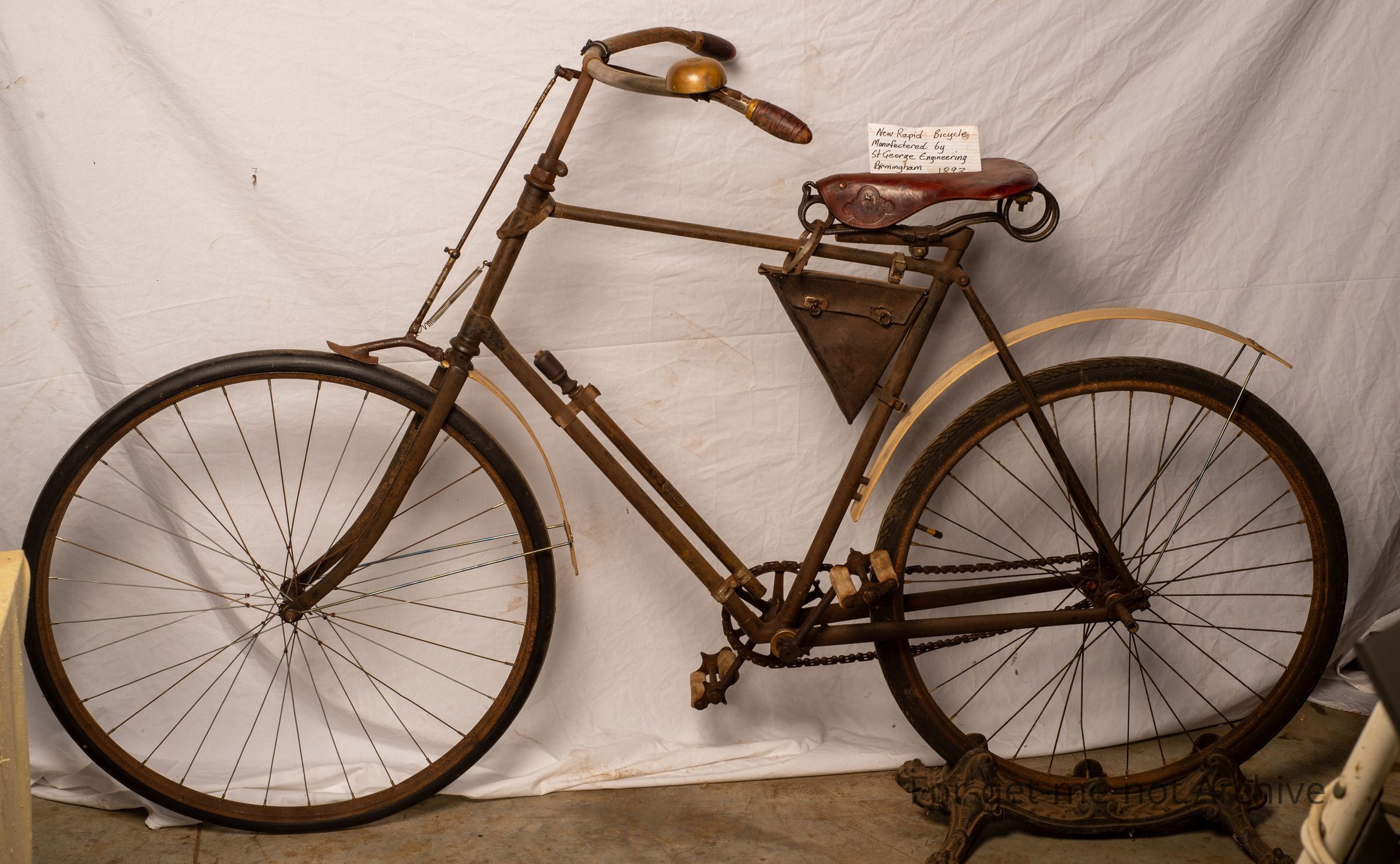 This is a very important bike made by Saint George Engineering Birmingham in 18/90 2/93. This is a transition bike from penny farthing to safety frame. The features incorporated in this, the mounting peg on the back wheel, the seat, which was fixed to the frame, the wrap around handlebars, which made the seating arrangement very bolt upright. Another, transition, feature is the large 30 inch wheel in the front, 27 inch wheel in the back. The chain wheel is of cast iron construction. The chain itself is the original chain, which is an inch link block chain. The bell is a Joseph Lucas, penny farthing bell. The only breaking was a spoon brake which put pressure on the top of the front wheel. The leather triangular kit is a, a tool kit from that period. It has wooden mudguards, which are short sections on the front wheel and the back. Very important bike. Hardly any left in existence.Collection