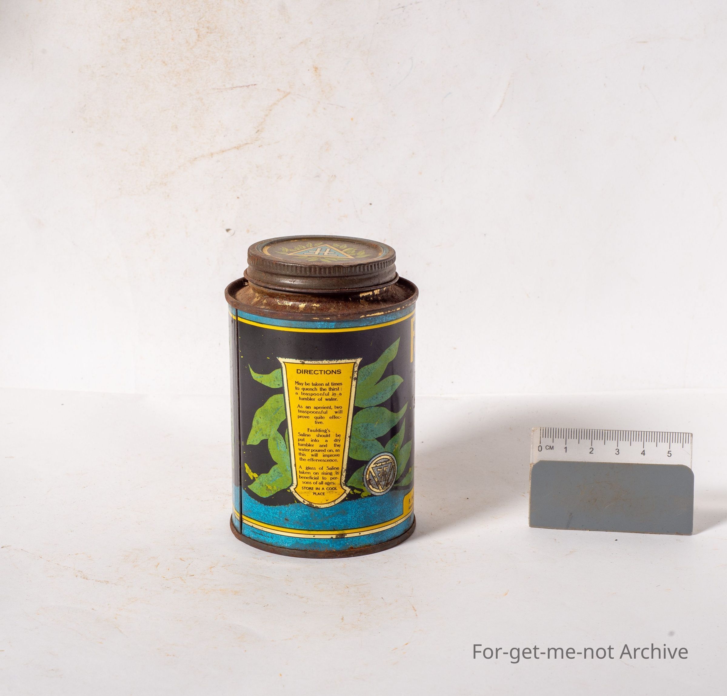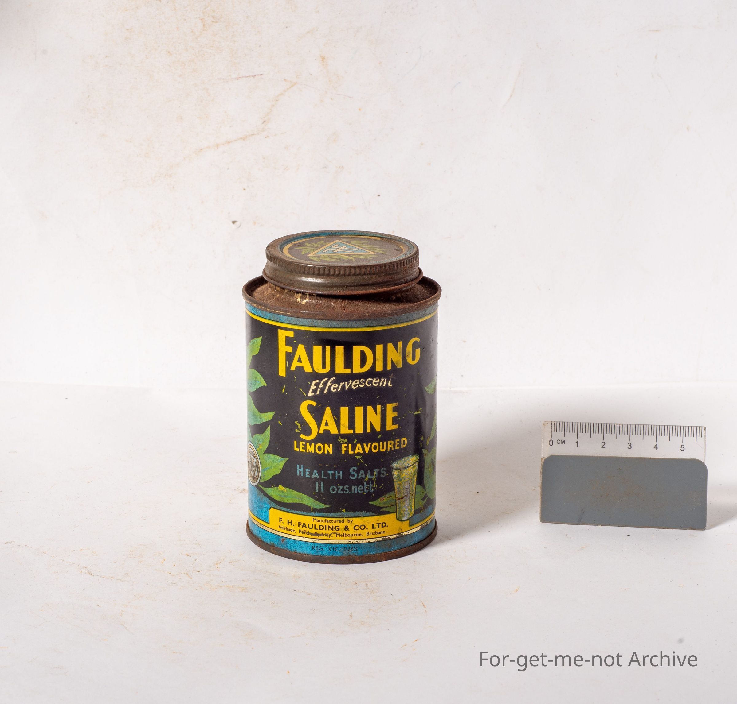 This tin is a Faulding Saline Lemon Flavour, packed by Faulding Adelaide, Melbourne, Brisbane. Graphics in very good order. Nice screw top lid graphics. 11oz