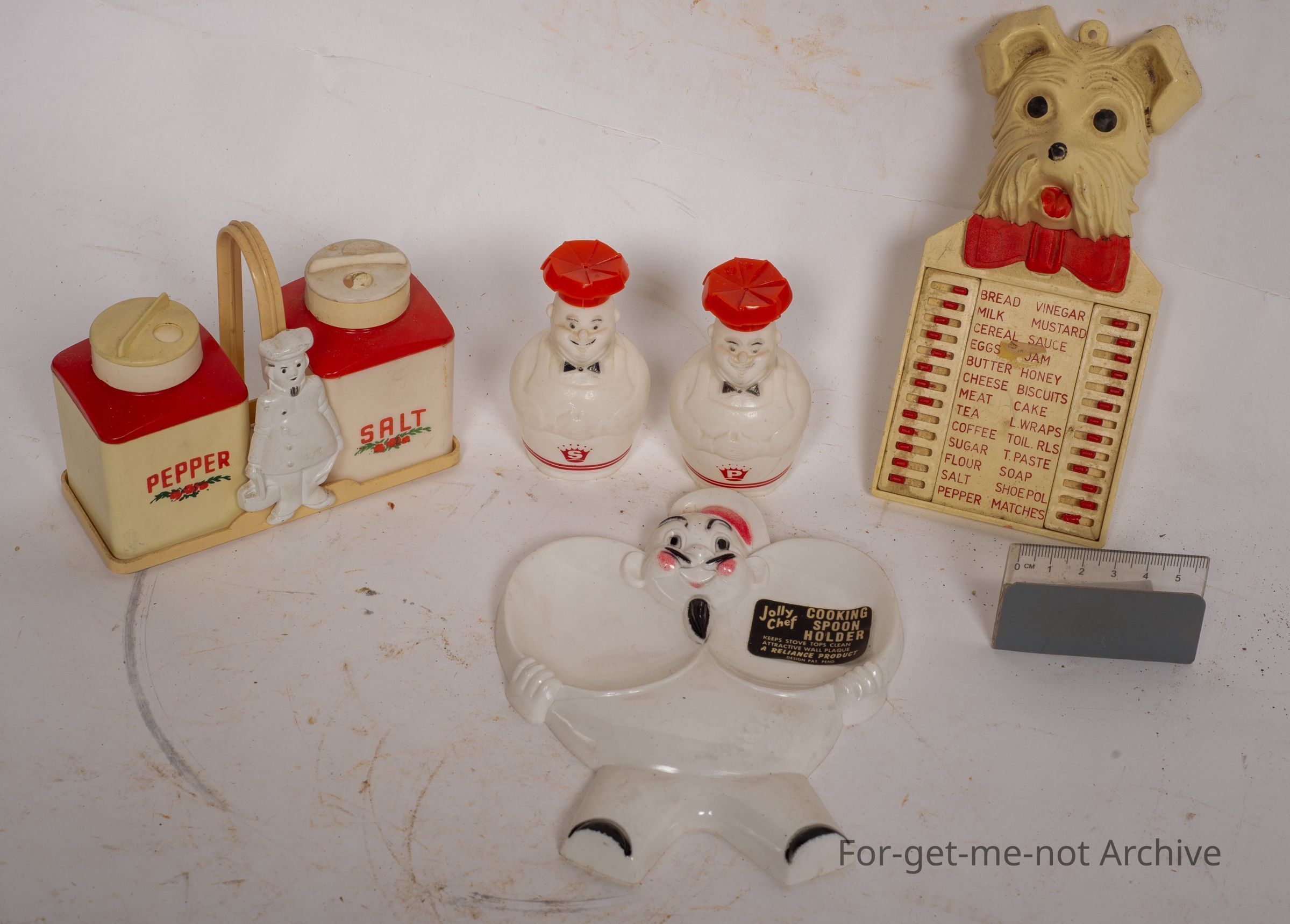 This is a group of various chefware items. Kitchen just kitchen plastics. They're not chef these that's the only chefware one. So you got just of that era, the fifties, sixties, everyone had plastic bits and pieces? These are plastic kitchenware items from the fifties sixties. One is a memo. Another one is salt and pepper or 2 sets of salt and pepper.Collection
