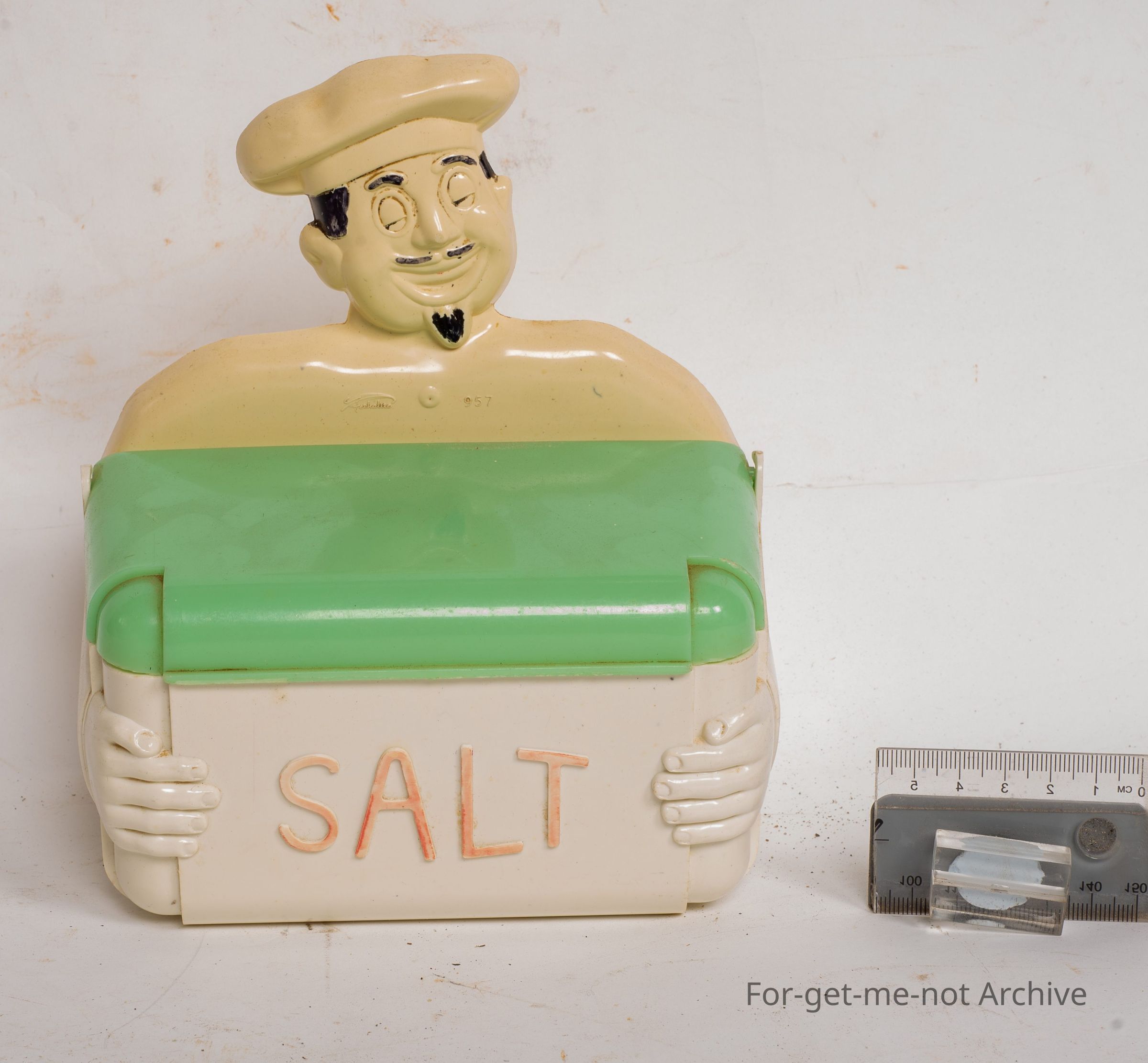 This is a salt container made by Gayware with the chef image at the back for the stand. This is all in very good order, plastic in top shape.