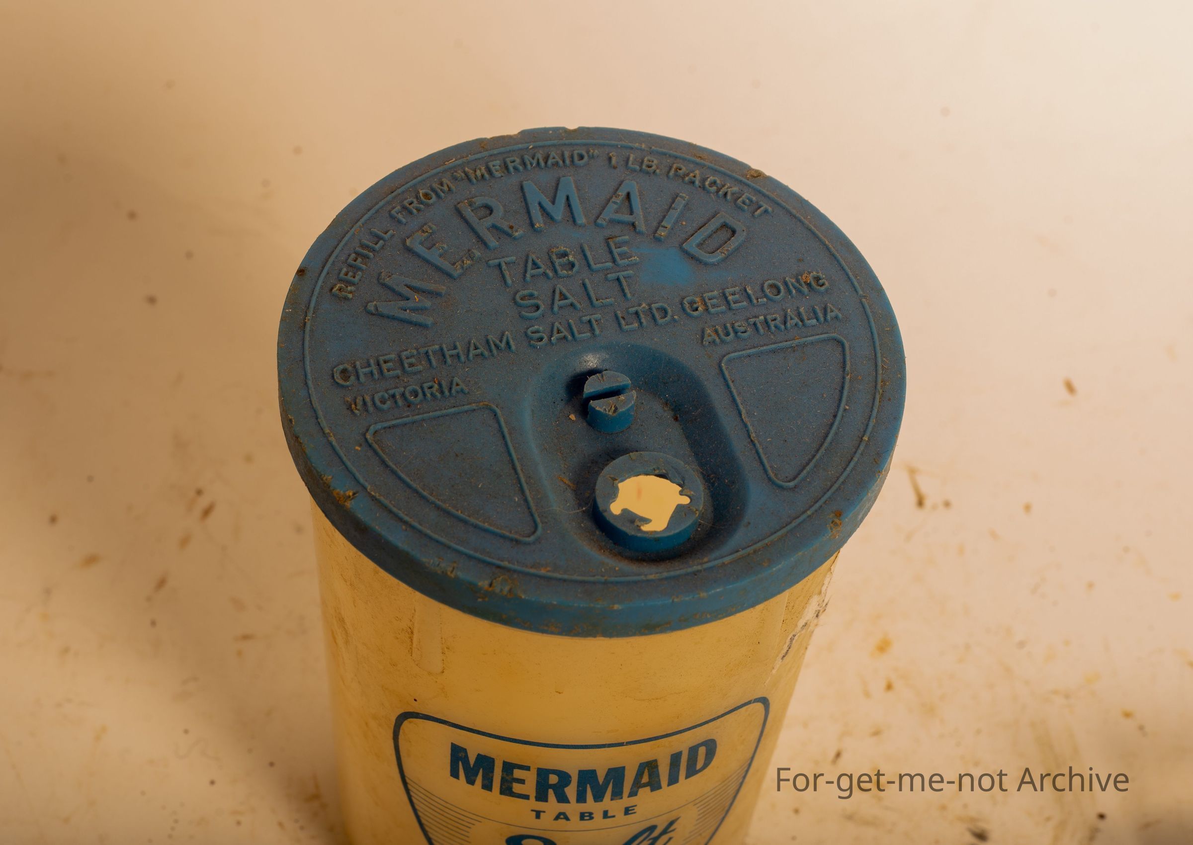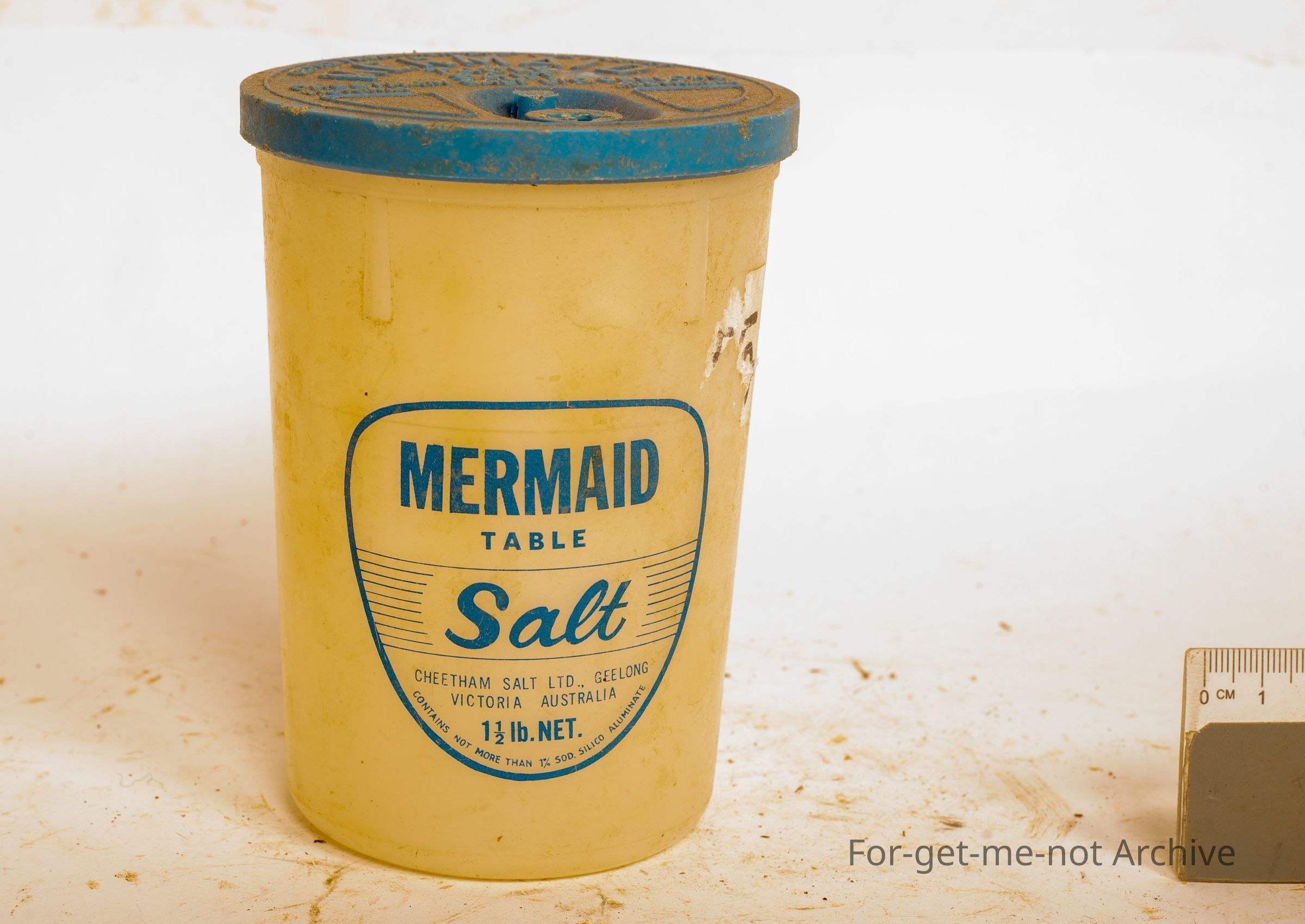 This is a plastic container of mermaid table salt, a 1 and a half pound net. From Cheethams salts geelong