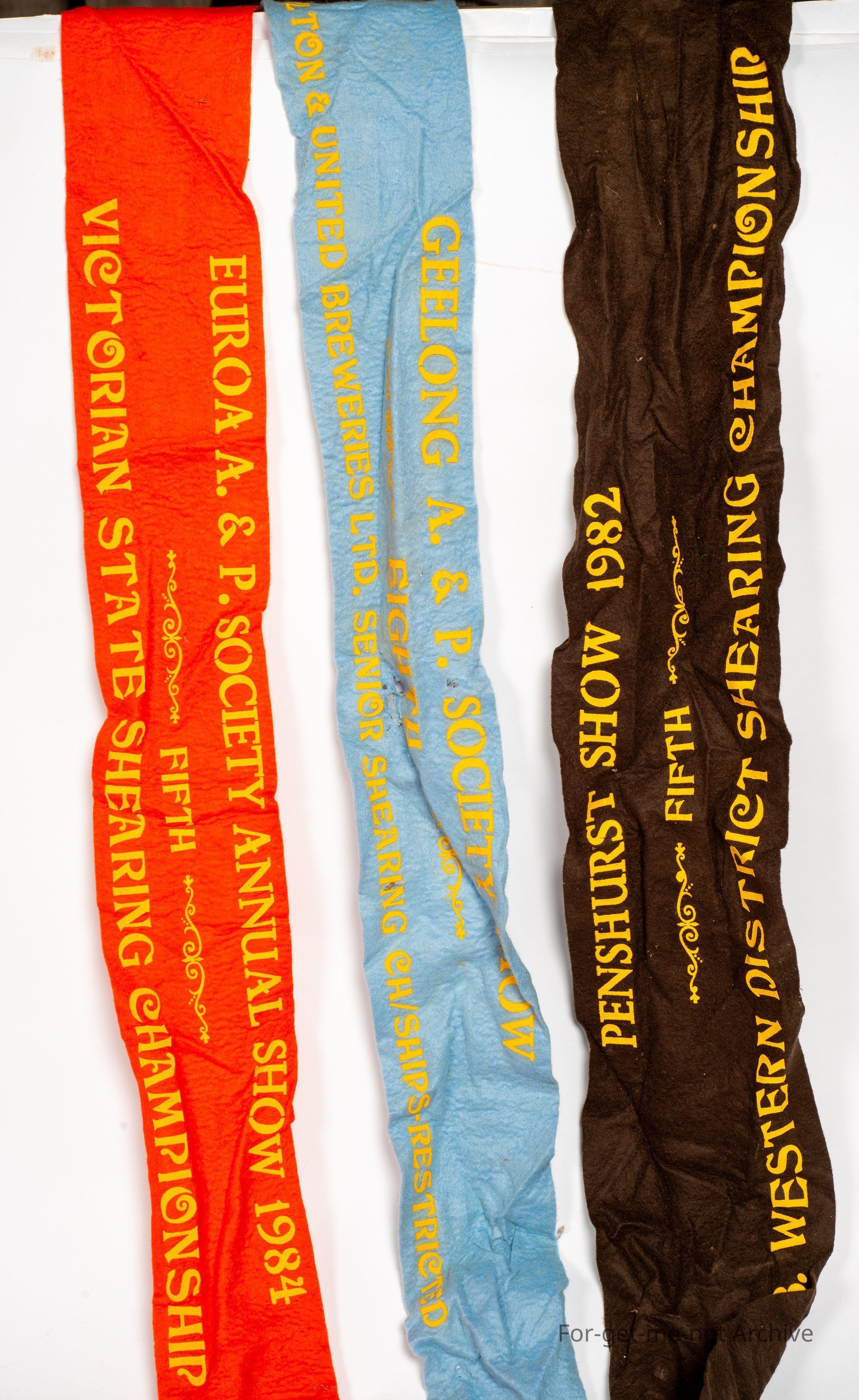 This is a little, collection of sashes giving out given handed out at shearing competitions from 1982 to 1984. Various venues,