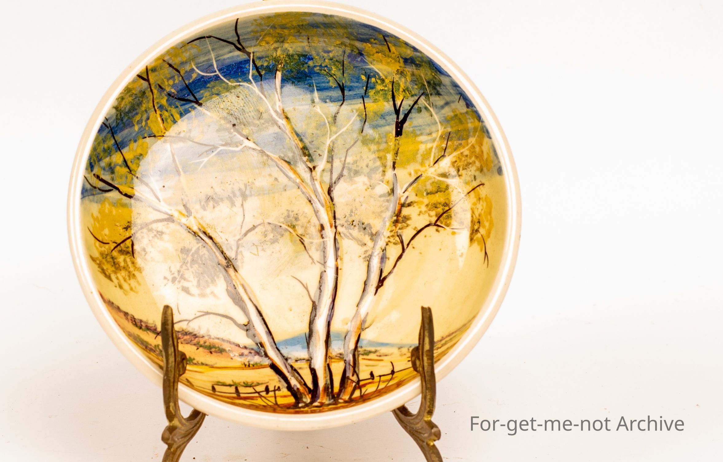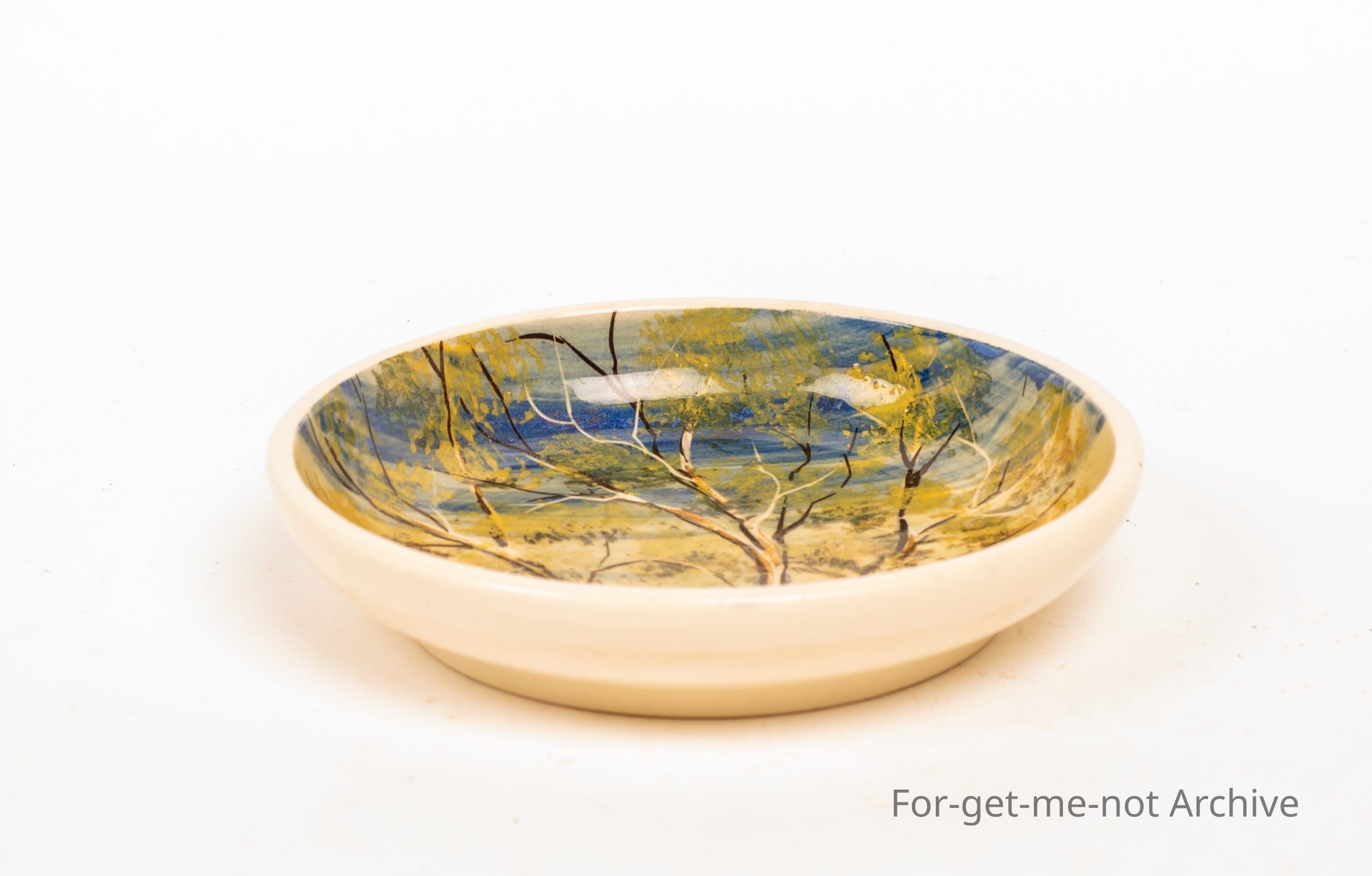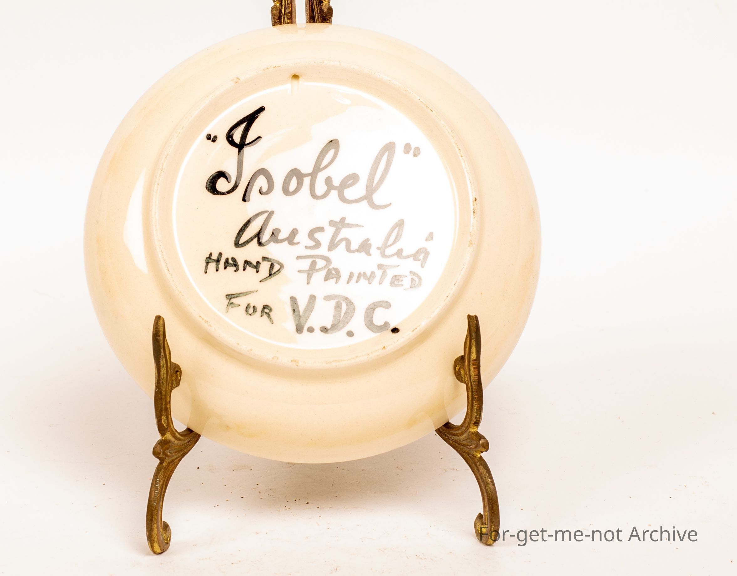 Small saucer. Hand painted on the back. Isabelle, Australia hand painted for VDC.