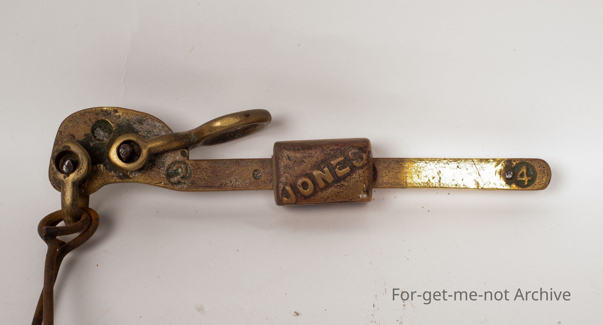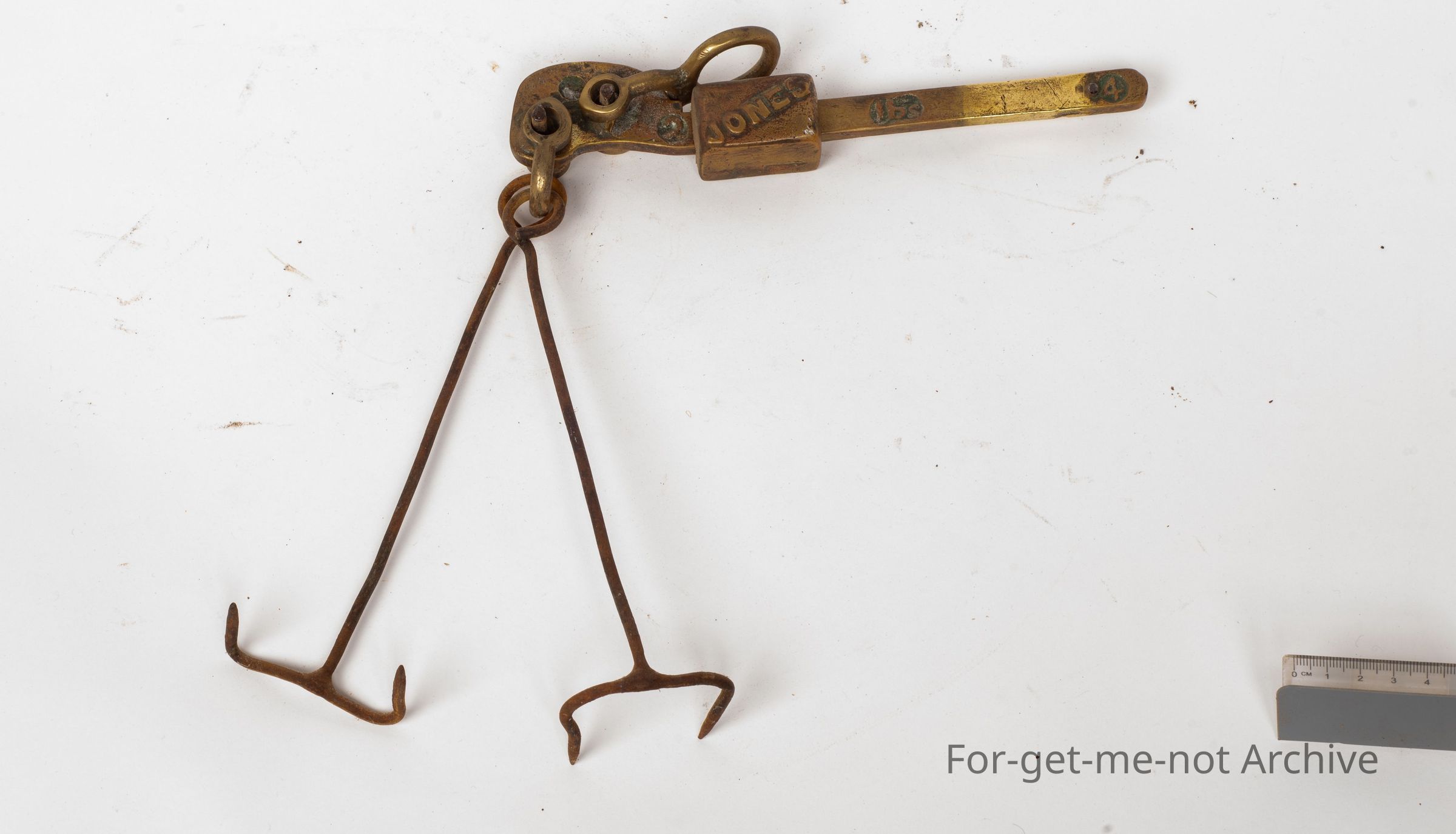 This is a set of scales of unknown use, manufactured by Jones, has 2 grippers at the bottom, only goes from 1 to 4lb, so whatever it was weighing was light.