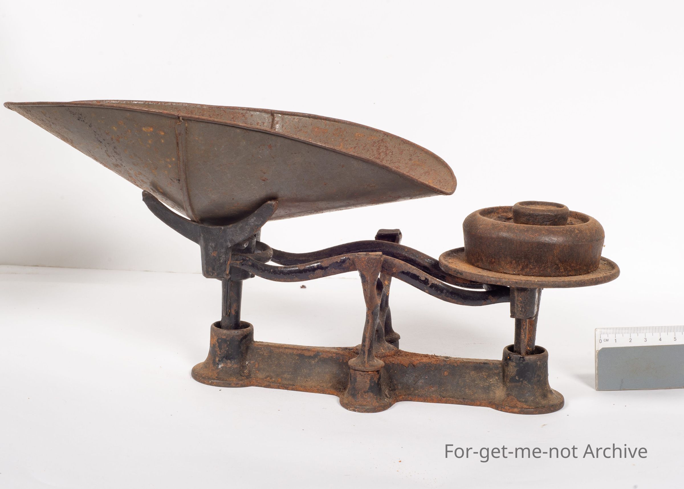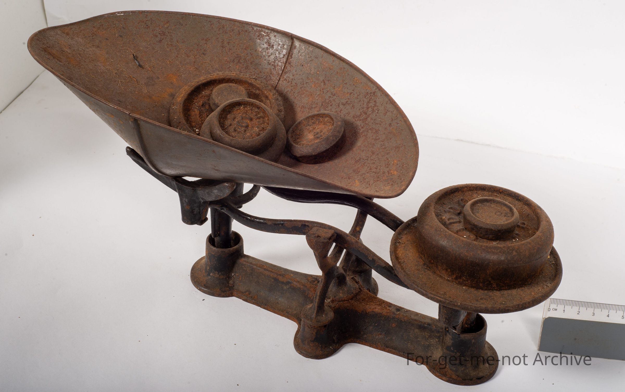 This is a cast iron set of small shop scales, probably for sweets. Big tin dish to hold the contents with a range of cast iron weights for balancing.