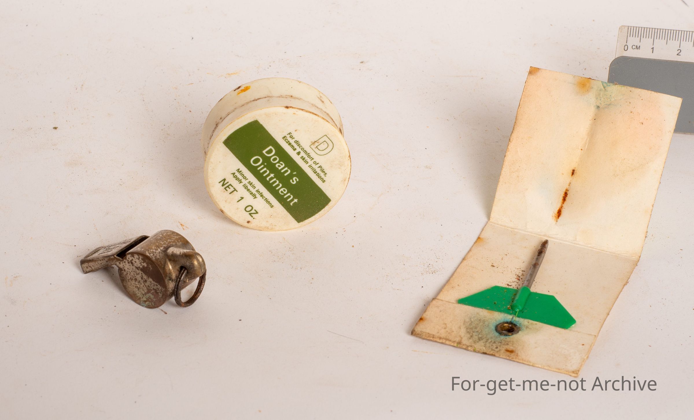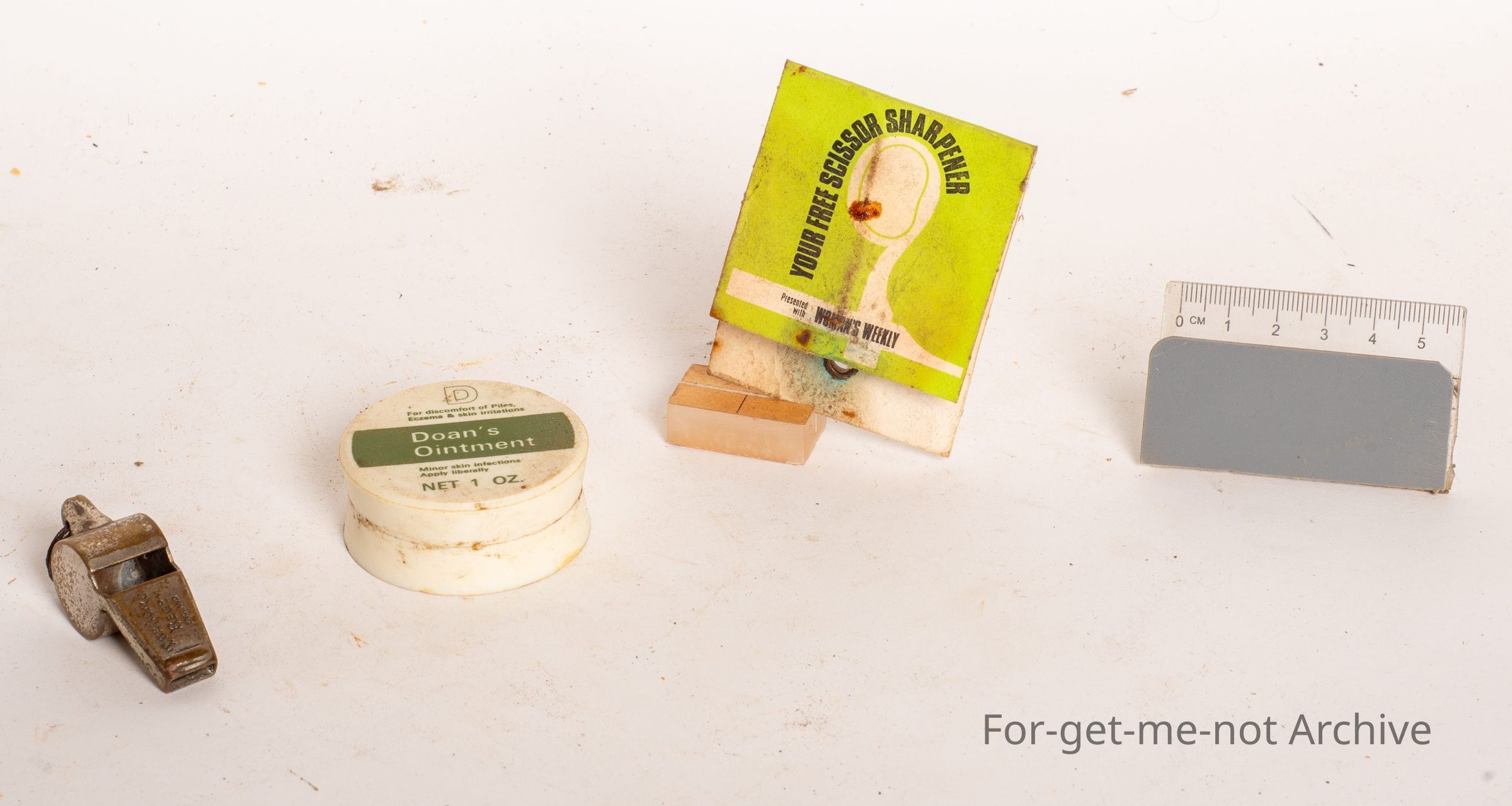 This is a scissor sharpener that came with the Women's Weekly Newspaper, still in its original little cardboard folder with the attachment in it. 2nd piece, plastic container of Doanes Ointment 1 ounce weight for the discomfort of piles, eczema and skin irritation. Very handy. 3rd piece is just a little Acne referee whistle, very small size, perhaps as a kid's toy.Collection