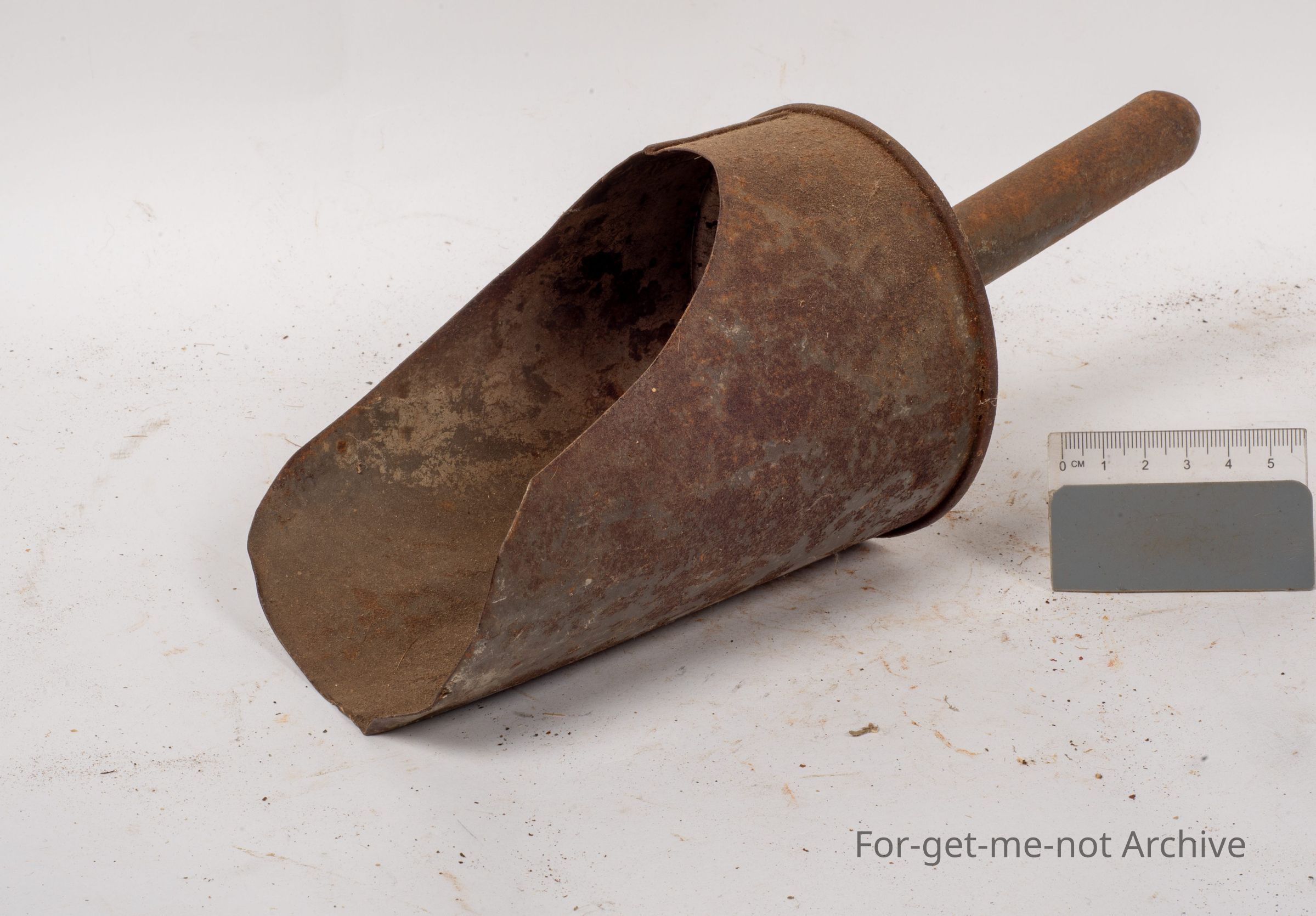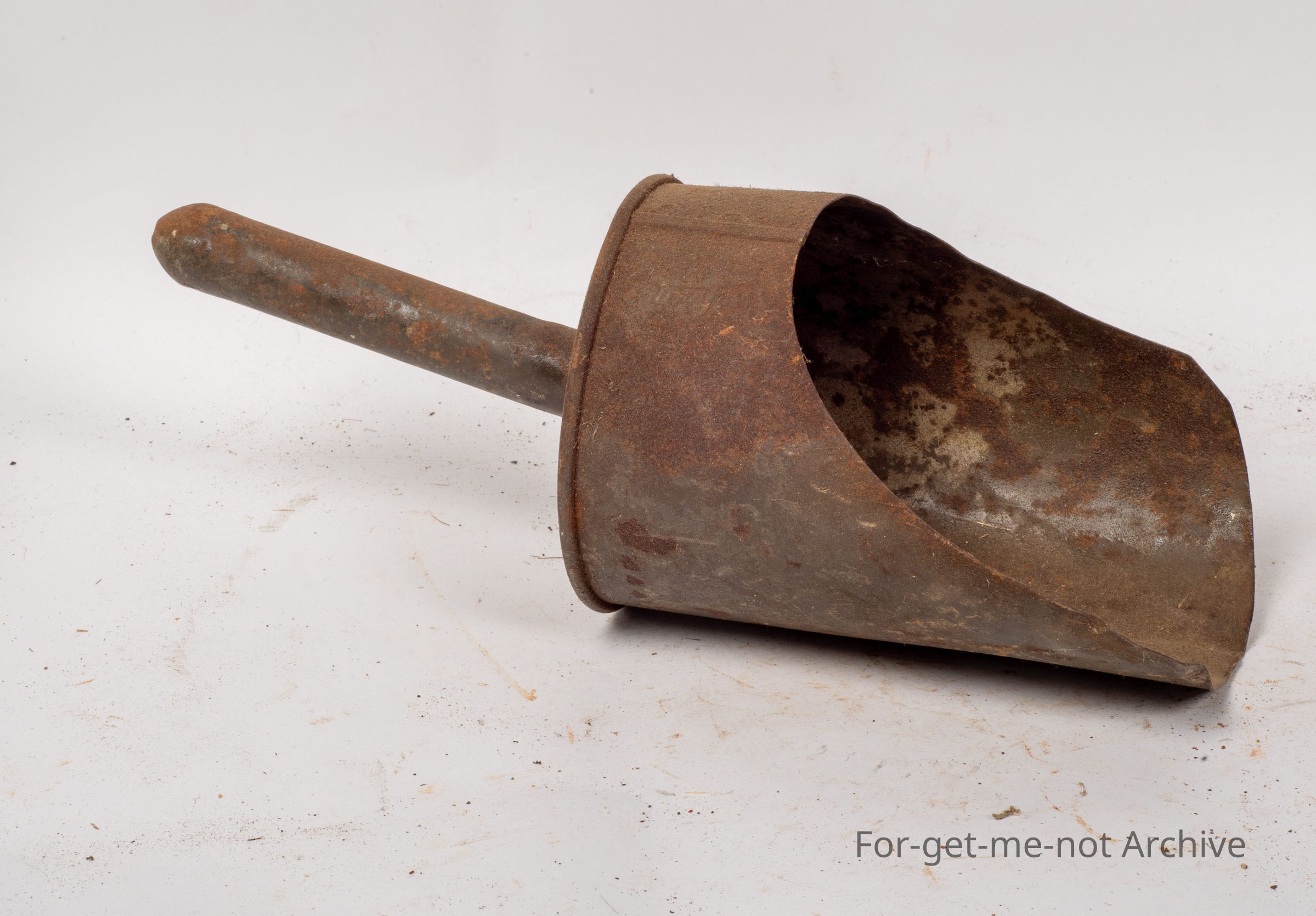 Another Depression era piece. This is a homemade scoop for getting flour or rice out of a bin. Nice tin handle being put onto it. The improvisation, the scoop part is made from, the base of some sort of a tin. It's still in good order. Lovely piece.Collection