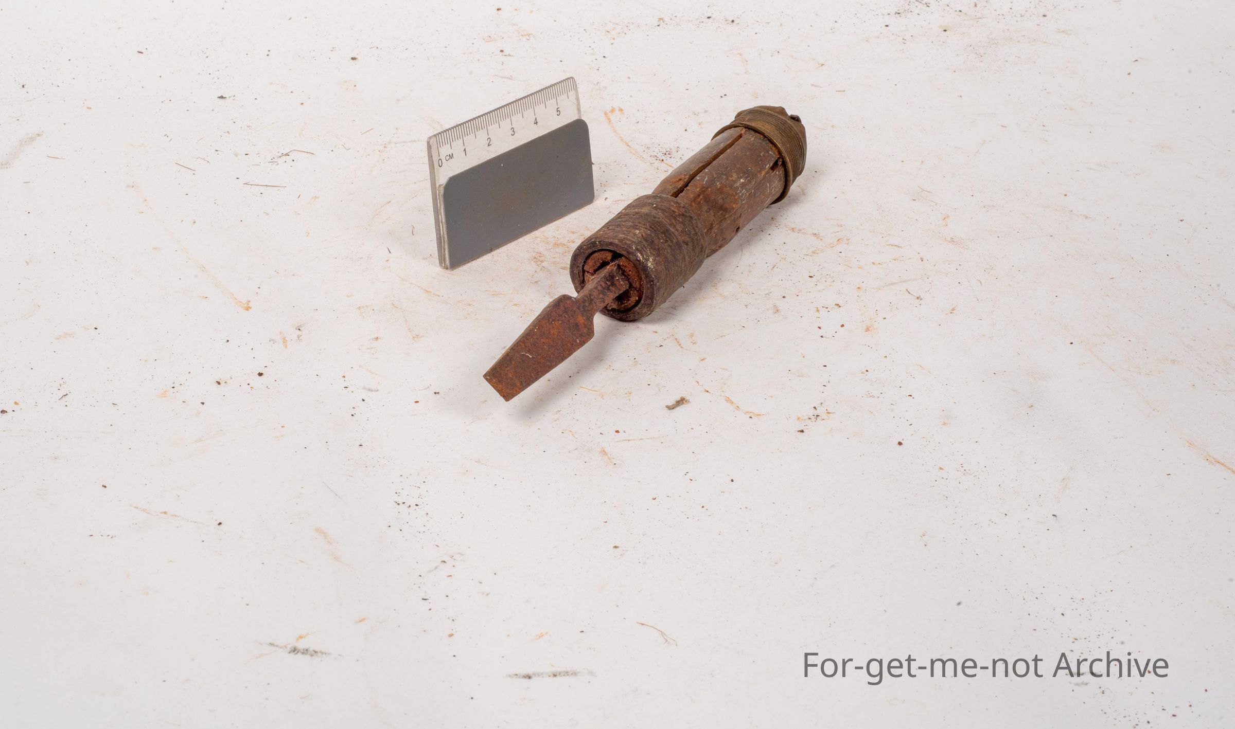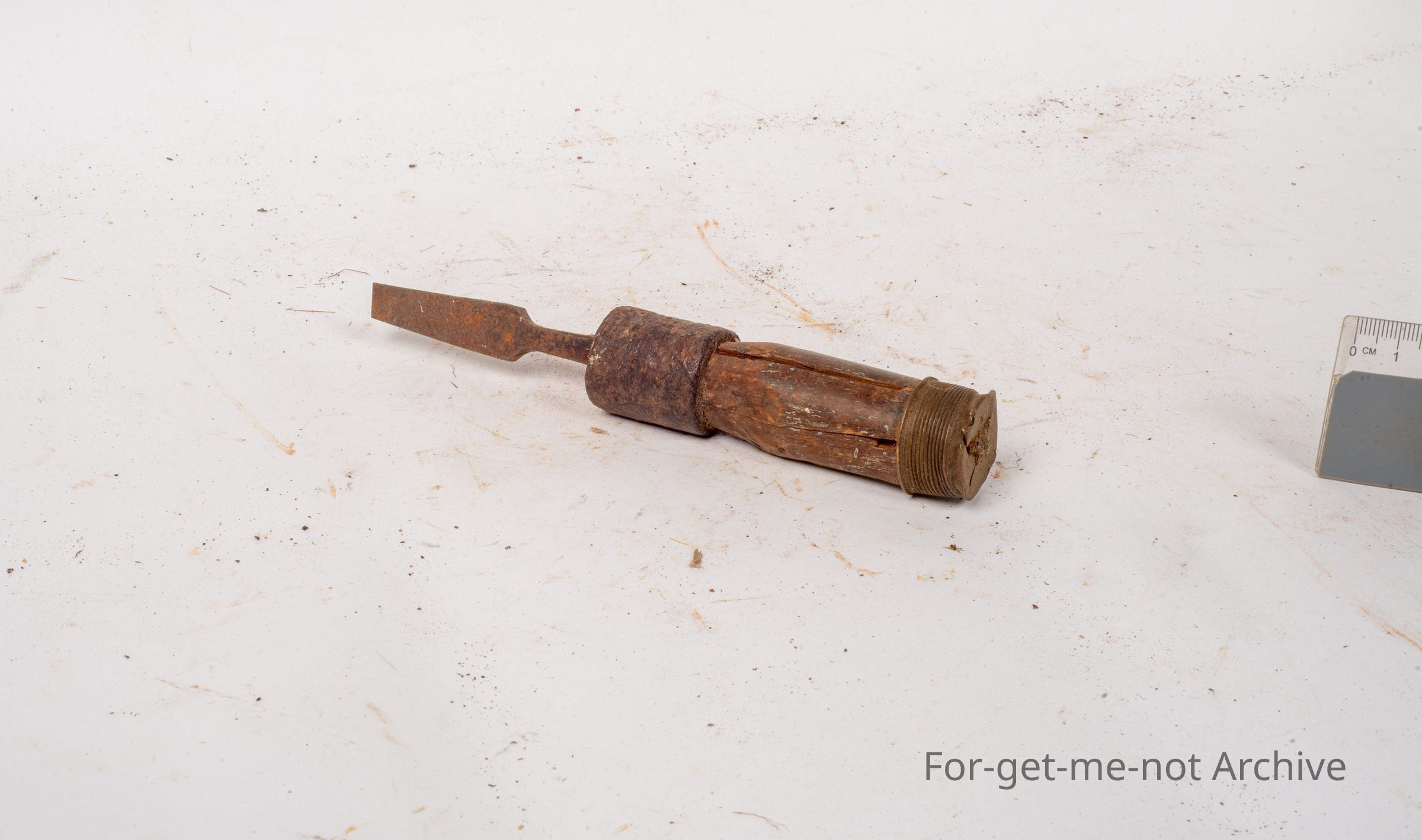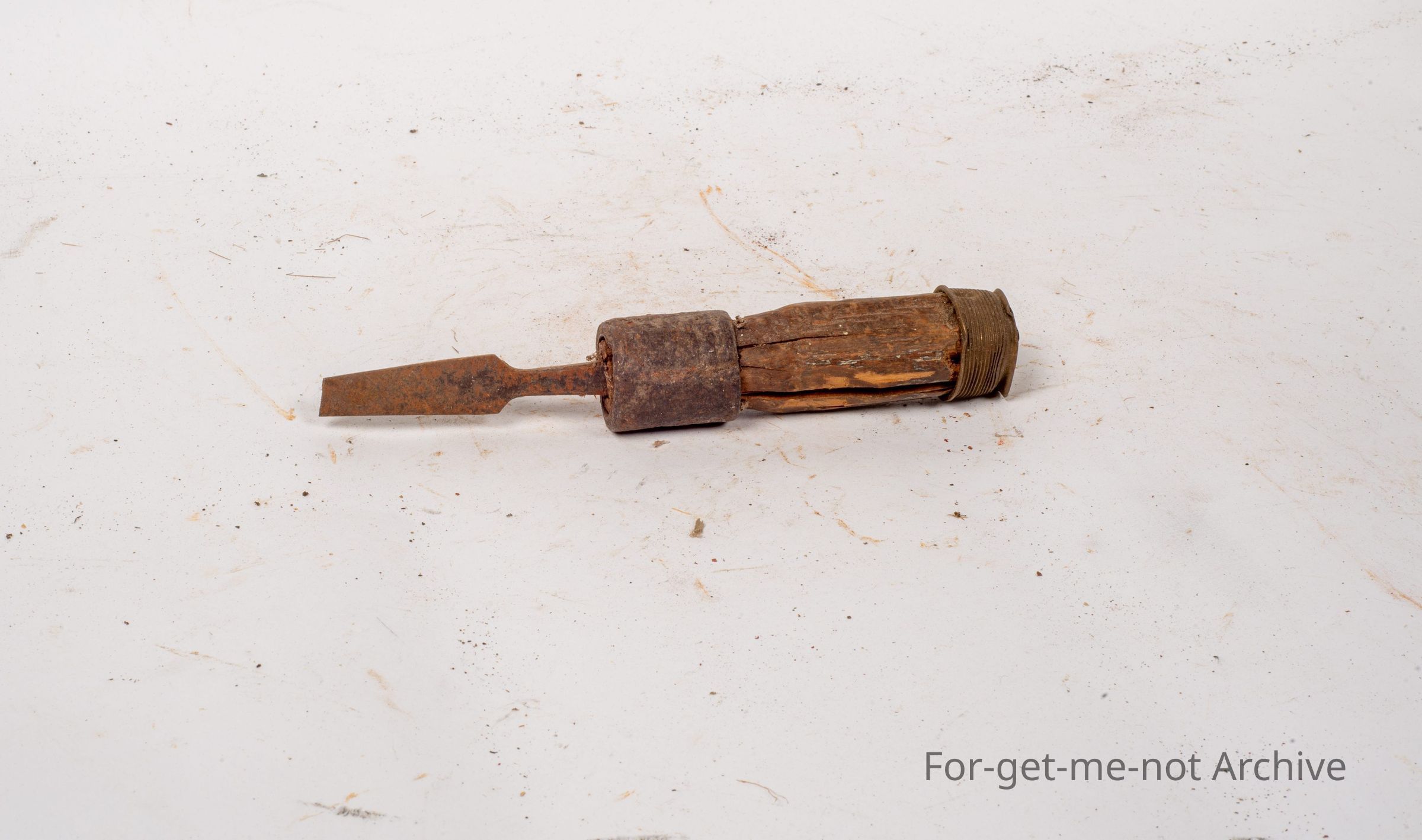 This is a classic home repair, an improvised tool which once would have been perhaps a screwdriver. The working end has been hammered into a piece of roughly hewn wood, a heavy iron collar. The end of it has a brass end for hammering or turning. Complete, very thorough improvisation. Classic piece from the 19 thirties.Collection