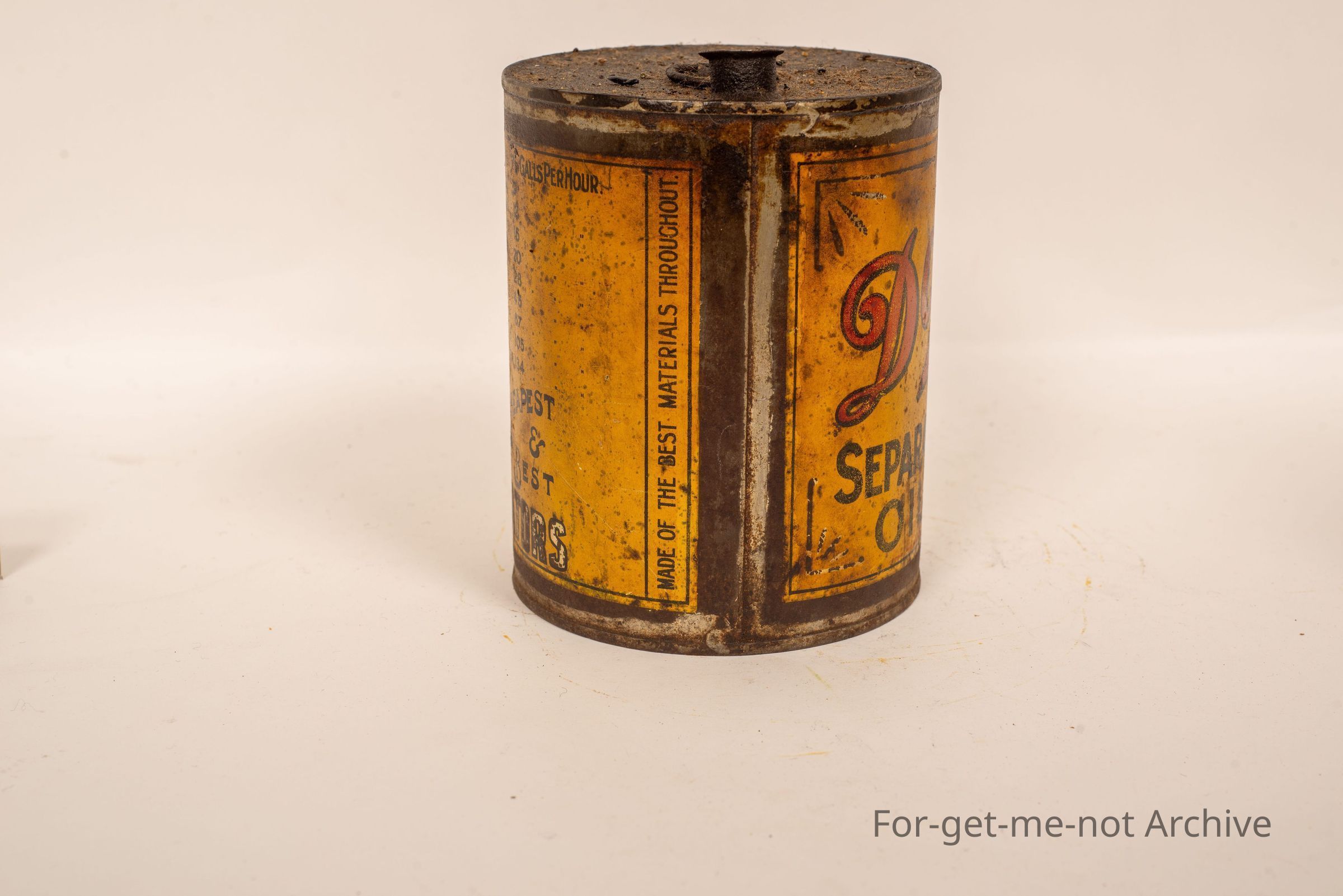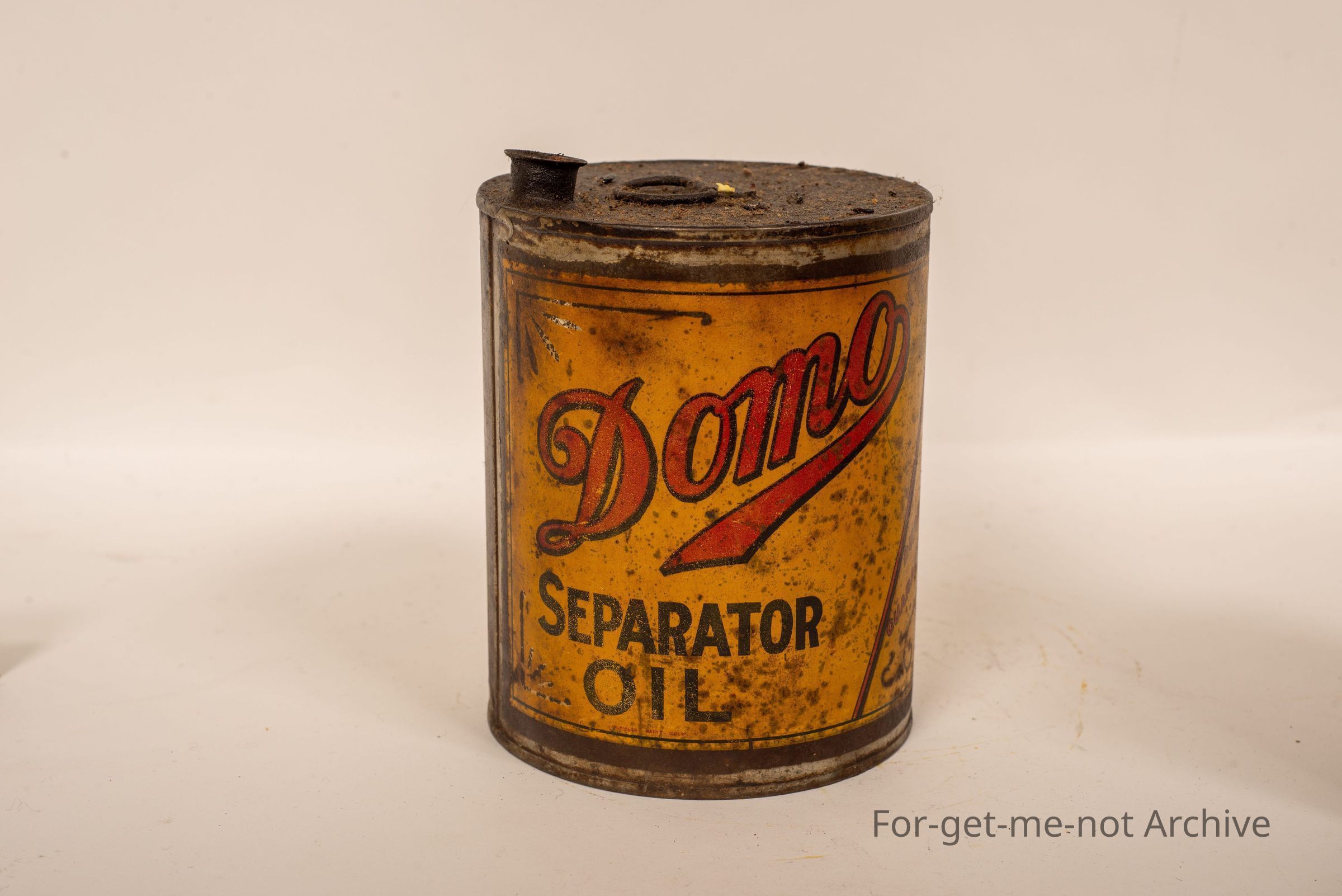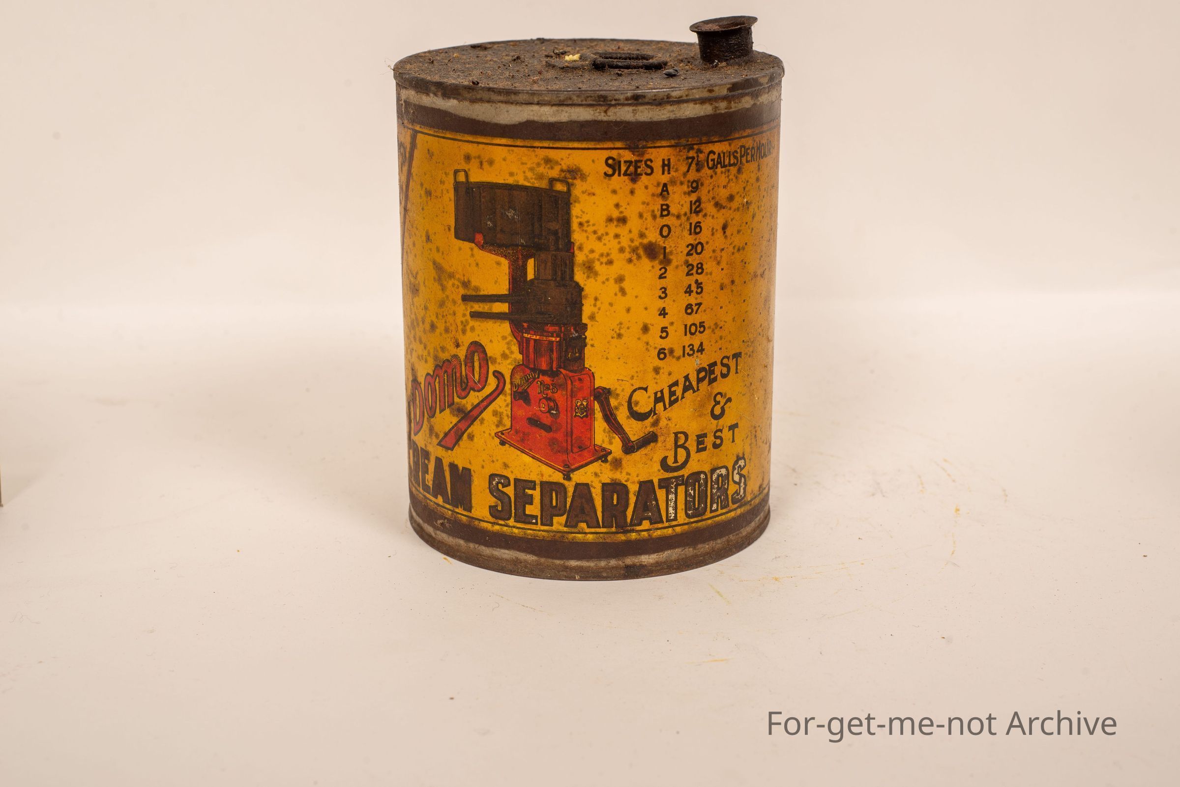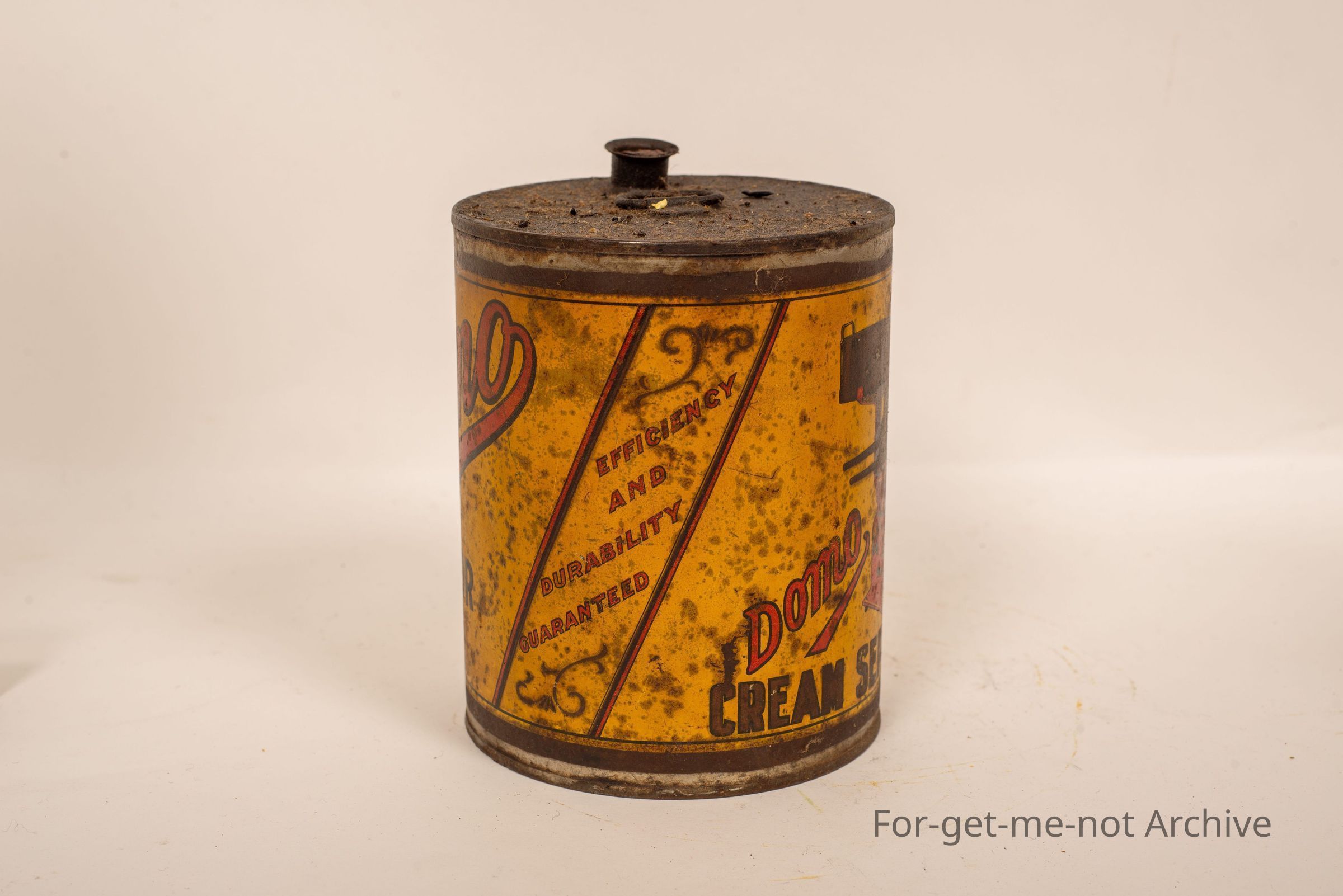 Domo separator oil can, cream separator. Cheapest and the best. Didn't say what country, but it's a nice tin.