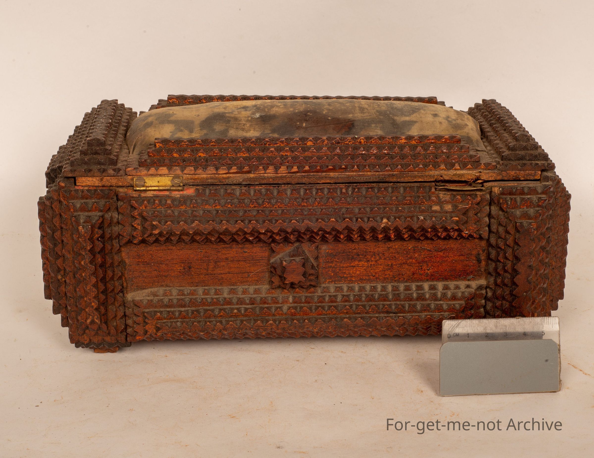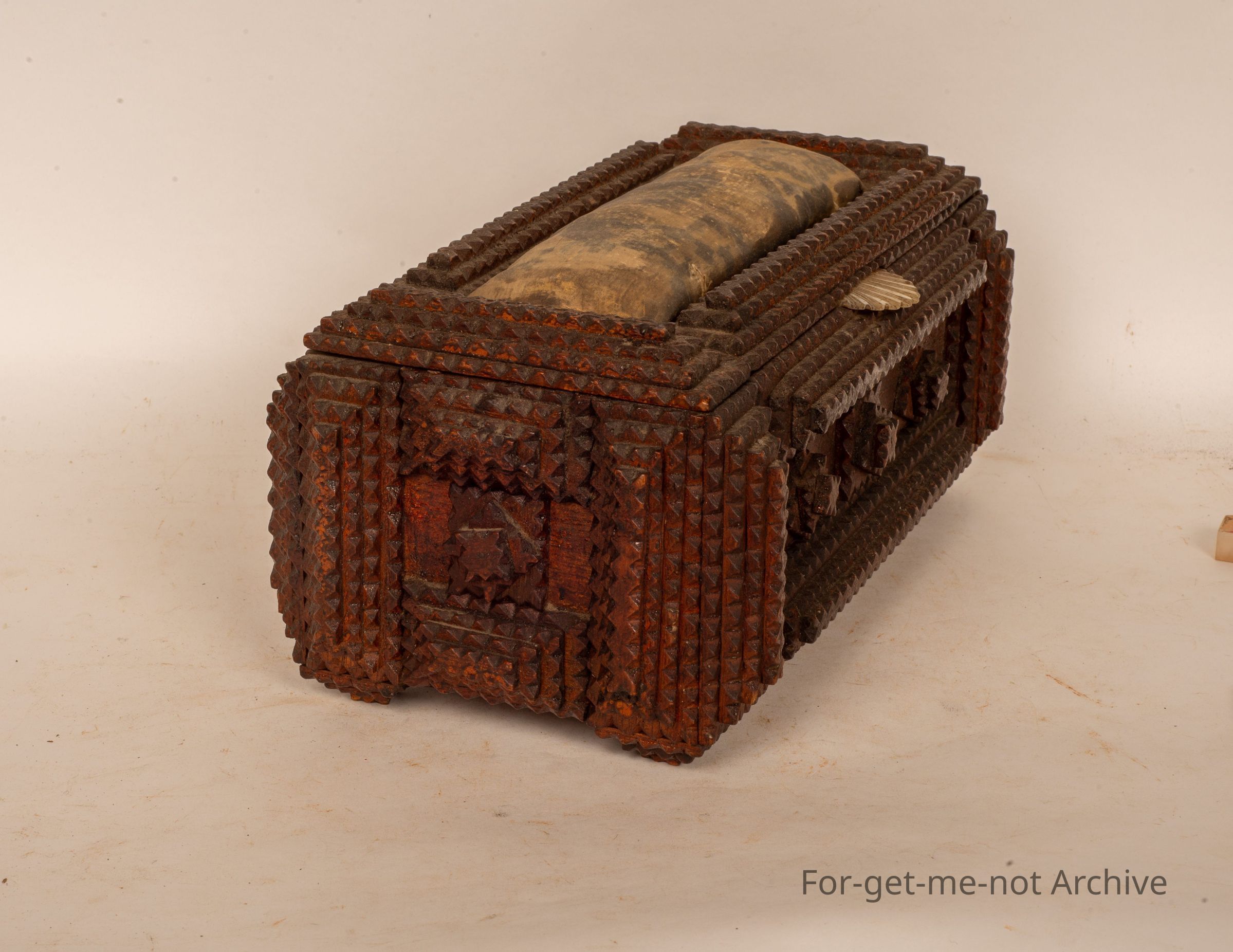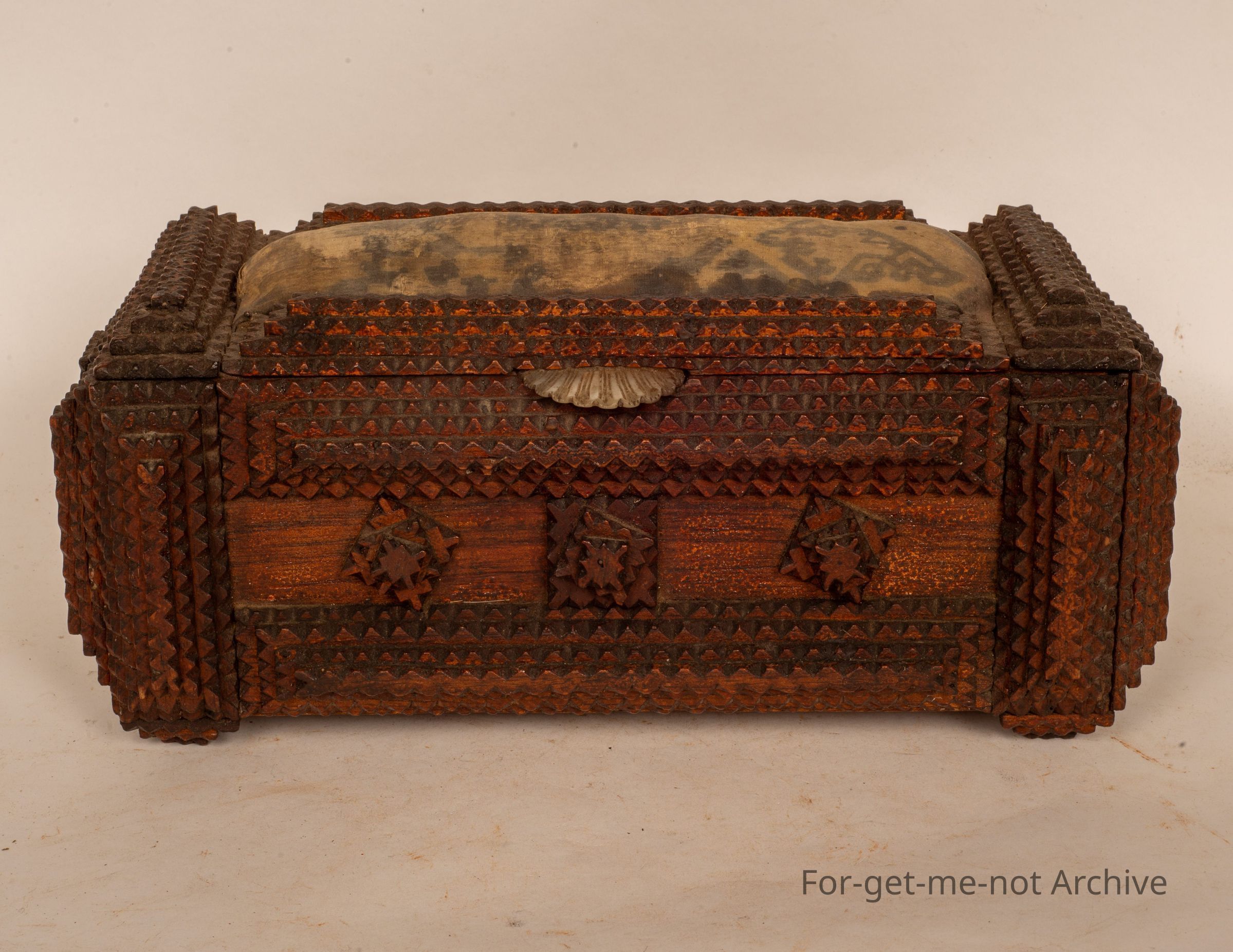 This is like a little sewing box. It's got a pincushion thing on the top, a shell that's been incorporated in for the opening, and a little mirror inside the lid. Very attractive, wonderful little piece.Collection
