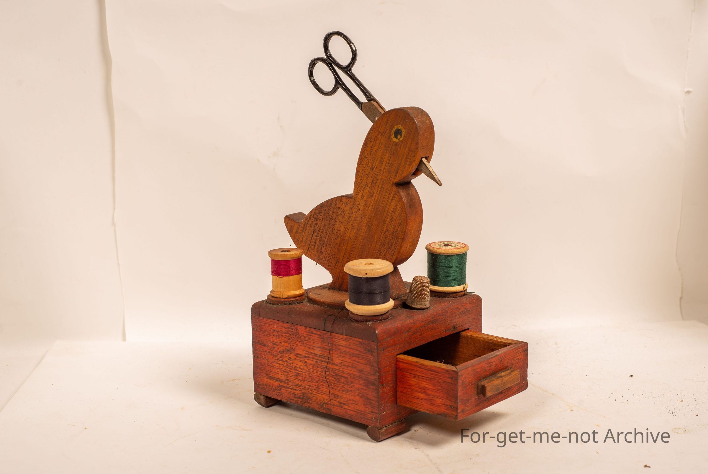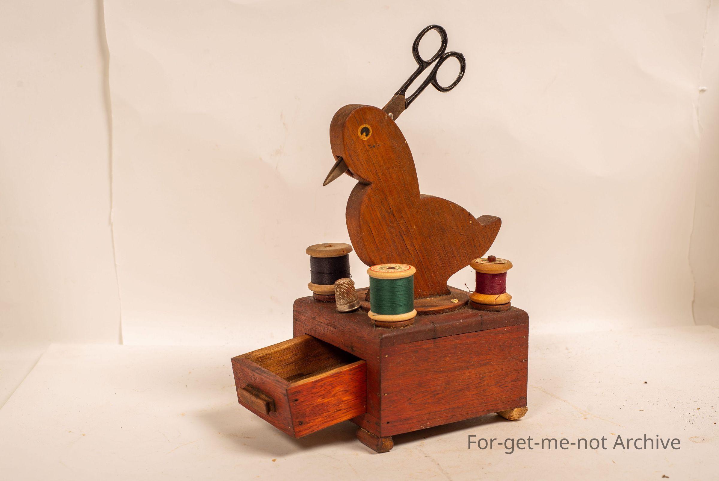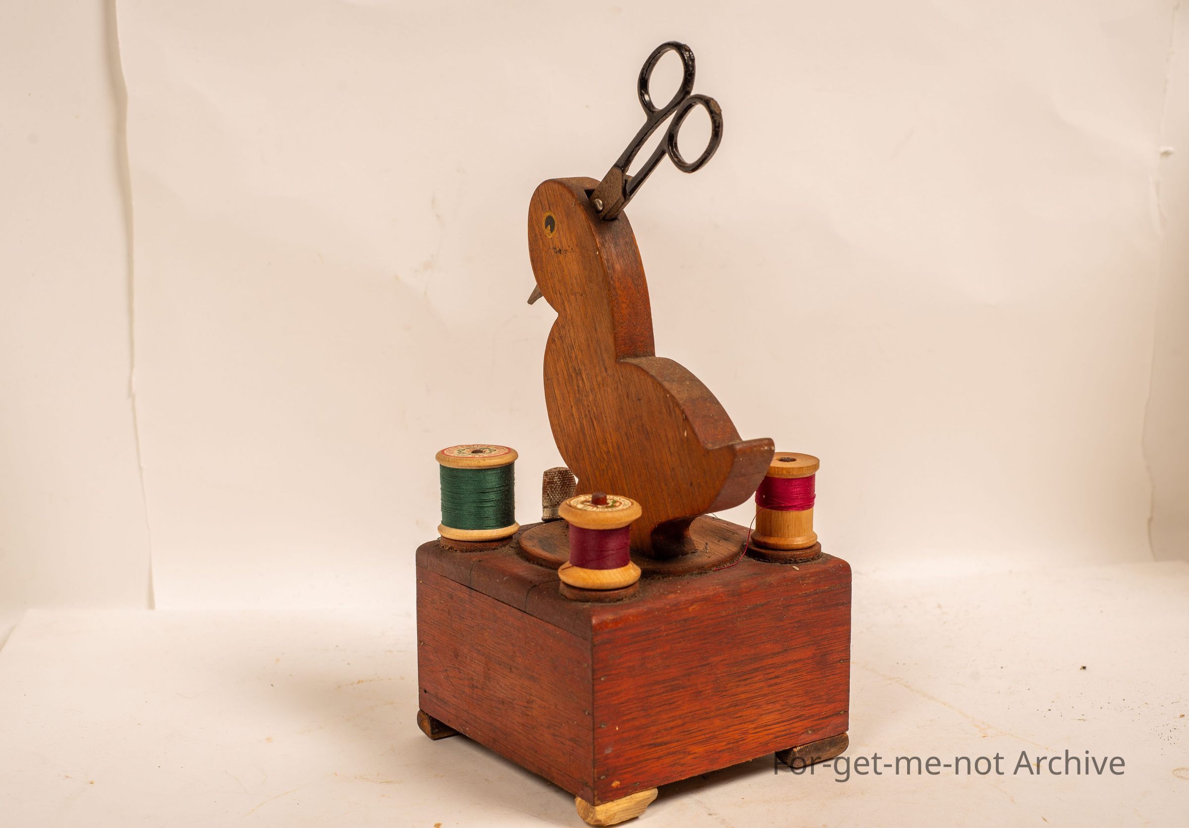 This is a wooden piece that is a sewing piece with cotton reels, scissors, thimble, and a drawer for probably needles. This was purchased from Barbara Howard many years ago. It's a complete setCollection