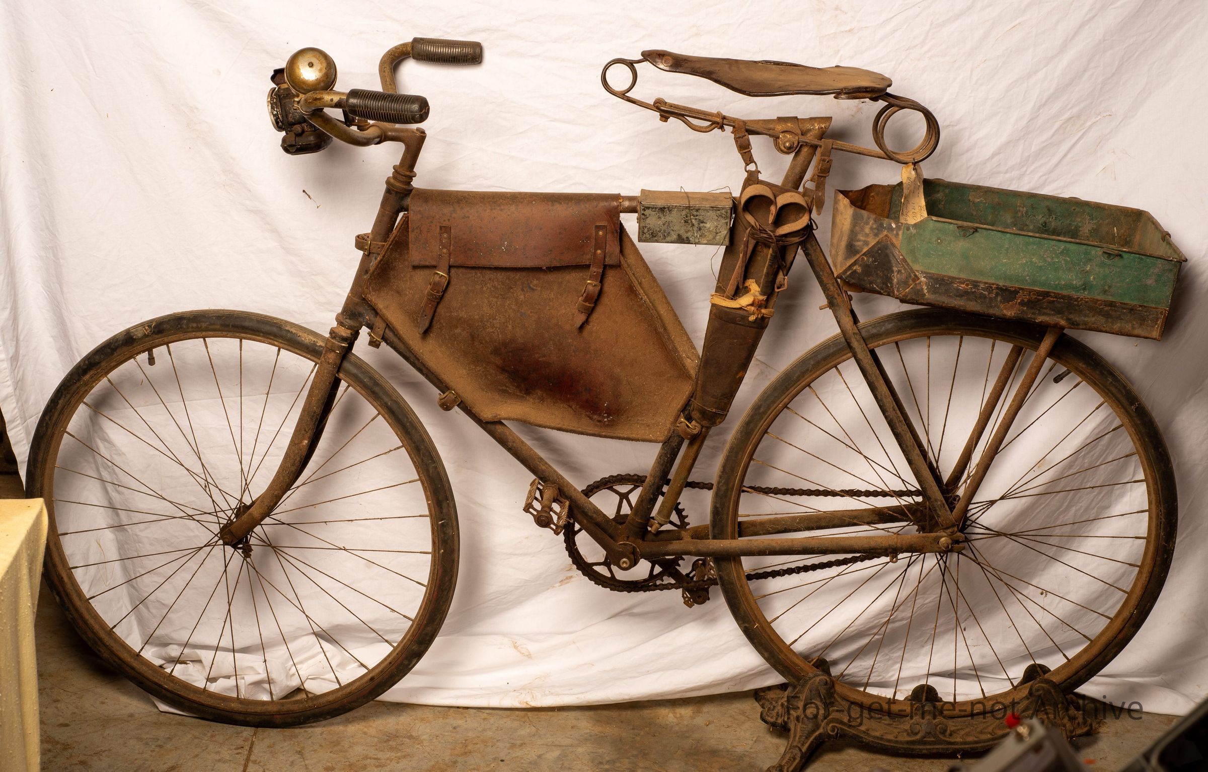 This is a classic Shearer's bike, done it up with a Brook seat made in England specifically for Australian use. A little homemade carry rack on the back, it has the valetace, a leather valetace, strung in the frame of the bike, was commonly used by shearers for putting clothing or anything else in. It would have been fixed wheel, no gears, no brakes. This bike was fitted with the classical thorn proof tires, that resisted the Bindies.Collection