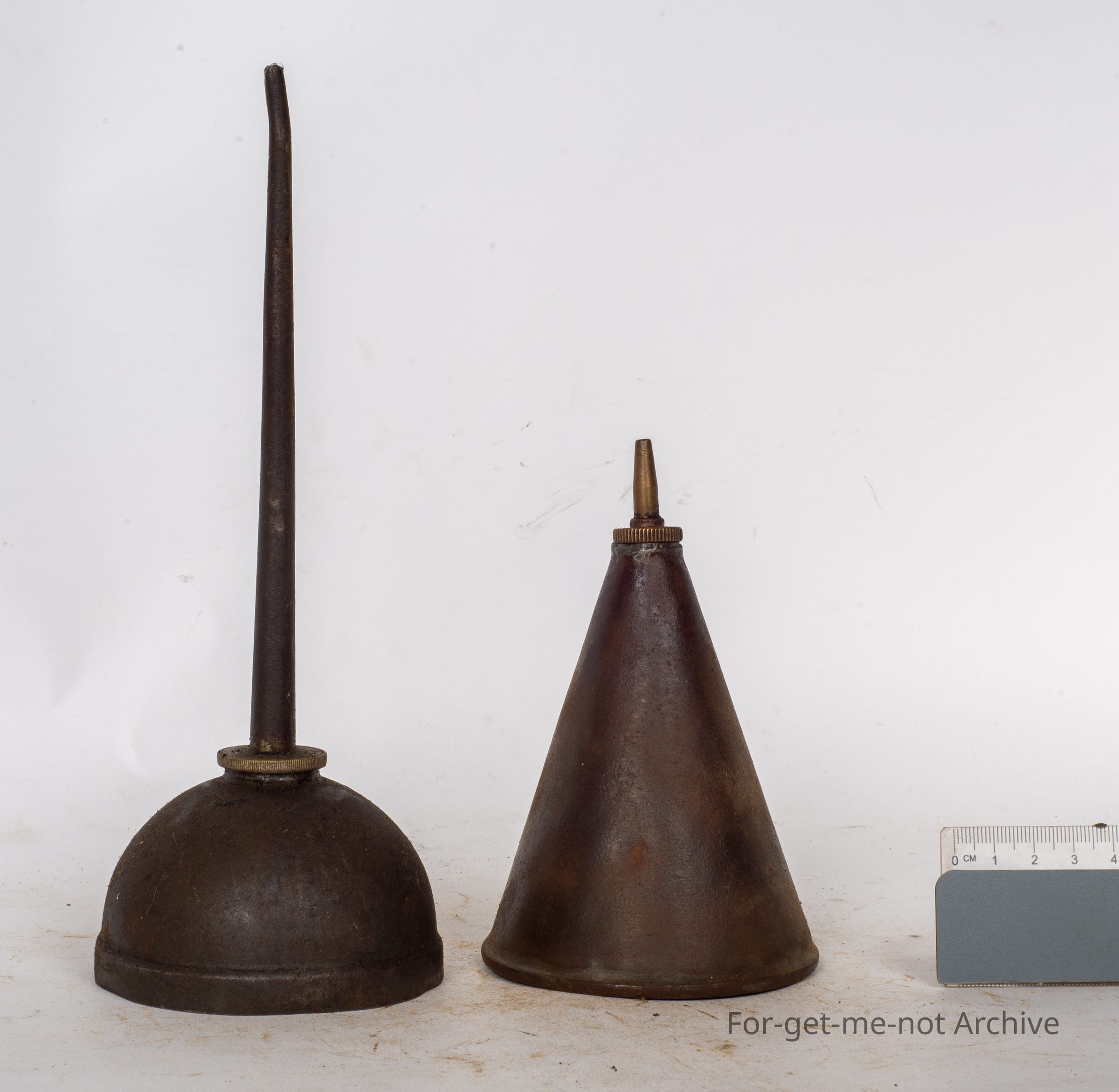 This is a large, like, a shearer's oil can, tin, nothing flash. Second one, a domed tank, quite nicely made, pressure spring on the base, writing around the top that can't be read. Very slender spout.Collection