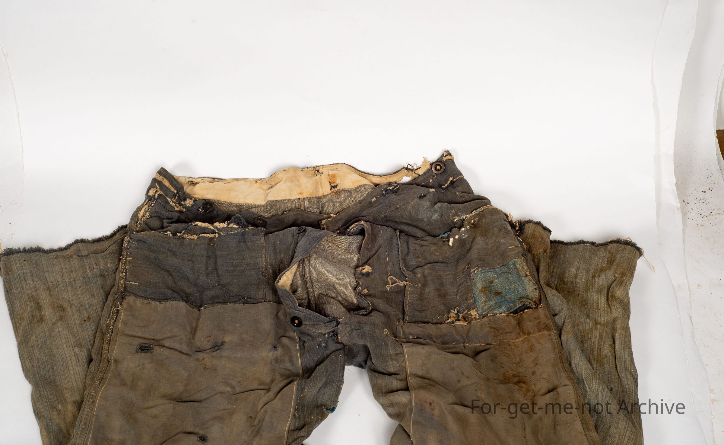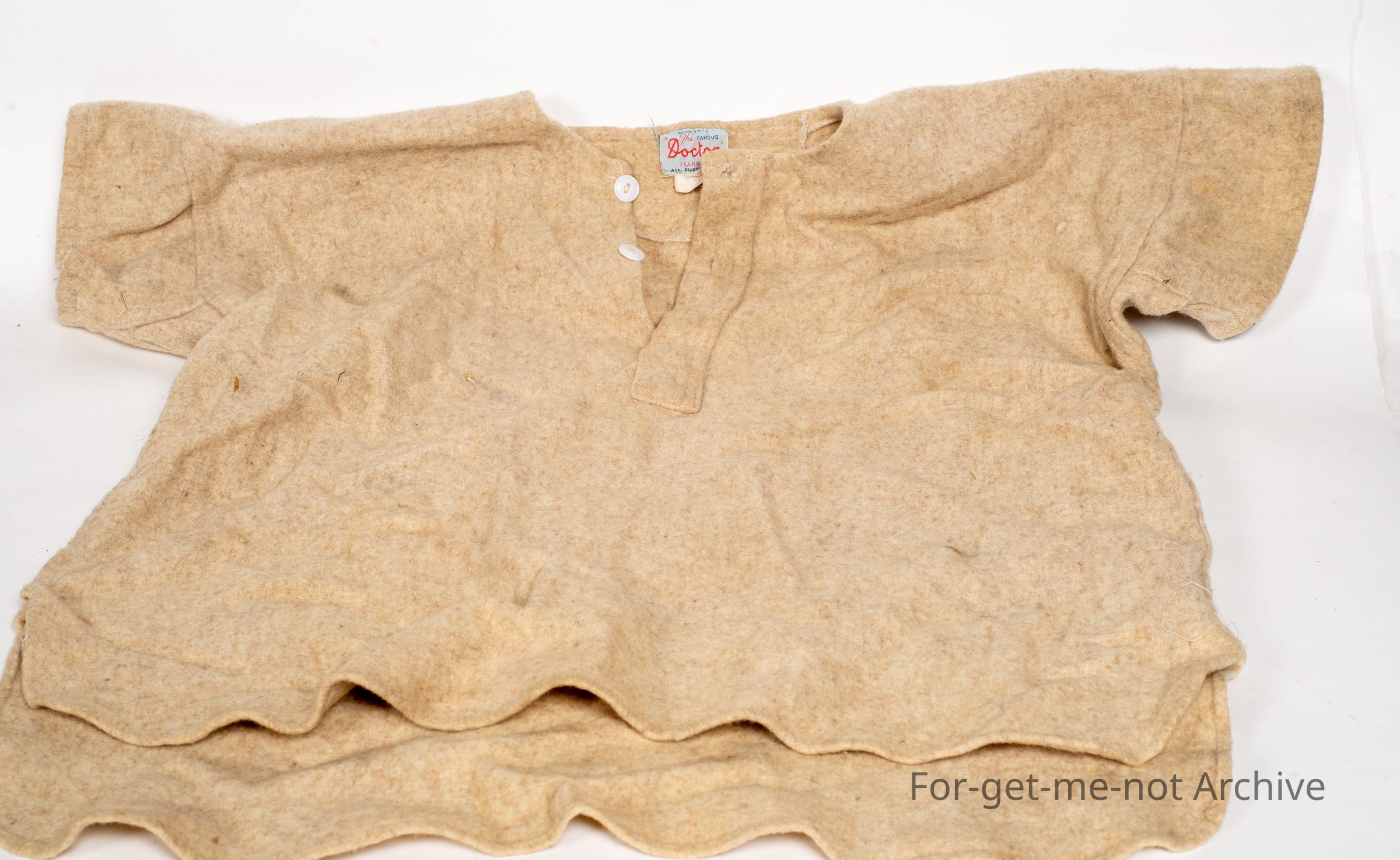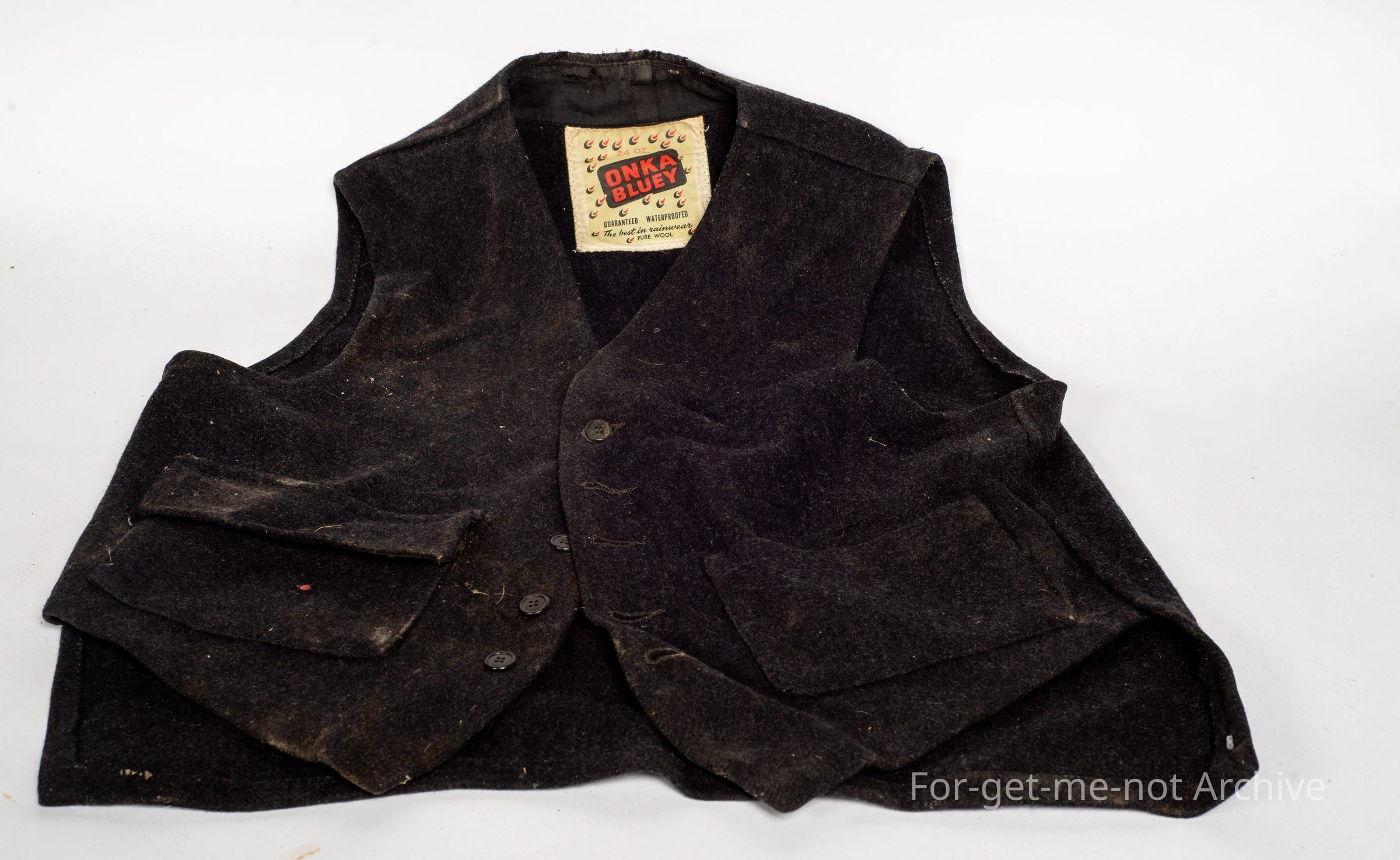 This is a little group of very early shearing clothing, such as doctor's flannels, a pair of Charlie Frances', shearing trousers, an Anka Bliley vest, pure wool. They're probably from Anka Paringa. Guaranteed waterproof.Collection