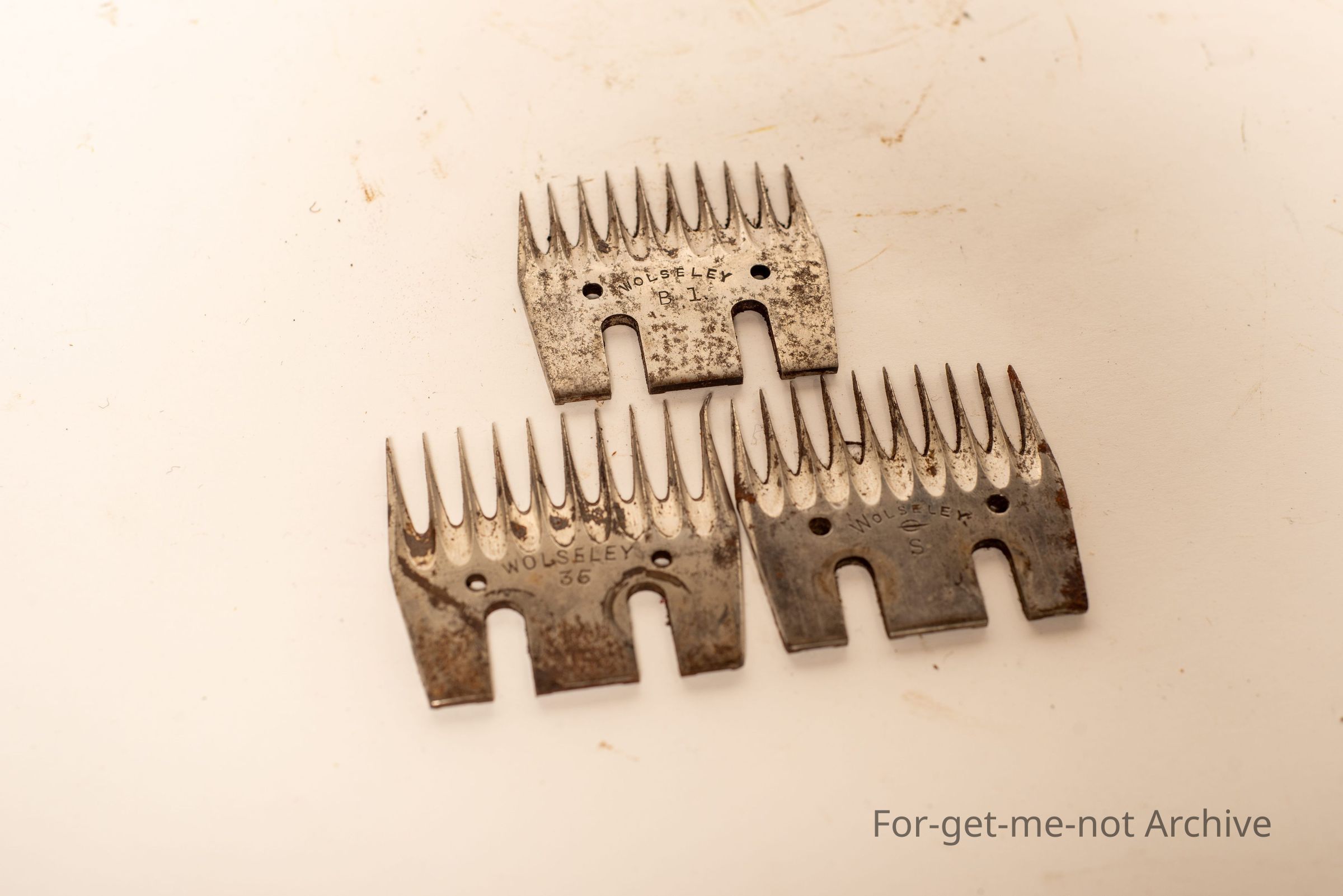 A group of 3 Wolseley Shearing Combs, stamped B1, S and 35. These 3 combs are in unused condition. Very hard to find.