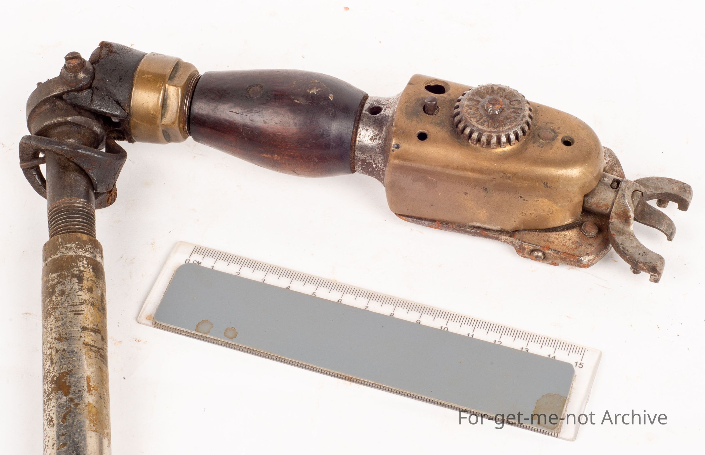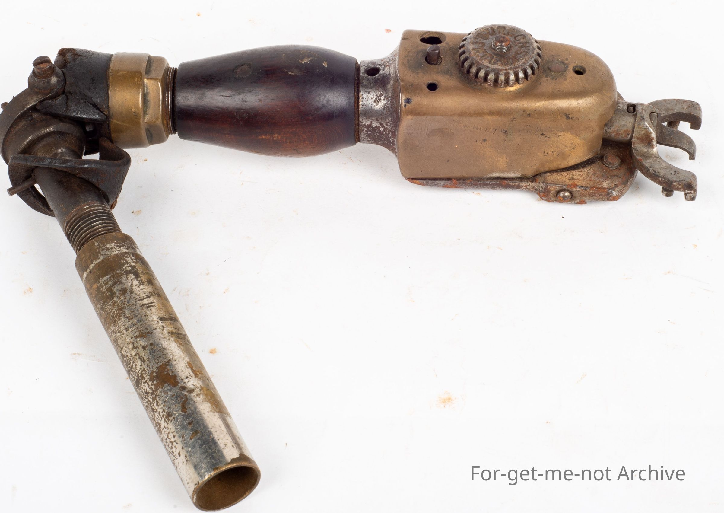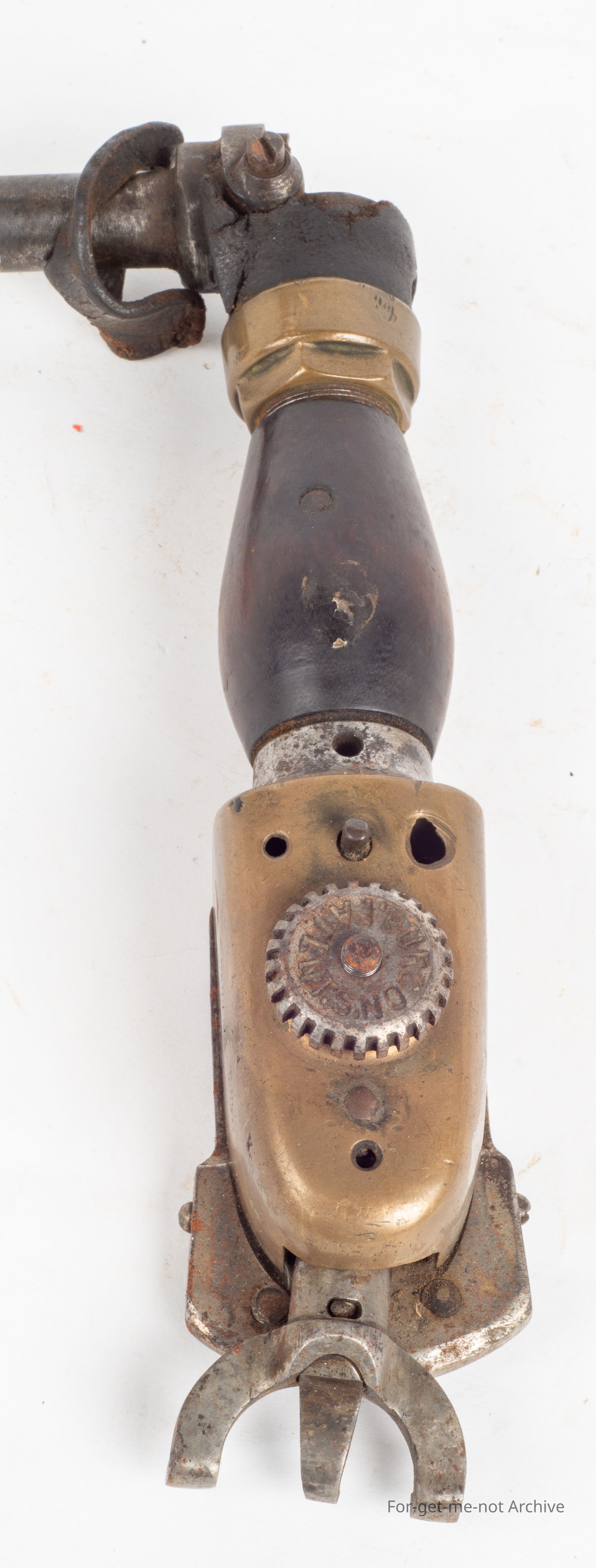 A Burgon. This one is featured by having a wooden hand grip, a brass body that would have originally been nickel plated. This is in very complete condition. Another feature of these early Burgon’s is the nine tooth cog in the back end.