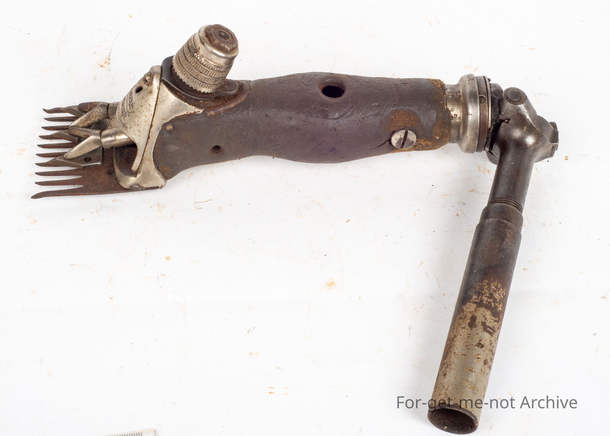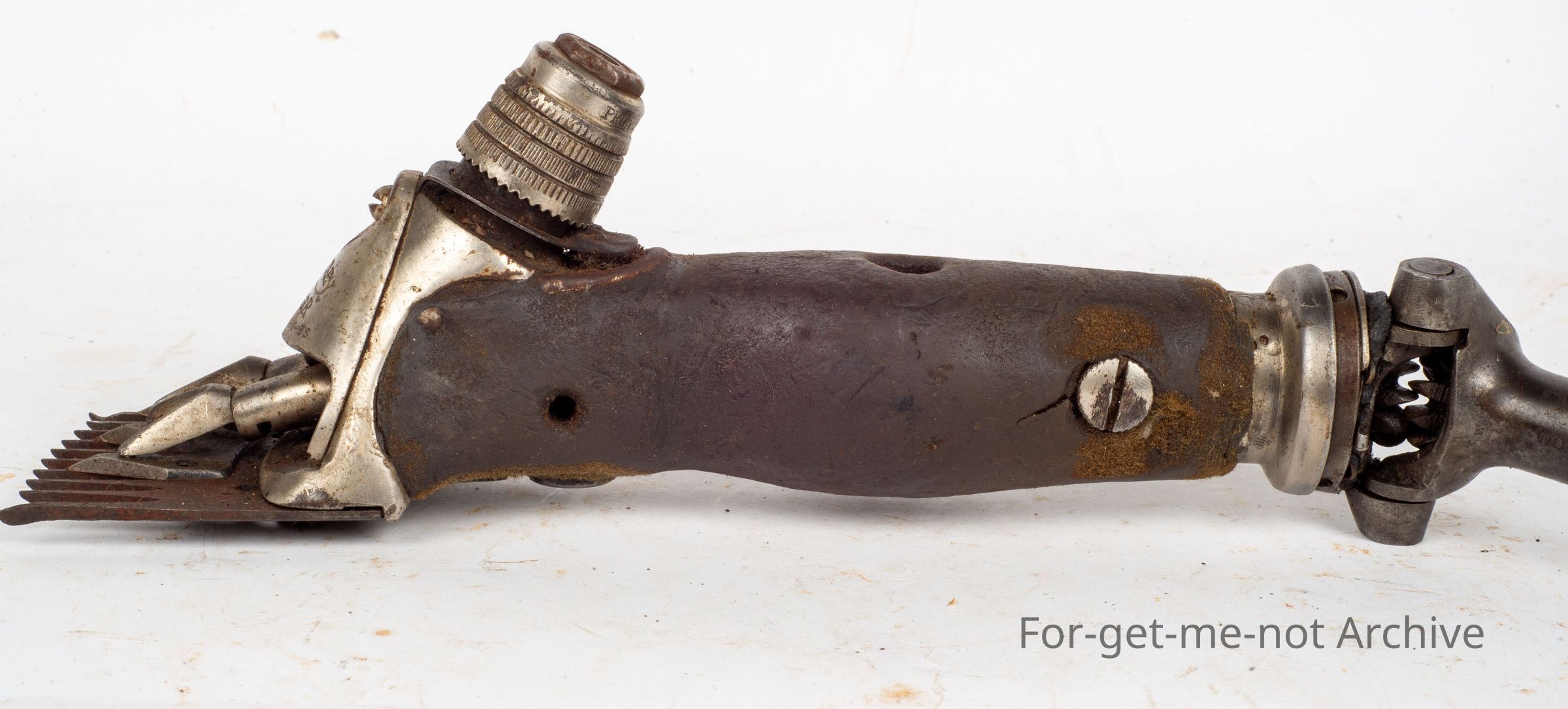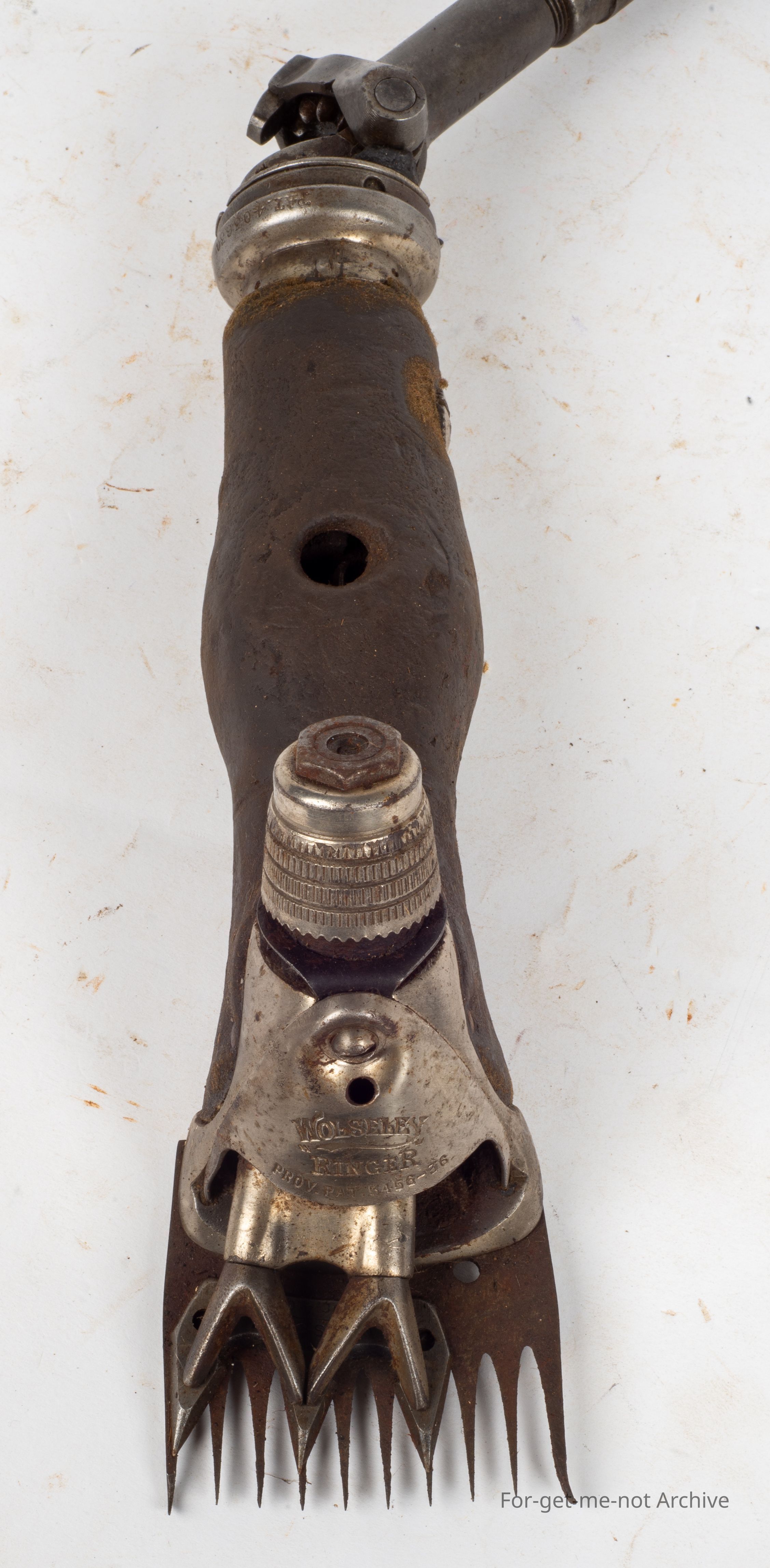 A Wolseley Ringer, intact with its front cover plate which is a very attractive piece to keep the wool and grit from getting into the moving parts at the front of the handpiece. 1936, The cover was usually the first piece removed and lost by the shearers