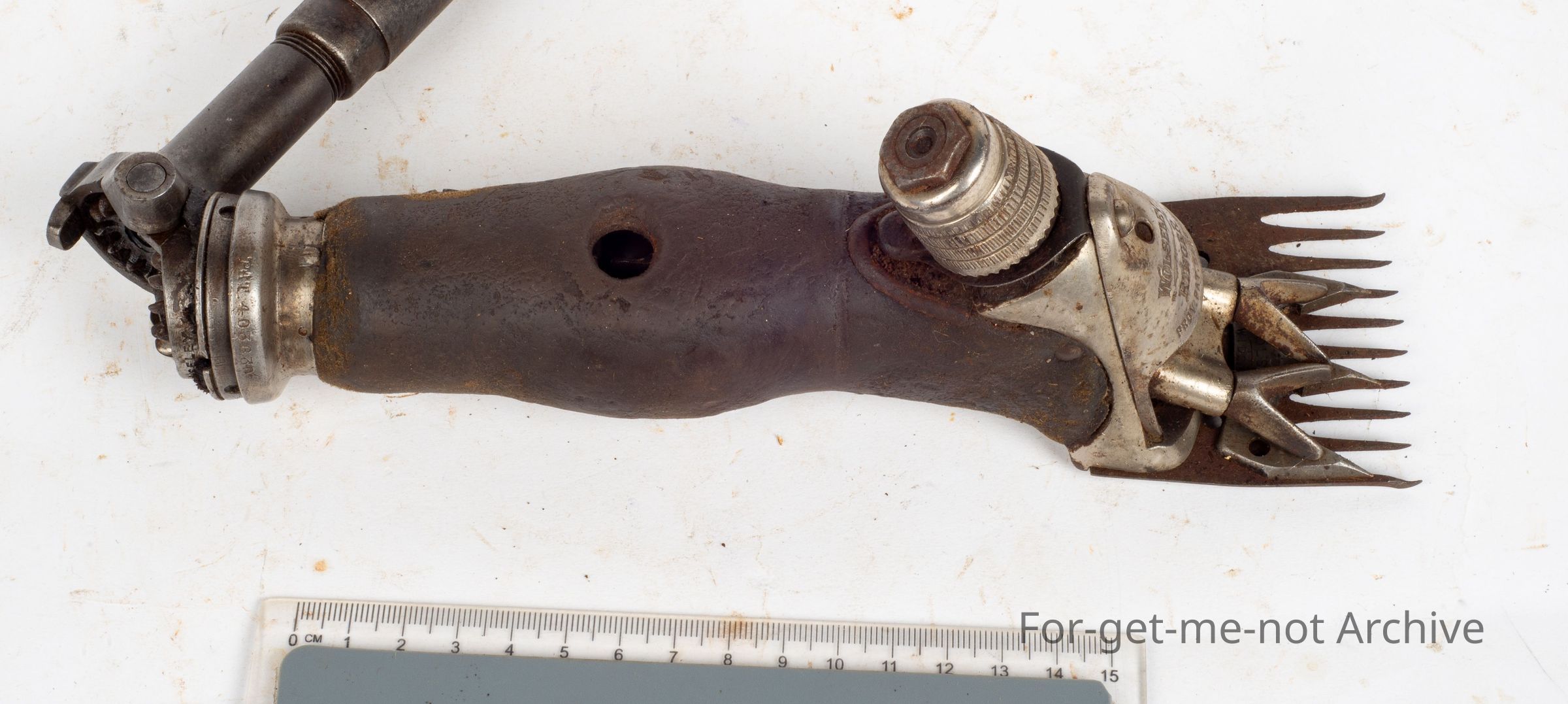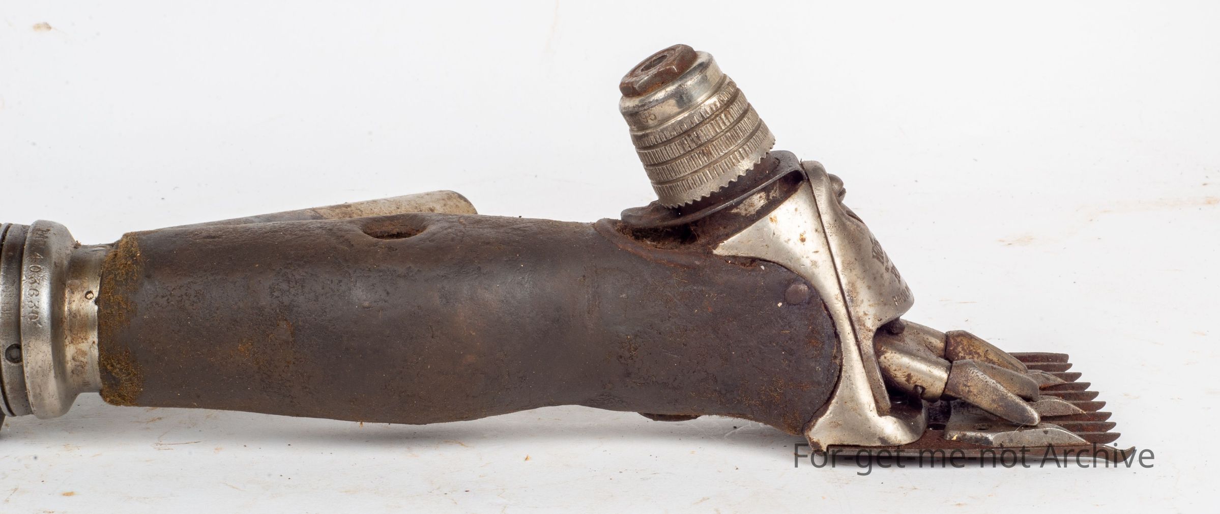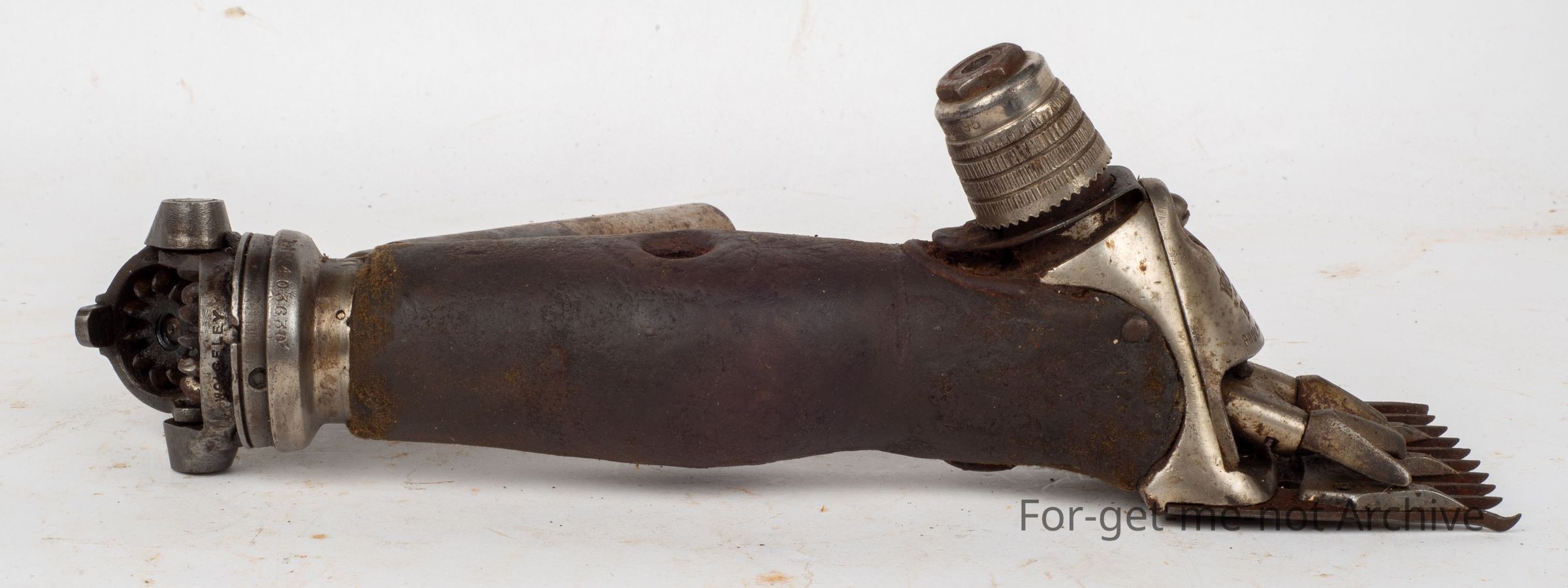 A Wolseley Ringer, intact with its front cover plate which is a very attractive piece to keep the wool and grit from getting into the moving parts at the front of the handpiece. 1936, The cover was usually the first piece removed and lost by the shearers