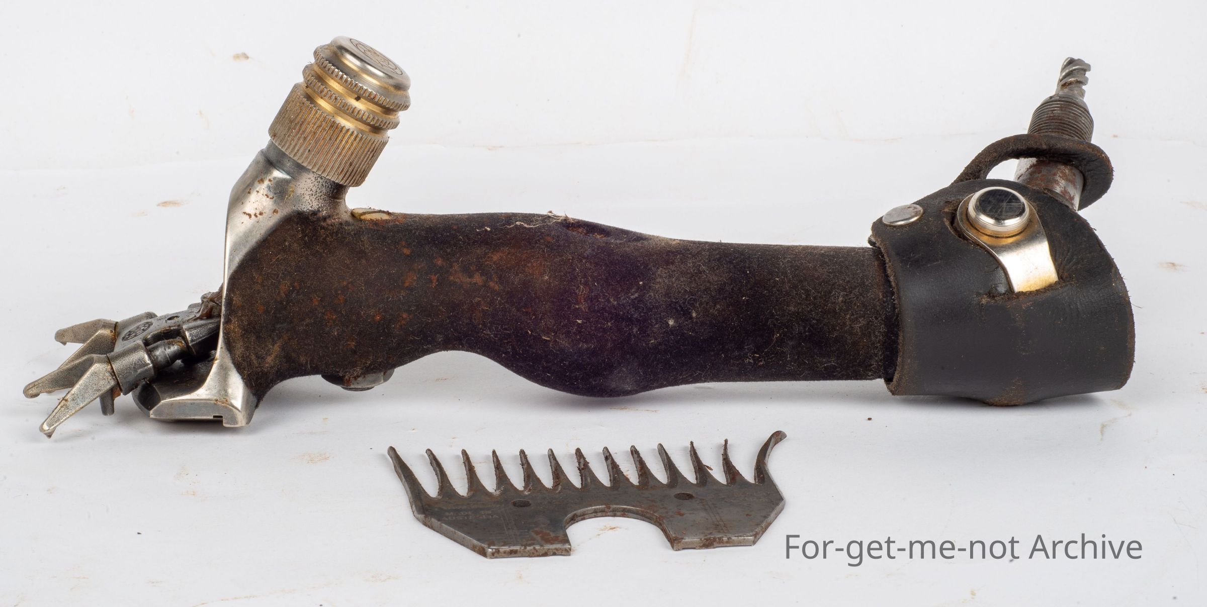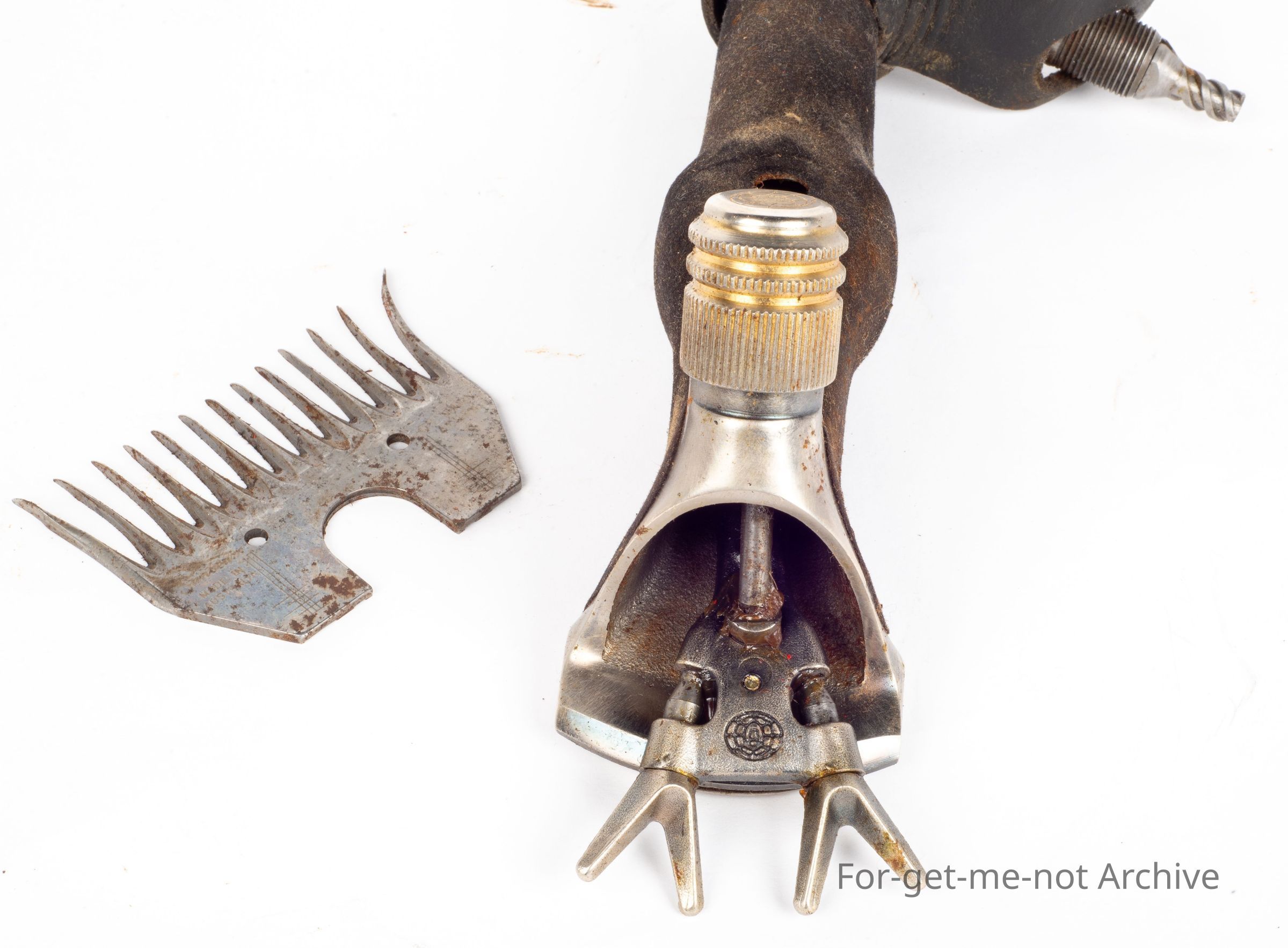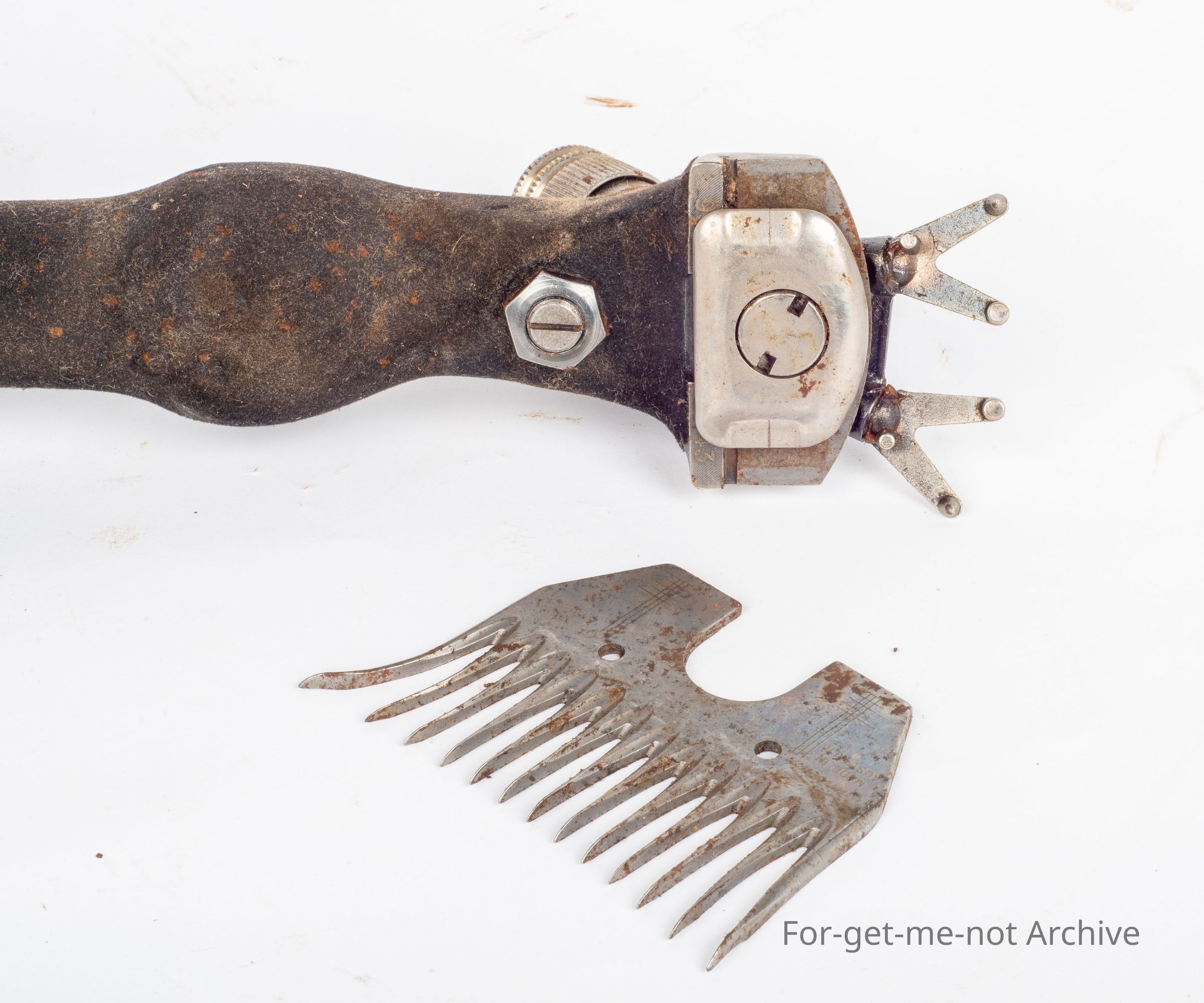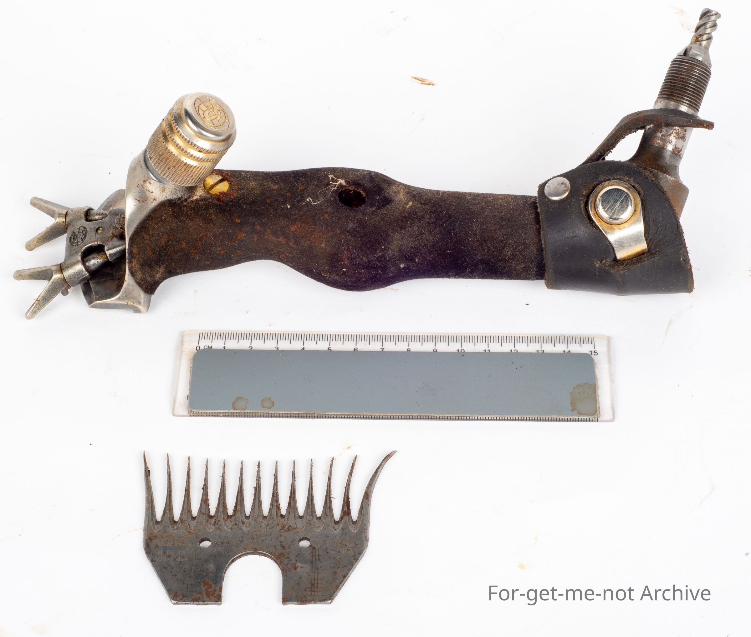 This is the Akura handpiece made by Sunbeam. The feature of this was to do away with the two comb screws and only have one, which meant a whole new production of combs to fit. The idea was from Dale McIntyre. However, the change wasn't successful and didn't last very long. This is an unused model still with grease on it in its box with a comb.