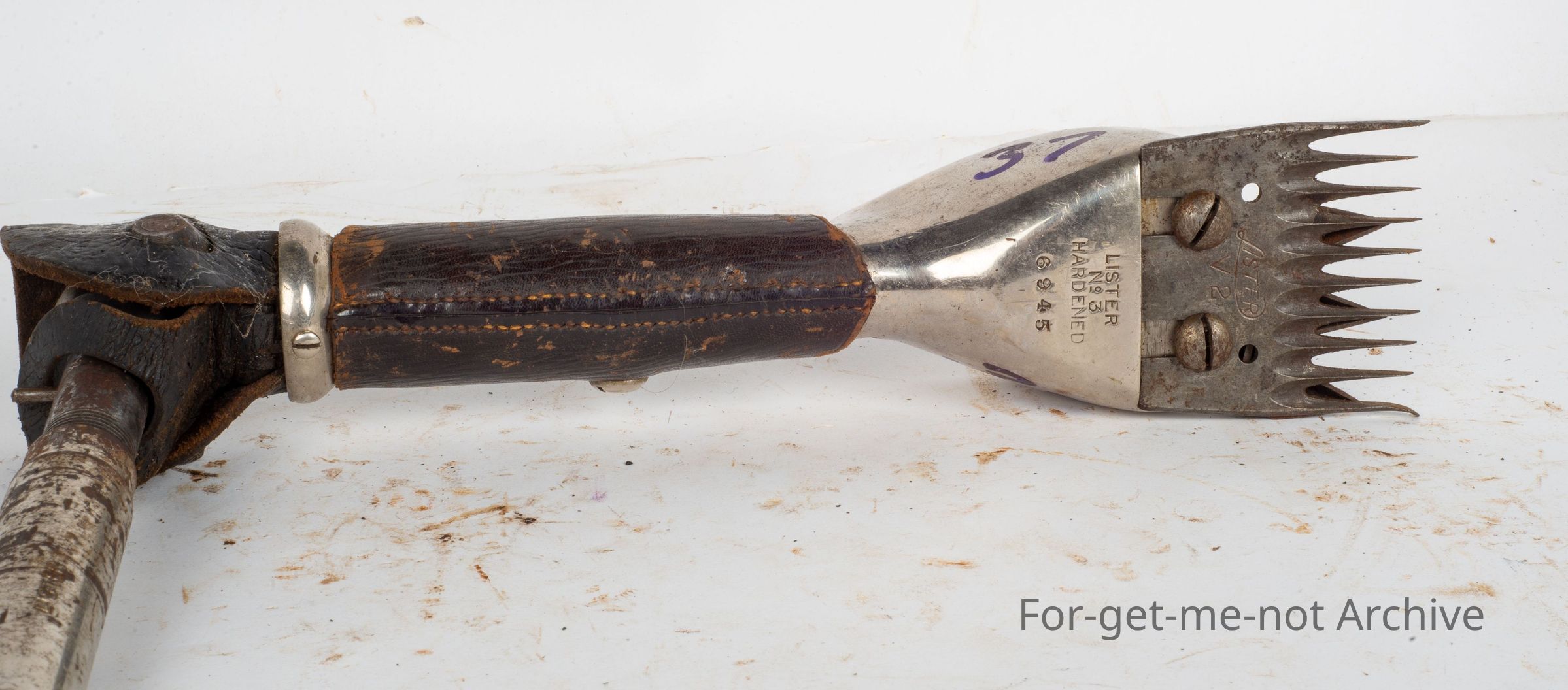 Lister No.3 hardened. Serial Number 6945. This is in beautiful condition with a leather hand grip and glorious knurling on the tension nut. Might have been used as a display handpiece somewhere