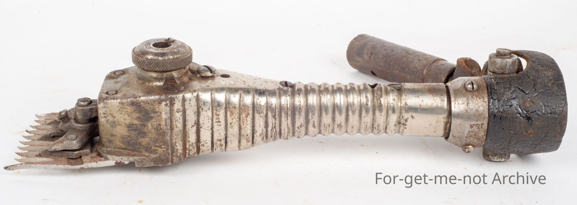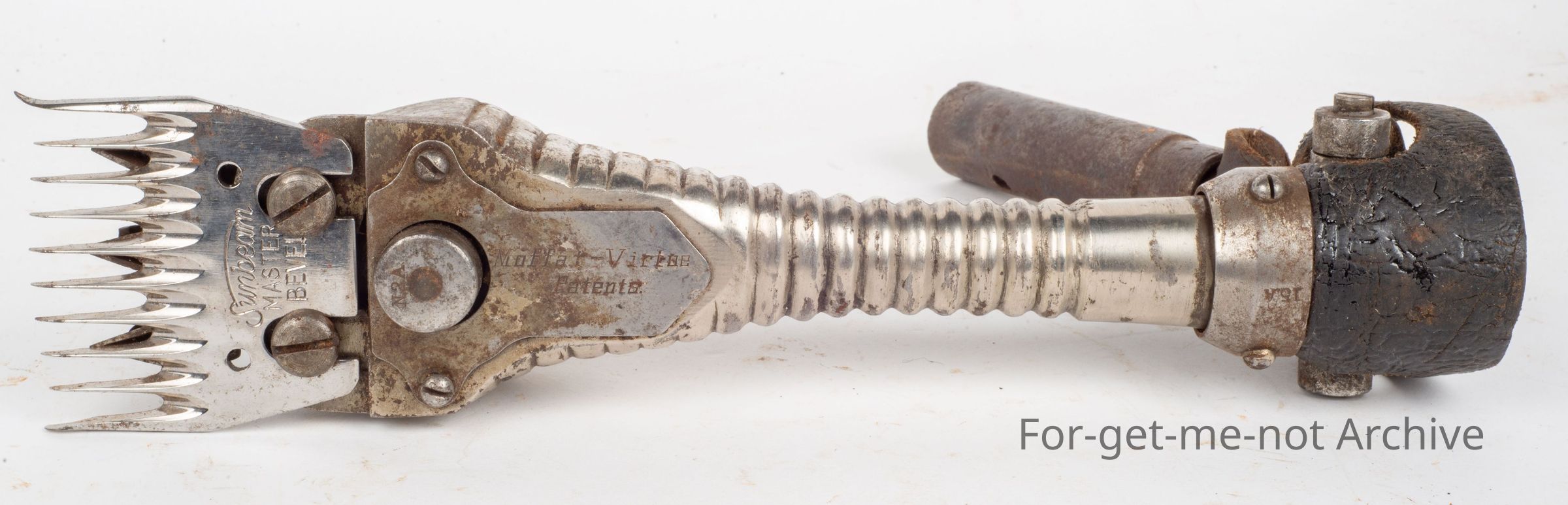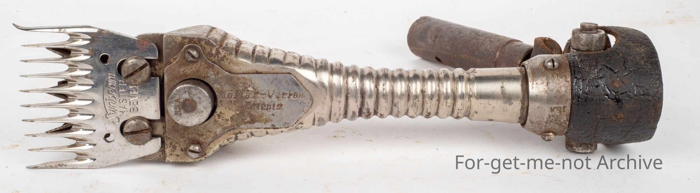 The ribbed body Moffett Virtue in beautiful condition, an Australian handpiece. Moffett and Virtue were from Queensland. Moffett provided the money. Virtue was the engineer. The origin of the manufacturer is unknown at this stage where they were made, possibly in Australia.