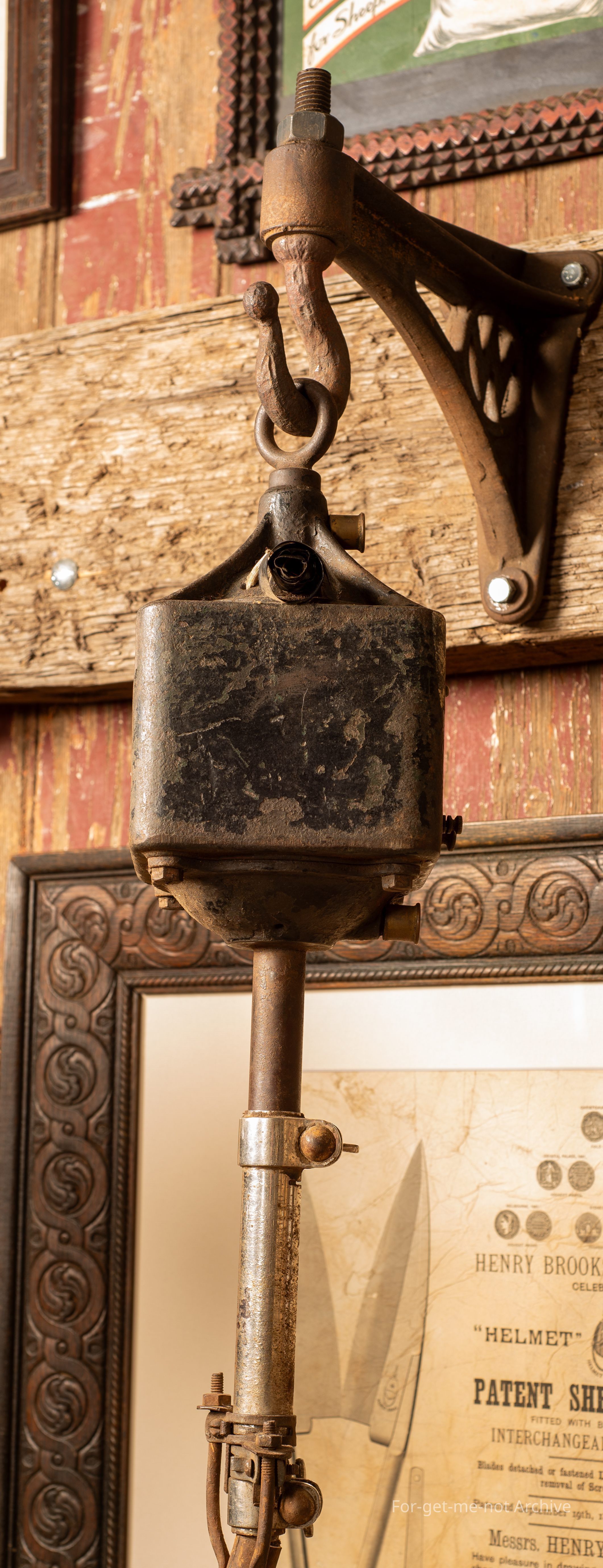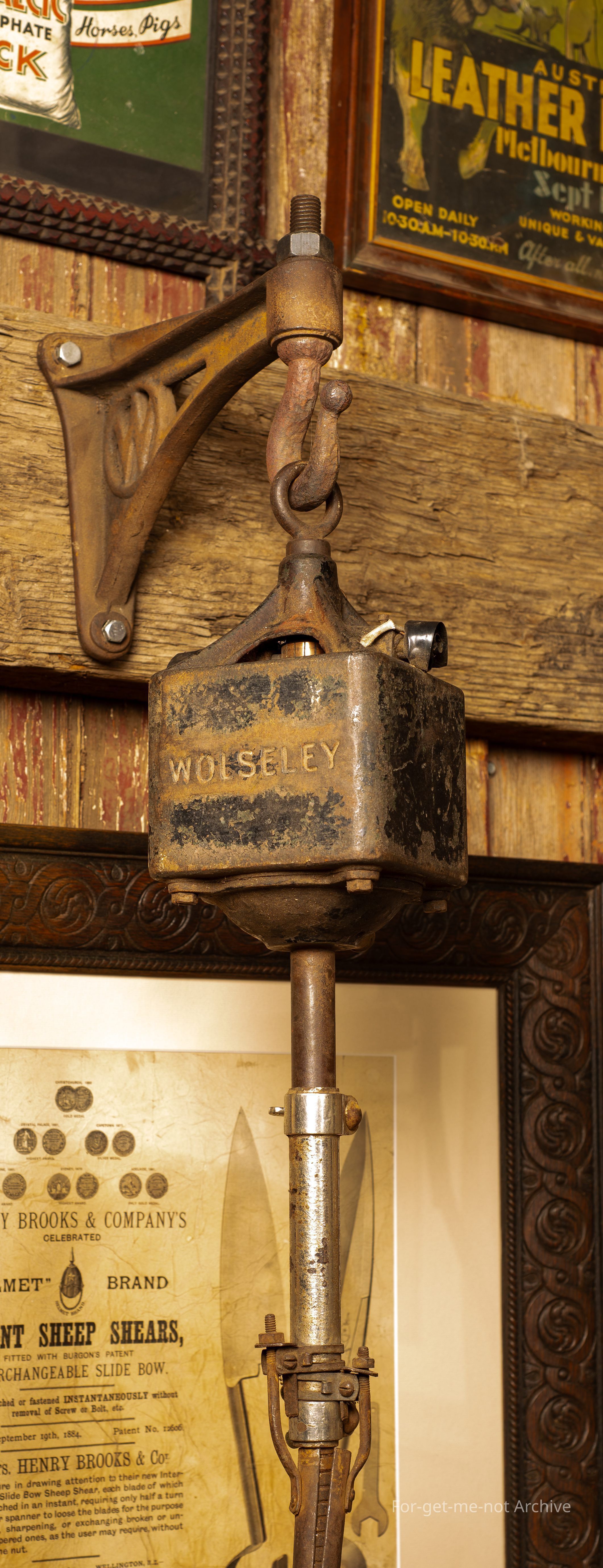 Shearing equipment, mechanical. This is the first, single electric shearing plant that was produced by Fred Wolseley. These were made in a square case. At the time they didn't realize that the air didn't circulate in a square case adequately and they overheated. These were only made for 1 x 12 month period in around about 1907. Because of that, they're very hard to find.Collection