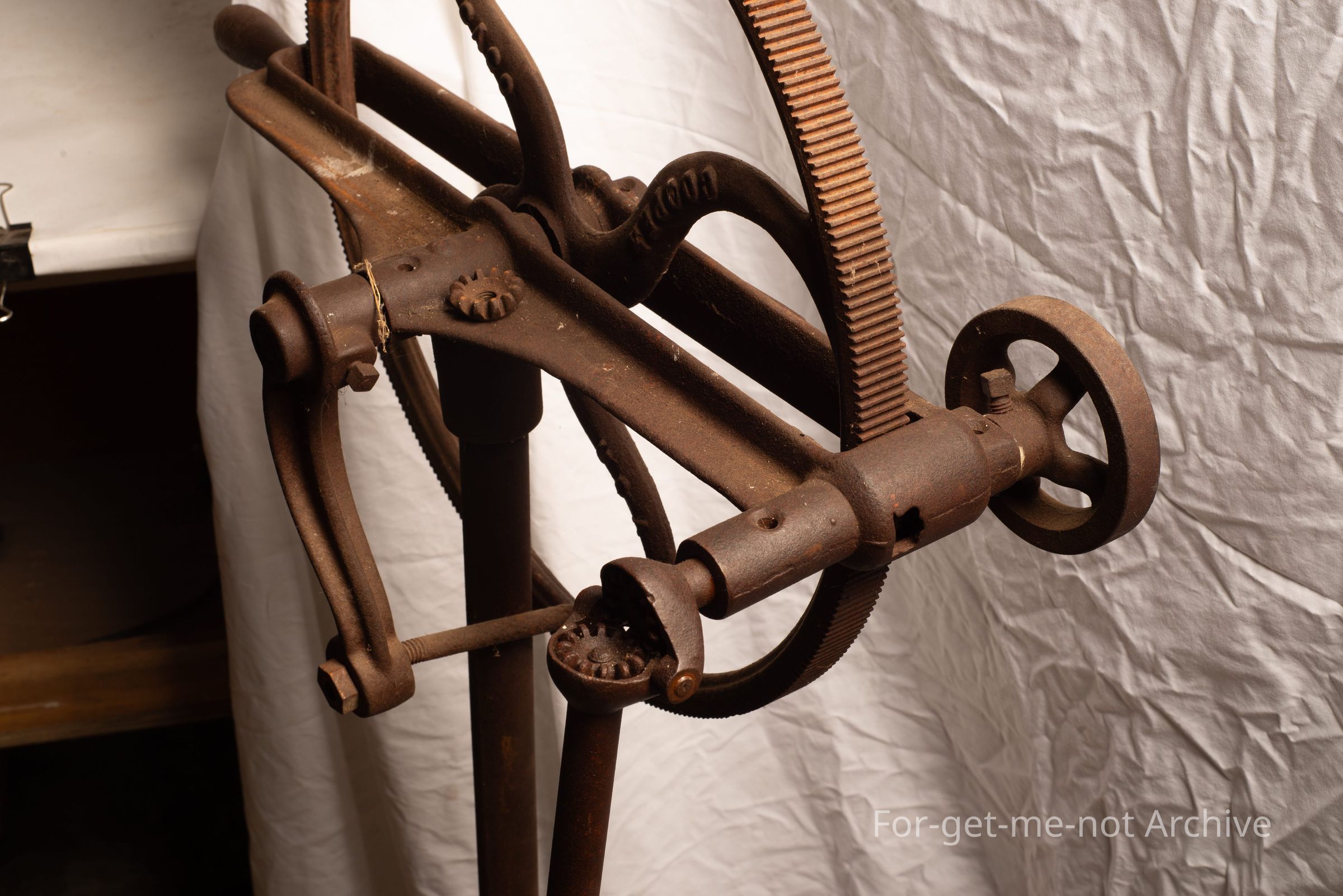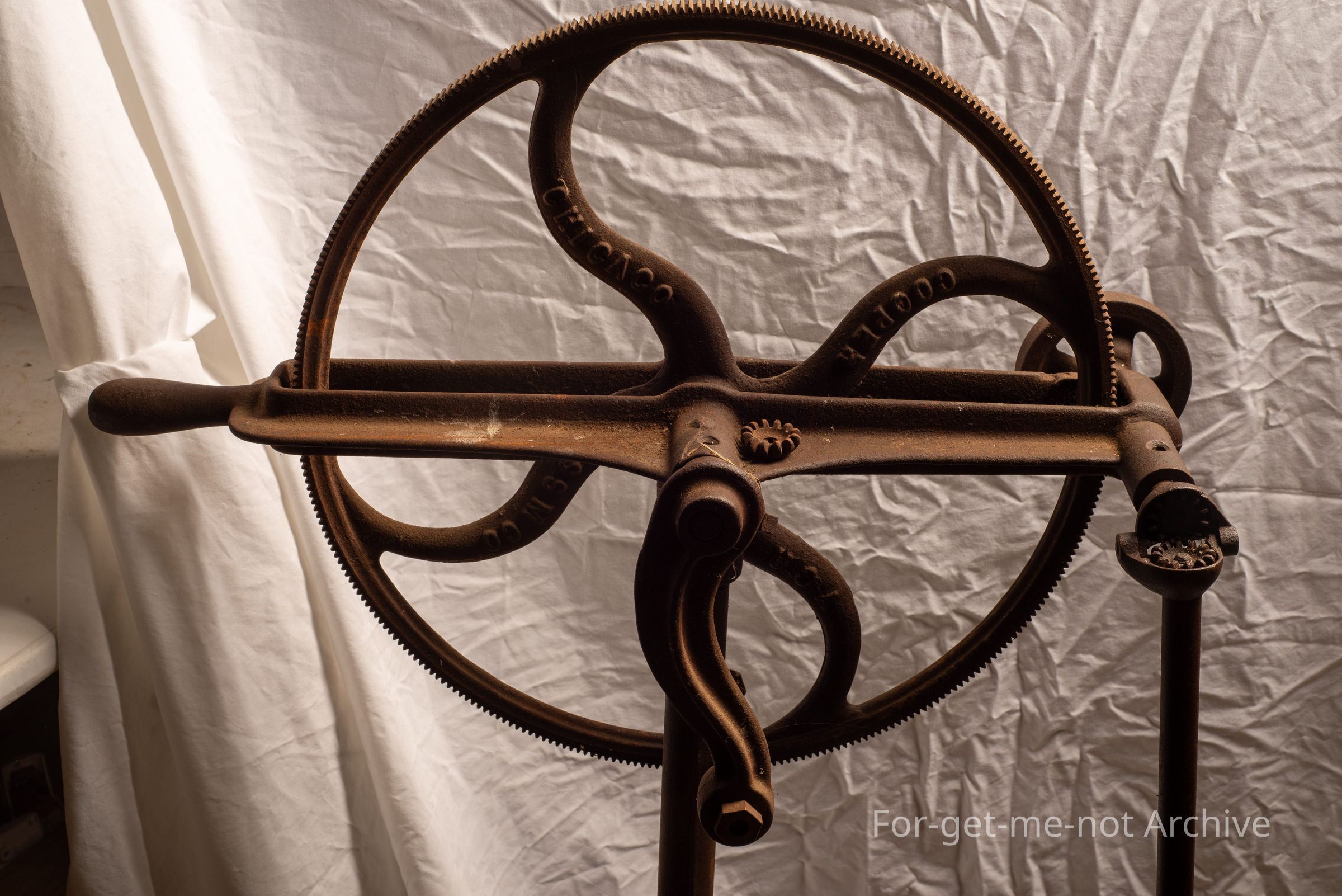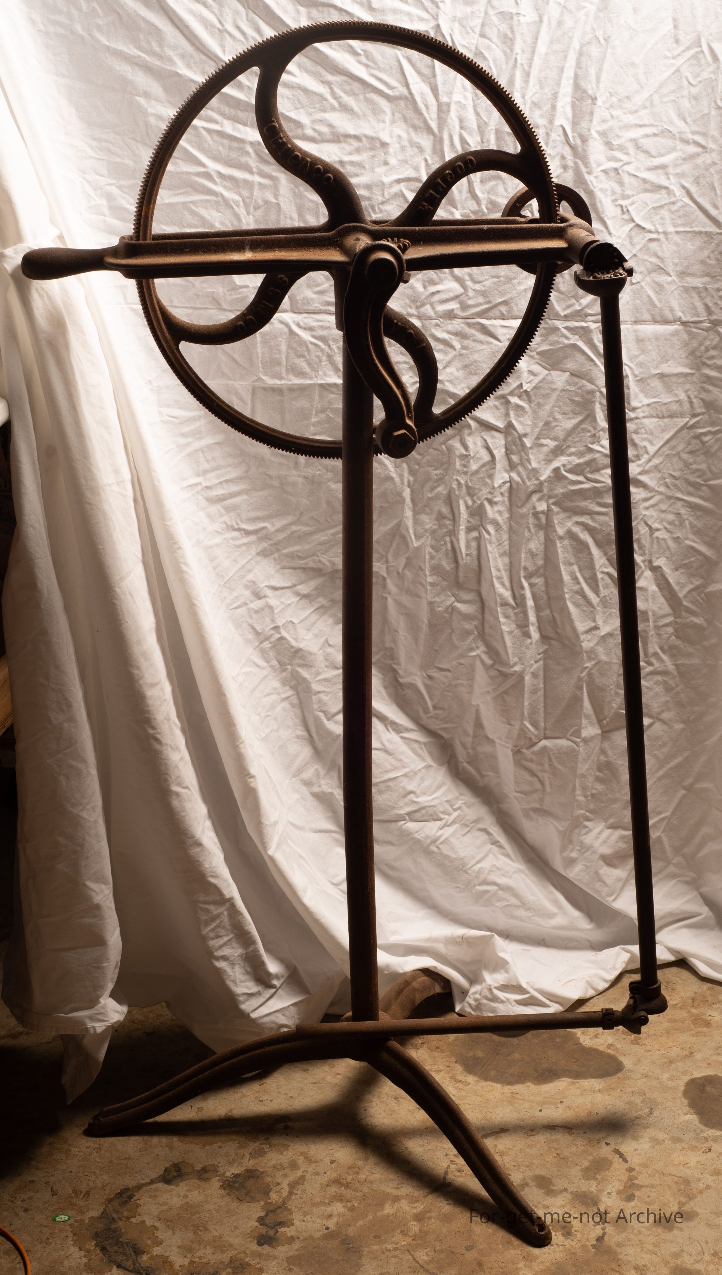 This is a portable, cast iron, hand operated, shearing plant known as a husband and wife. The rule was that the woman turned the handle and the bloke shore the sheep. These were for small flock owners, not long after the advent of mechanical shearing. This one is Chicago Flexible DriveCollection