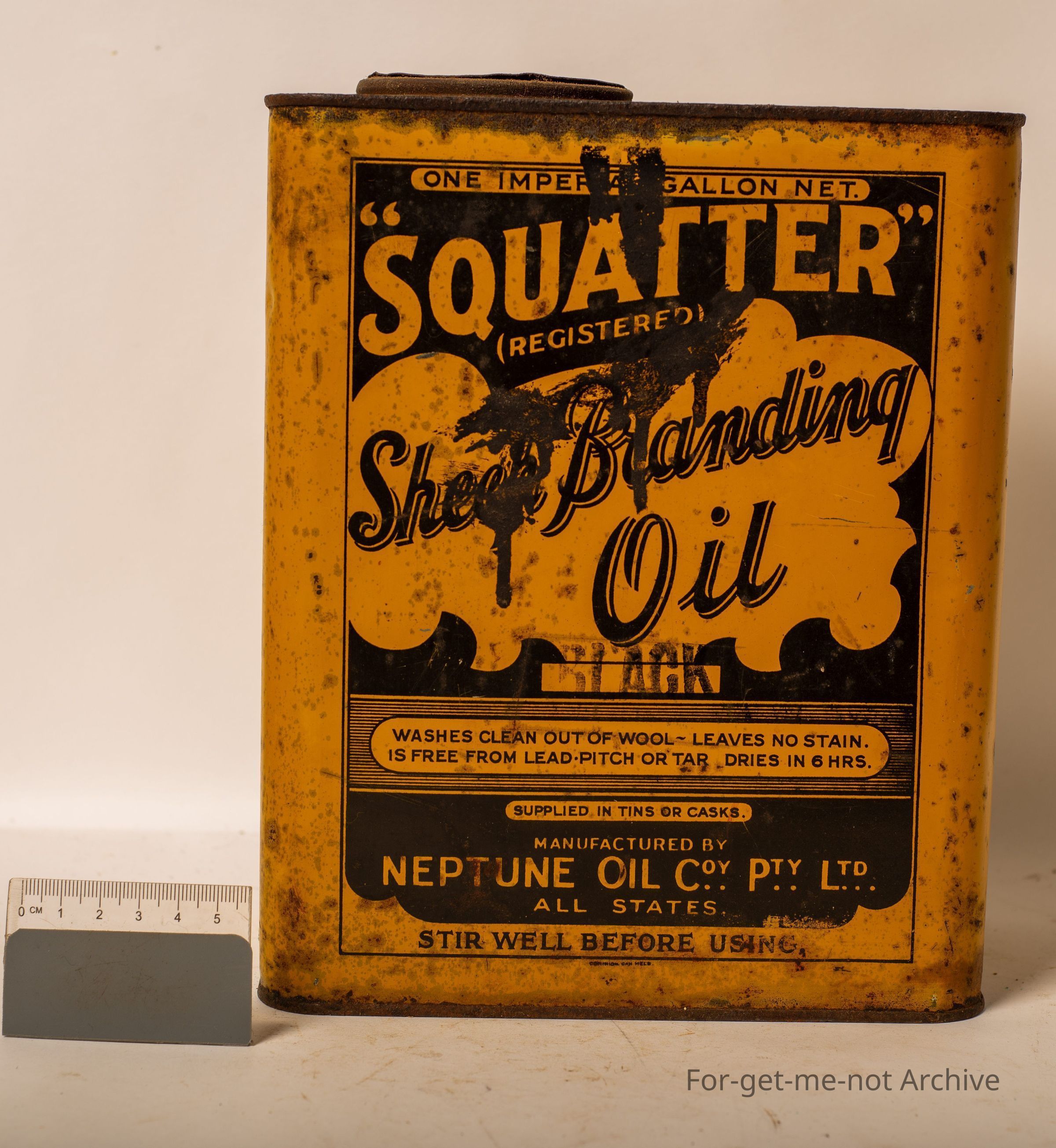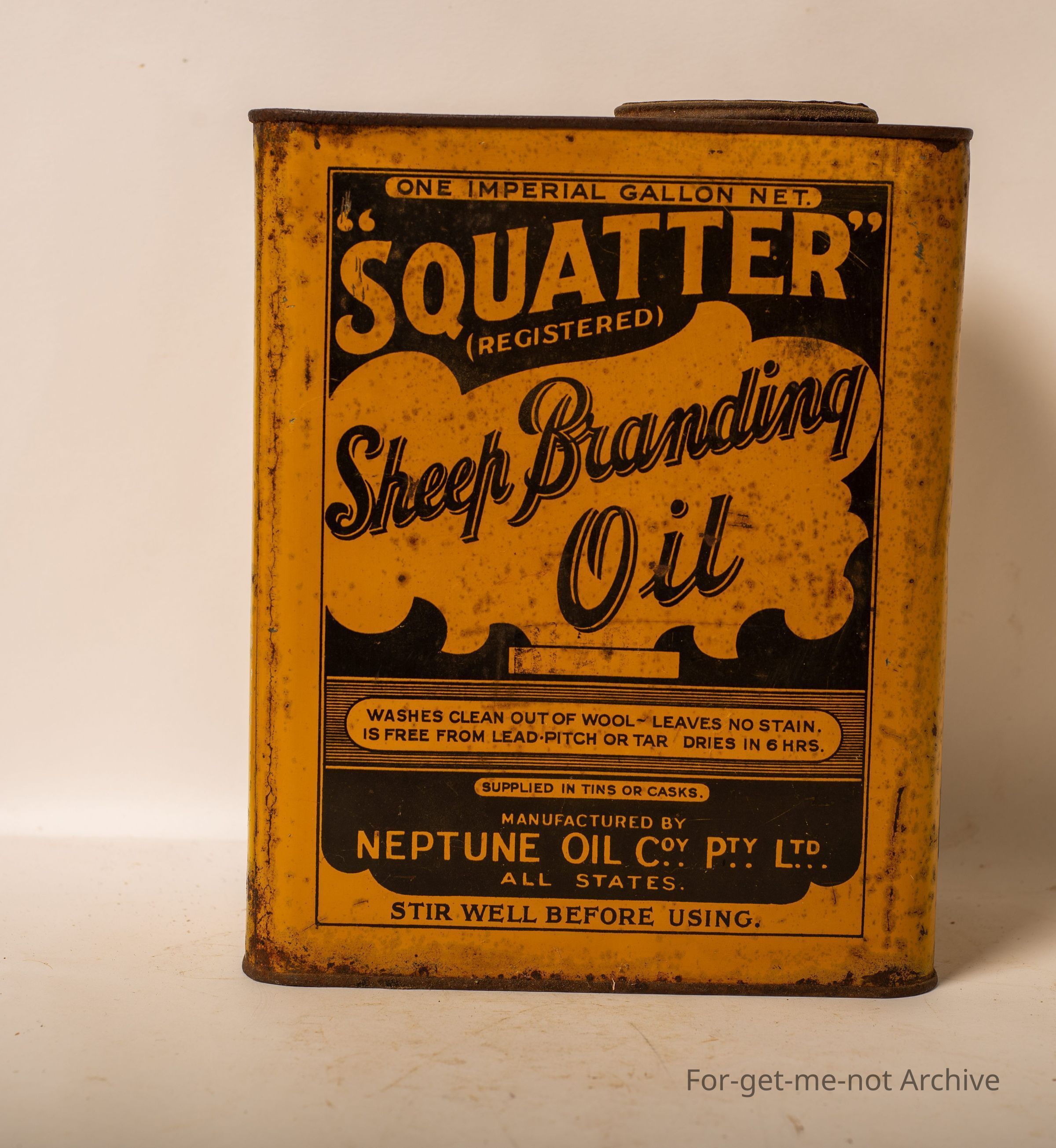 One imperial gallon of Squatter sheep branding oil manufactured by Neptune Oil Company All States. This tin is in remarkable order. Both sides,