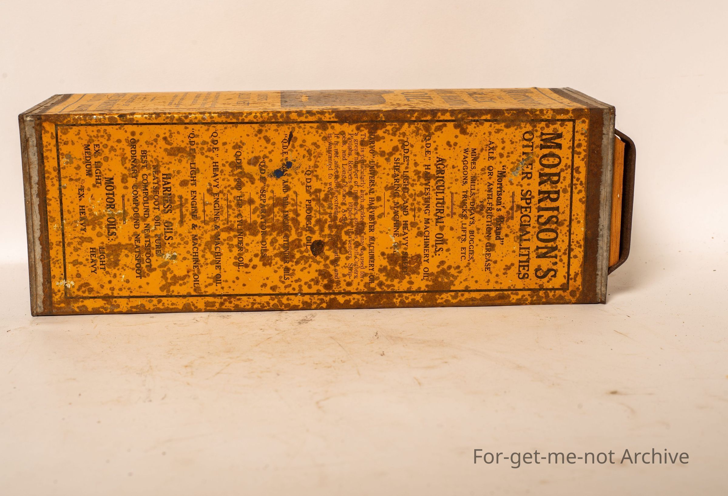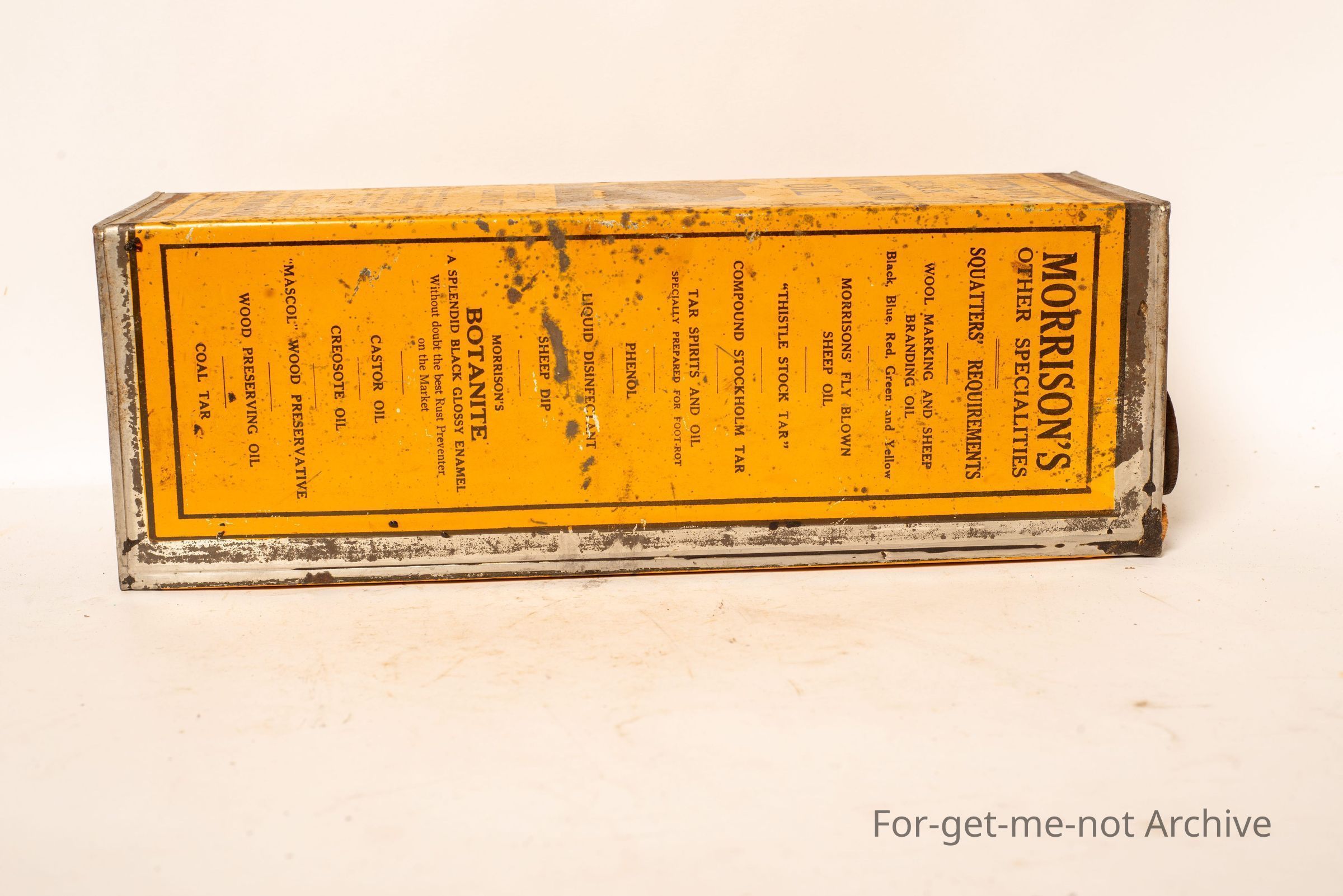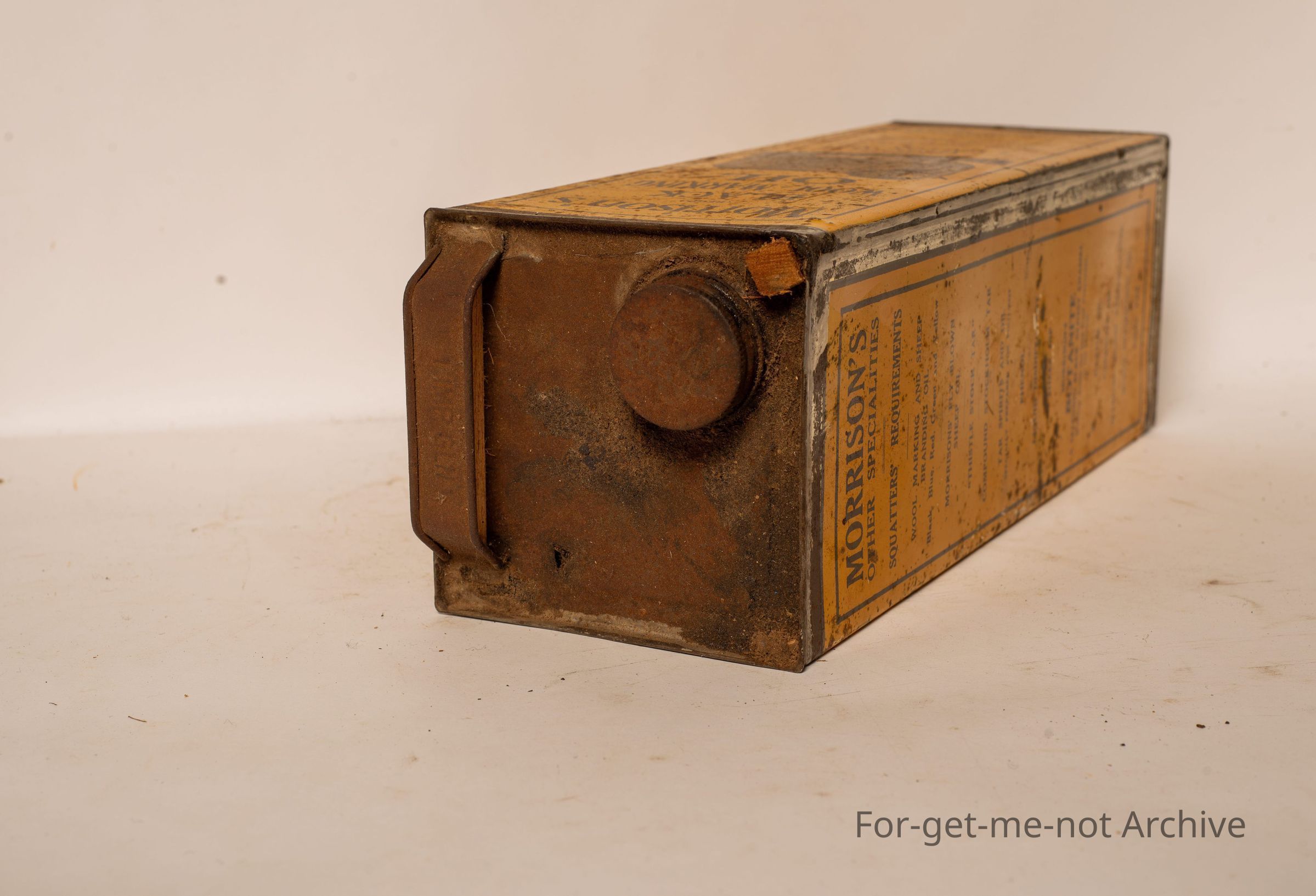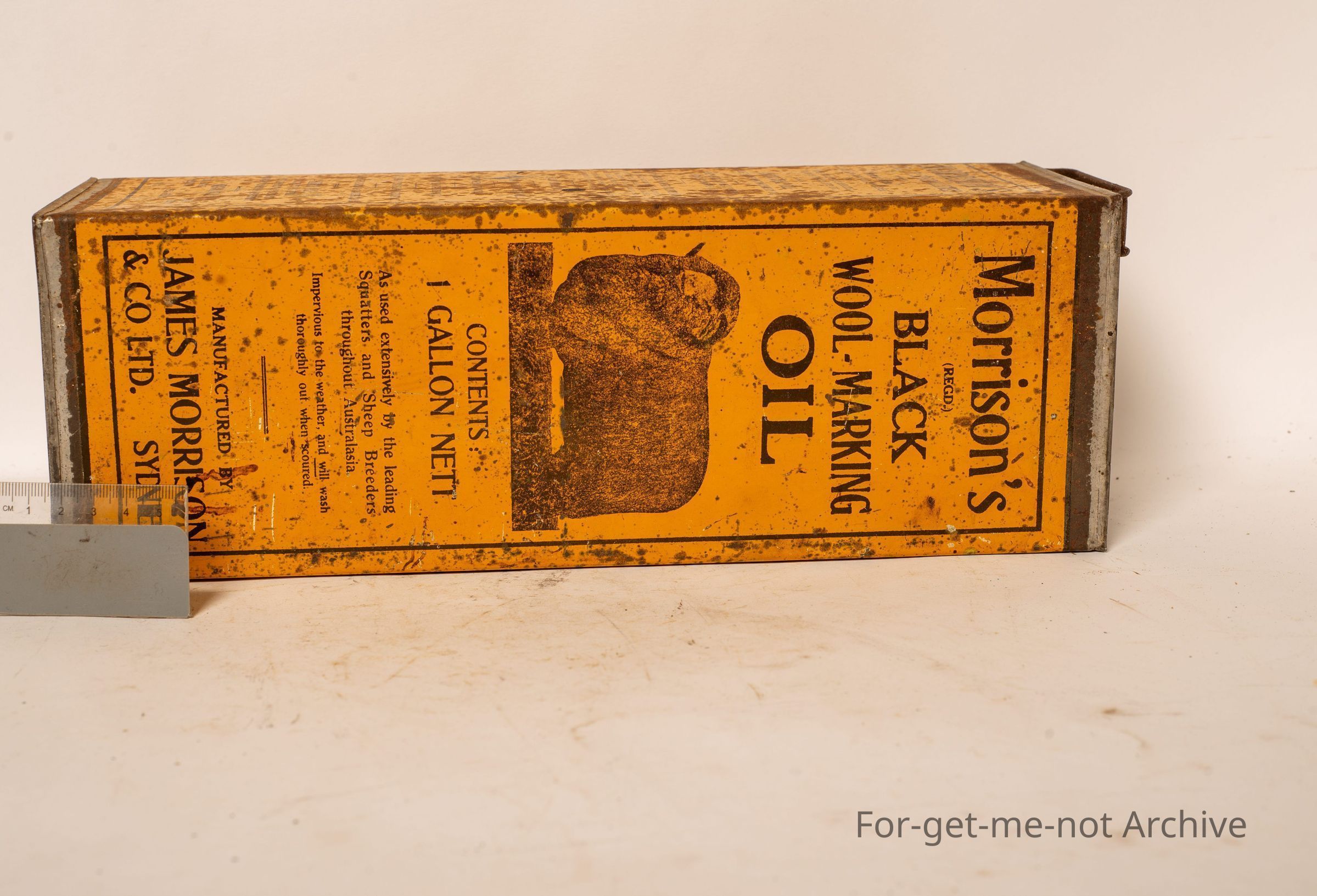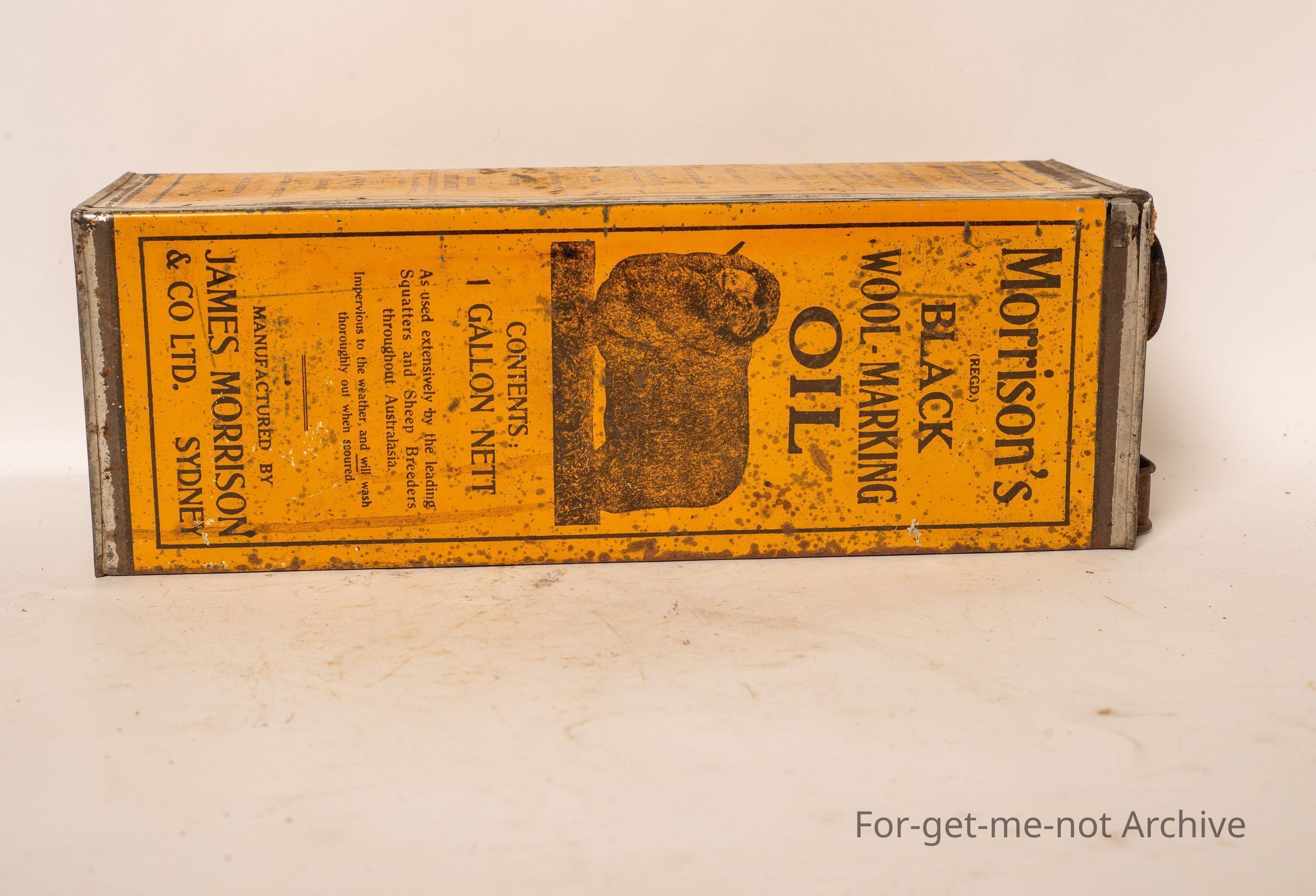 a large tall tin, contents, 1 gallon. This one, Morrison's black wool marking oil manufactured by James Morrison Sydney. Image of a merino ram on the front. This one is in pretty glorious condition,Collection