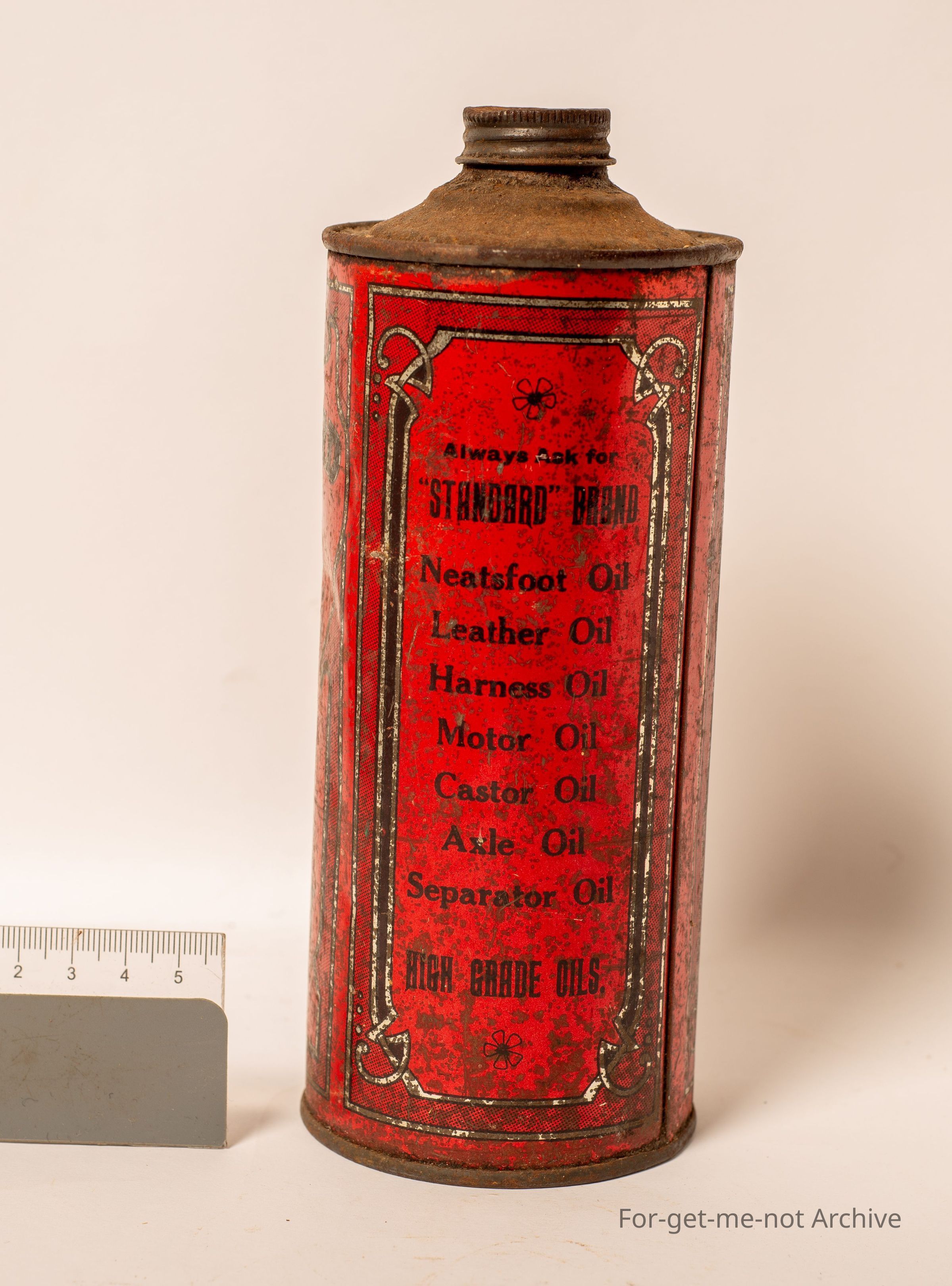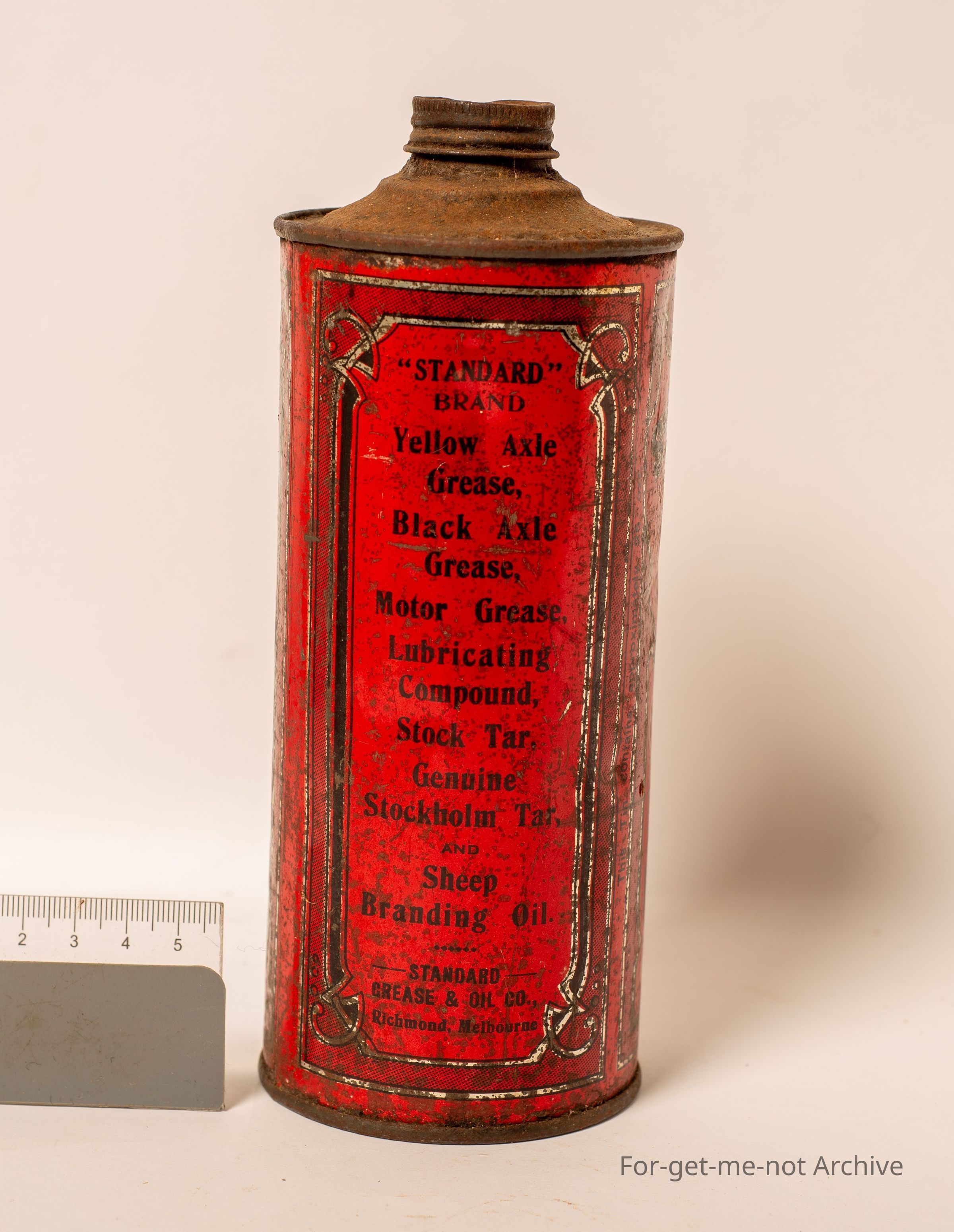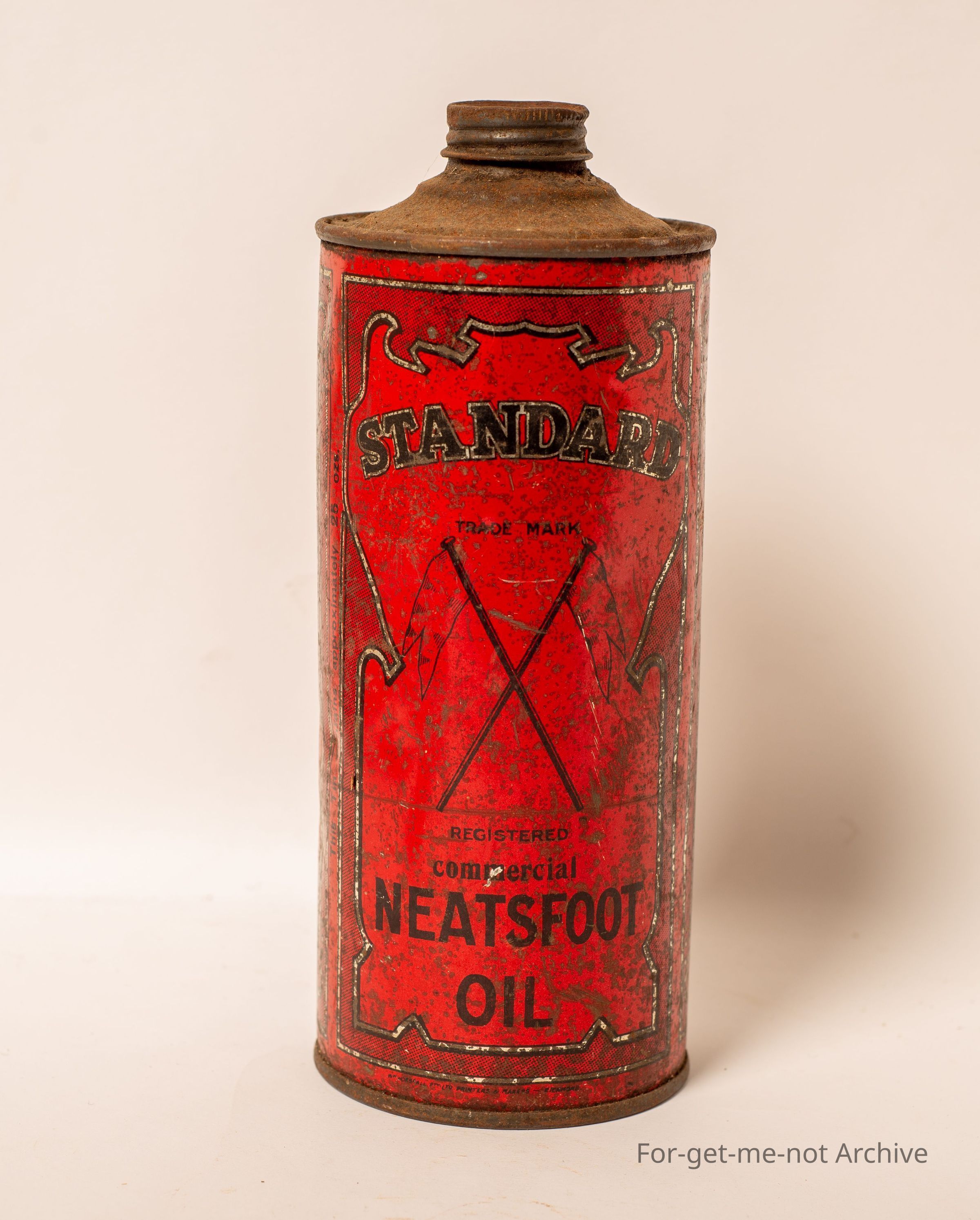 Is a tin of Neatsfoot oil made by the Standard Company, used for leather, harness, motor, cut, caster, and axle. High grade oils, sheep branding from the standard company, Richmond, Melbourne,Collection