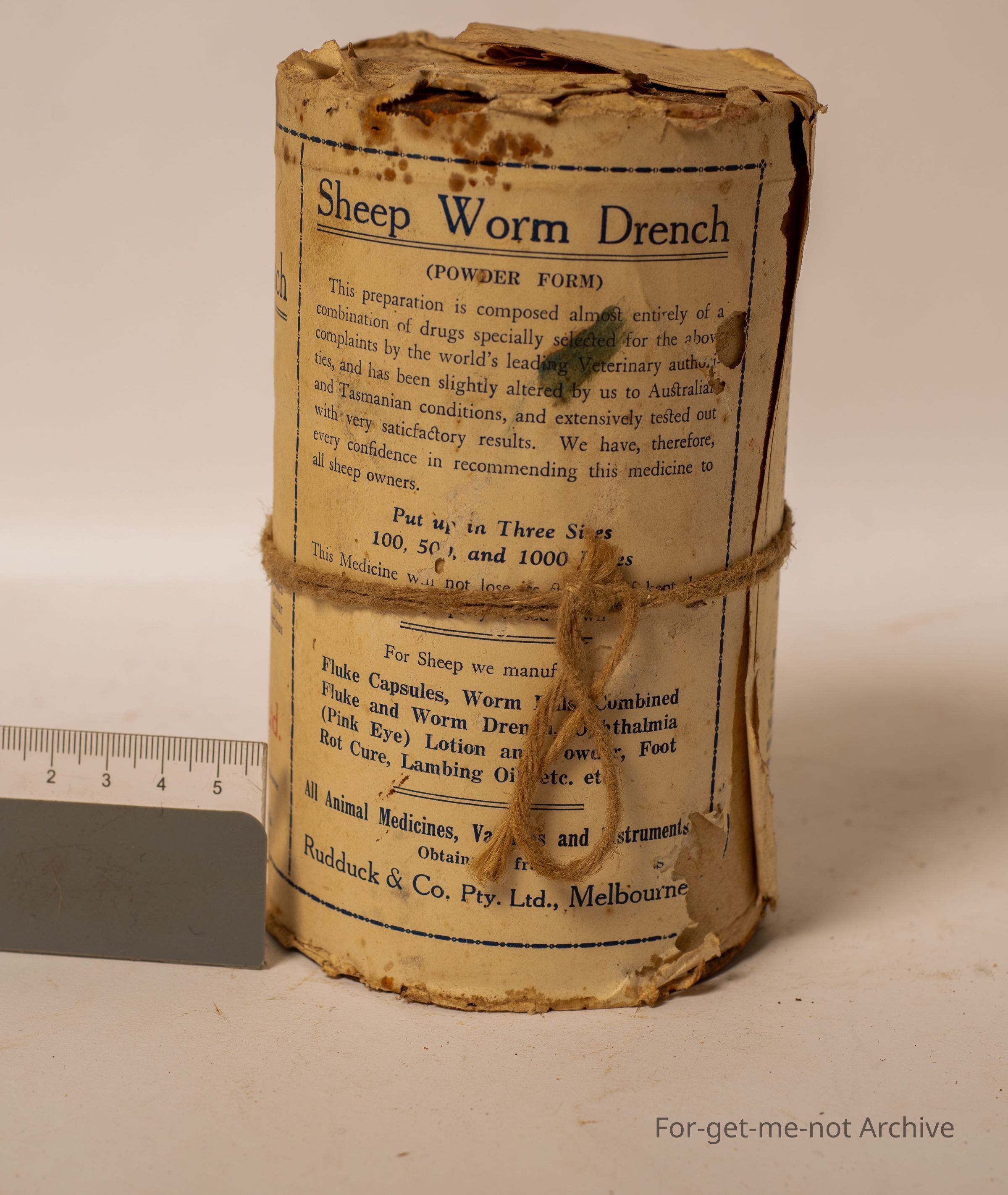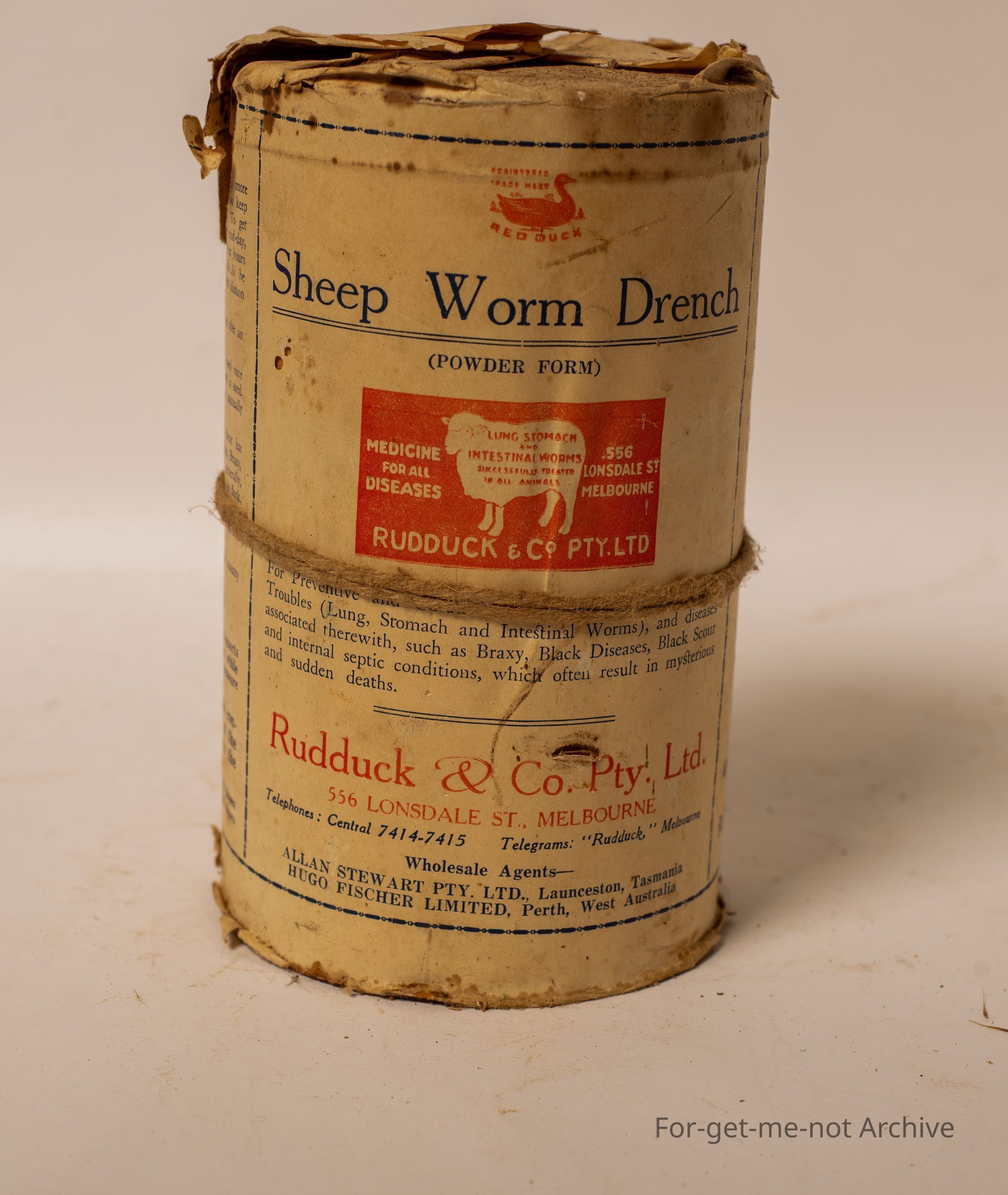 Is a tin of sheep worm drench made by Ruddock and Co, Lonsdale Street, Melbourne. Image of sheep. This tin has never been opened. Original paper wrapper still on it.