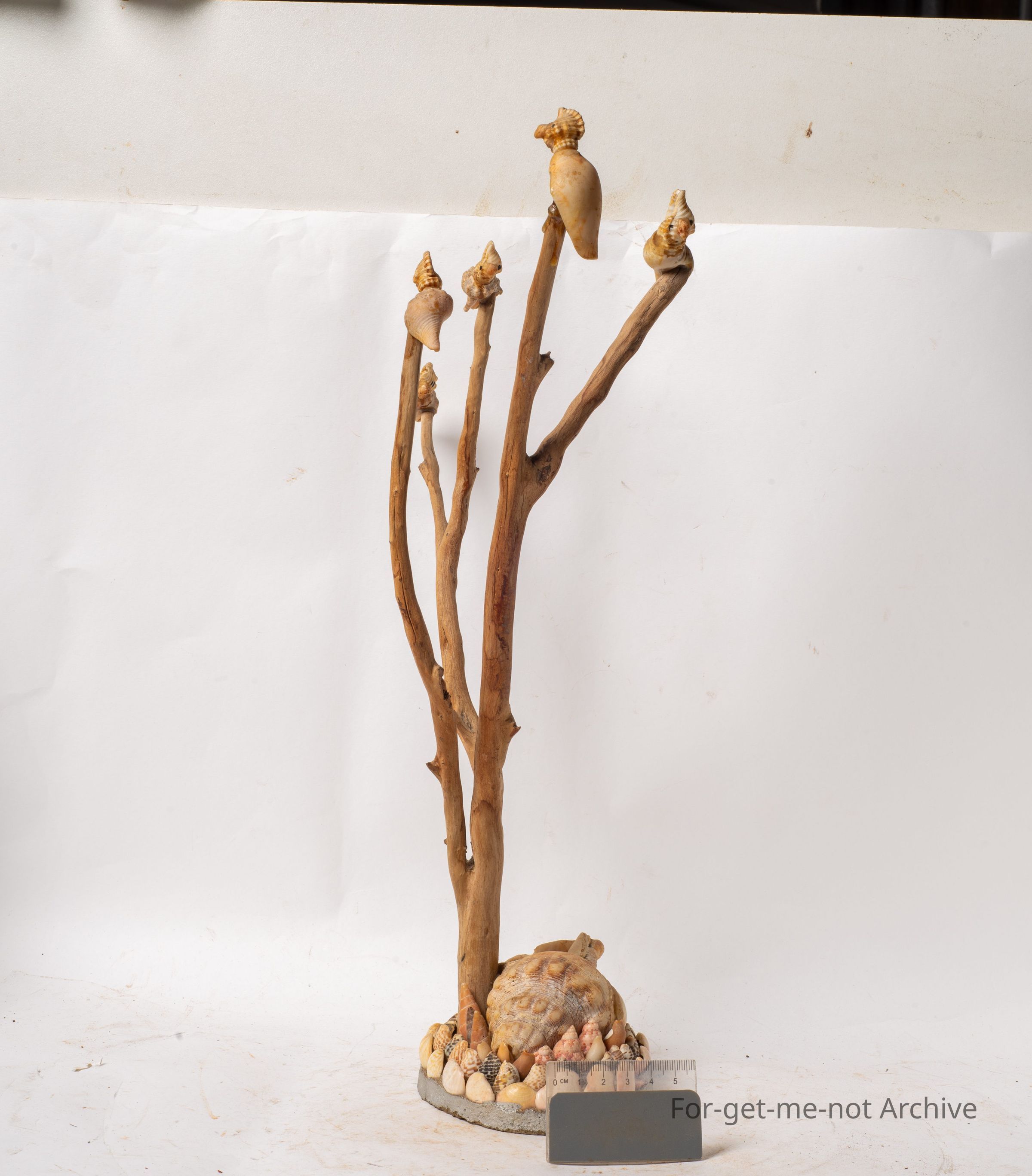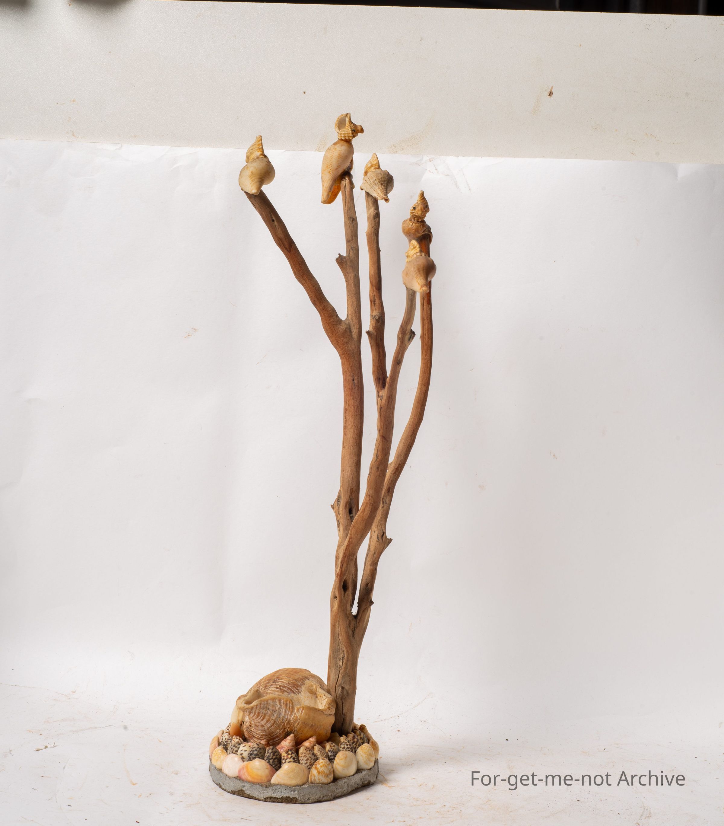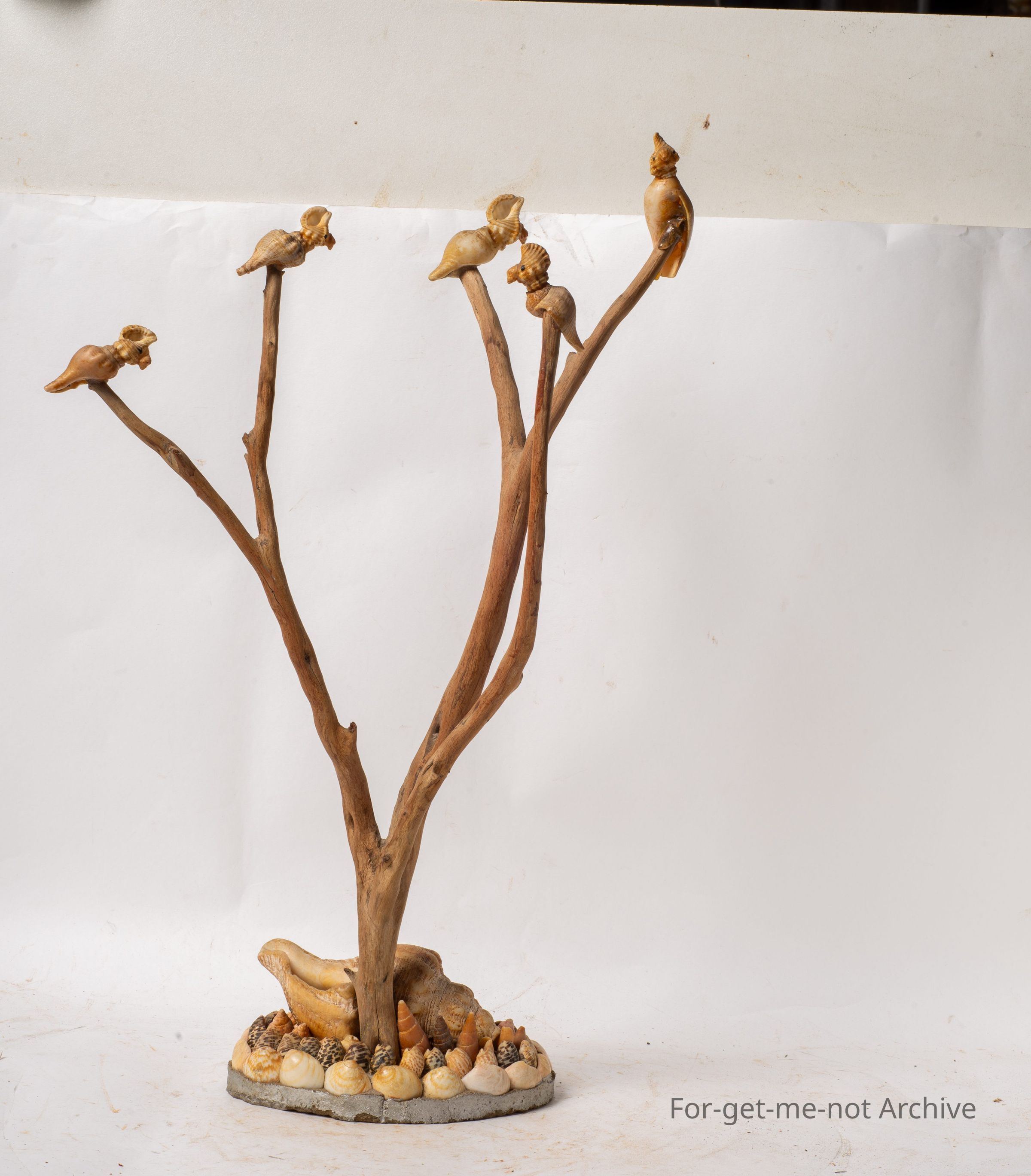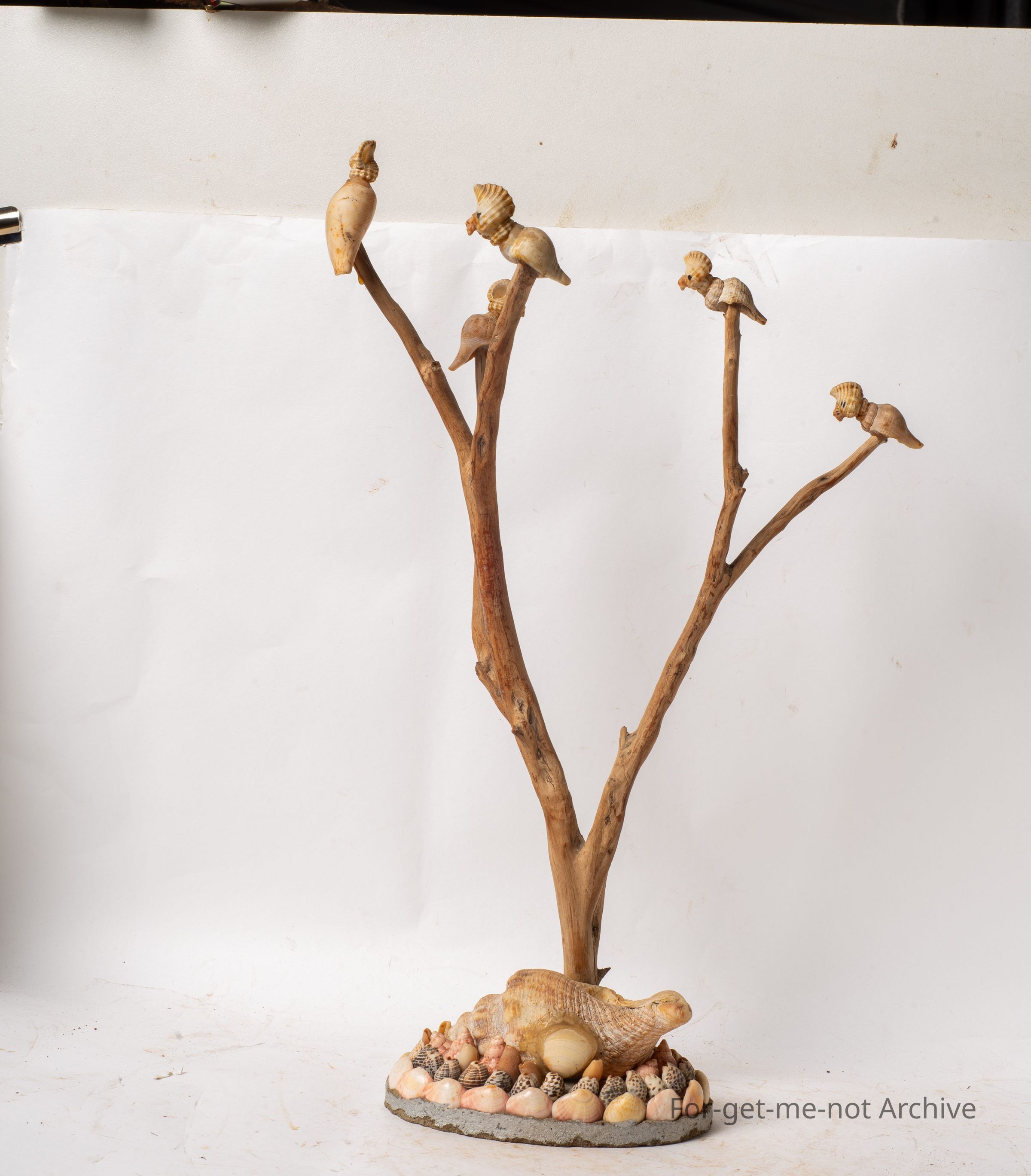 This is a decorative piece from the shell display. It has, dried wooden branches from a tree. On each tip is, a shell formed cockatoo, very cleverly done. The base is a larger shell on a piece of plaster, with various shells around it. Glorious little piece.Collection
