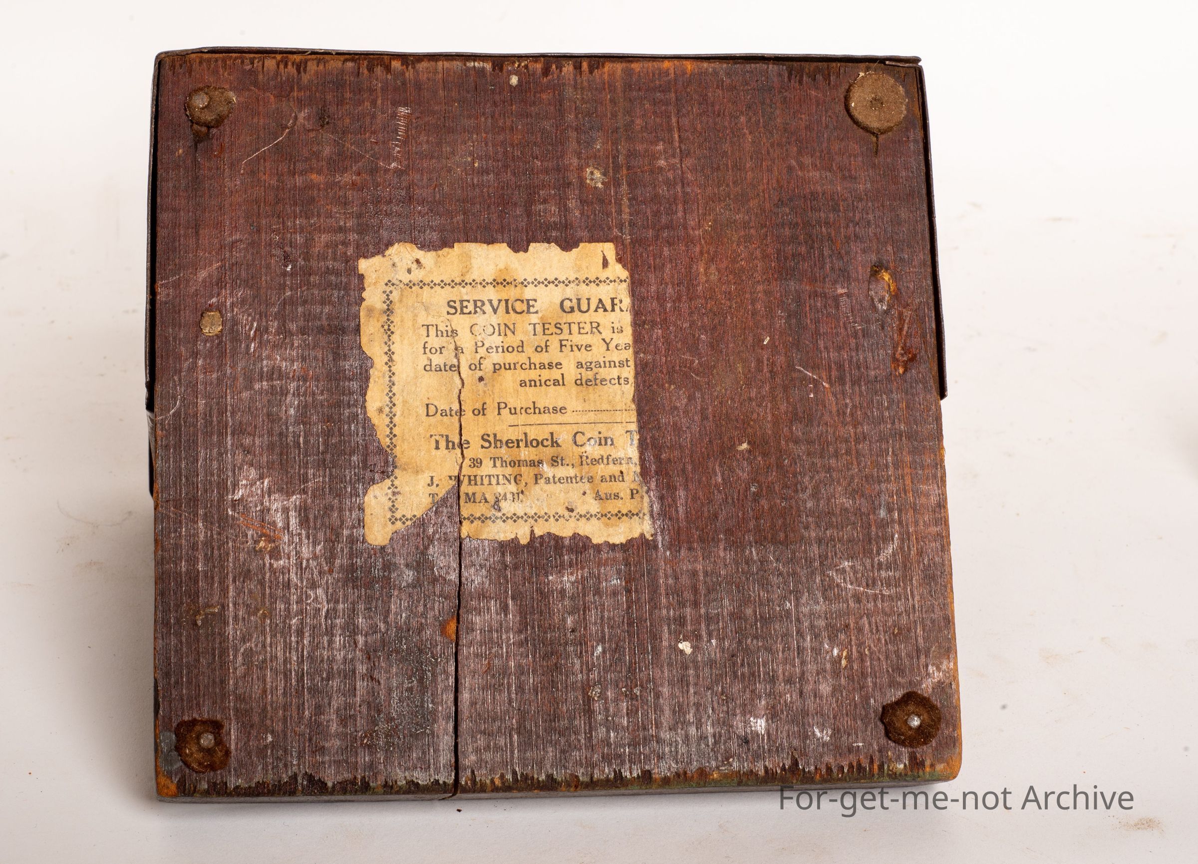 This is referred to as the Sherlock coin tester 19 twenties. It was manufactured at 39 Thomas Street, Redfern, New South Wales. The coin tester was made because of the huge amount of counterfeit coins circulating at the time. This apparatus was mainly used, in situations where coins were changing hands in large numbers such as banks or busy shops, set of counter scales which sorted the genuine coins from the counterfeit. Rare pieceCollection
