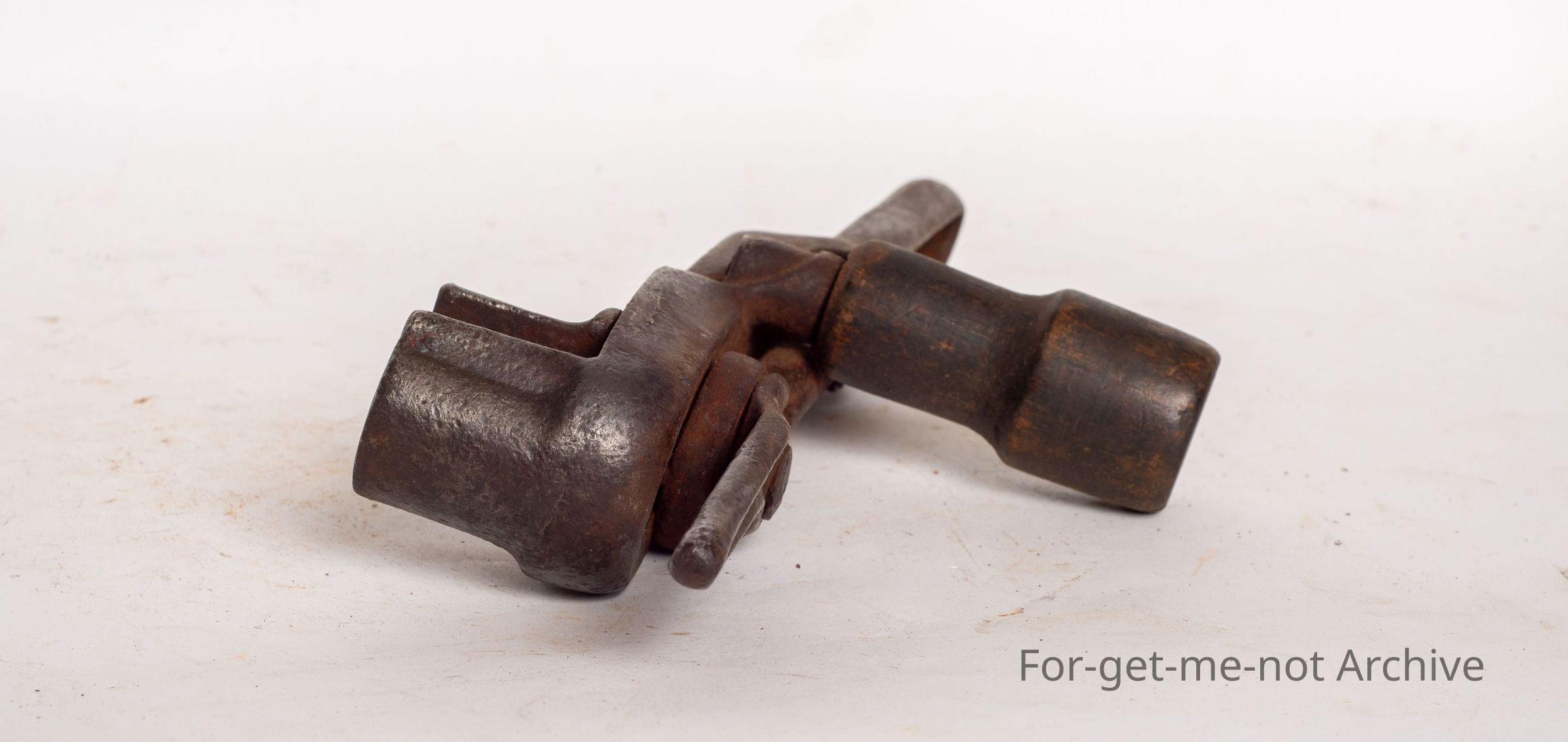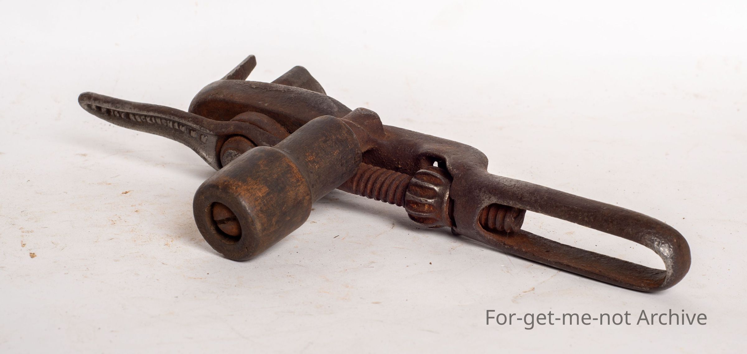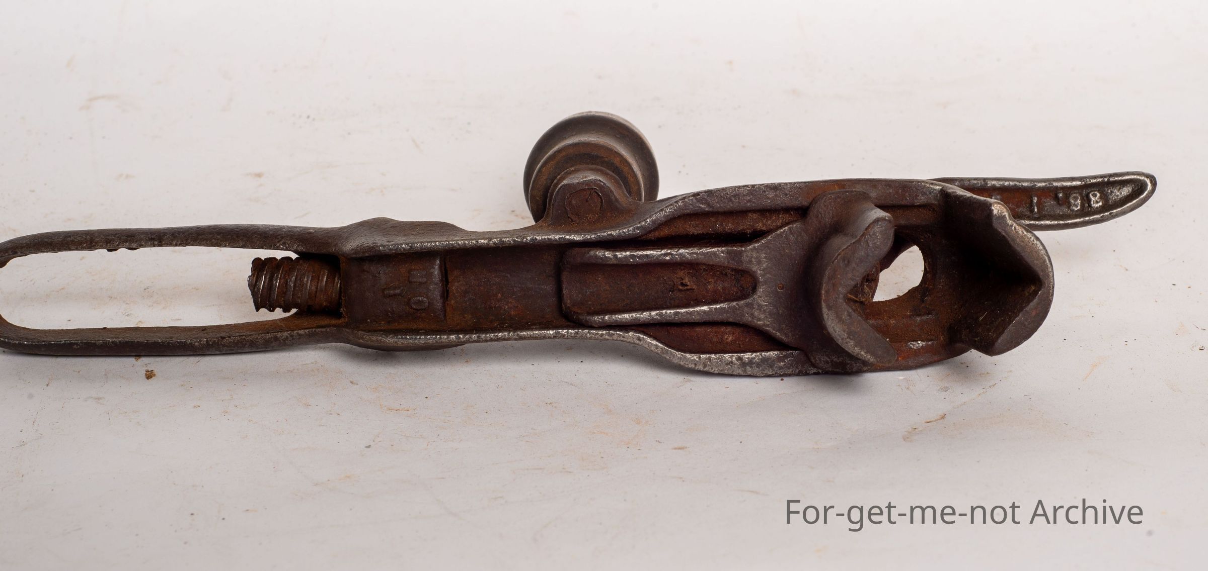 This is a very, very early shifting spanner, wooden handle on the side. The locker handle on the end has Rockingham, New York. Wonderful early tool. Still in good condition.