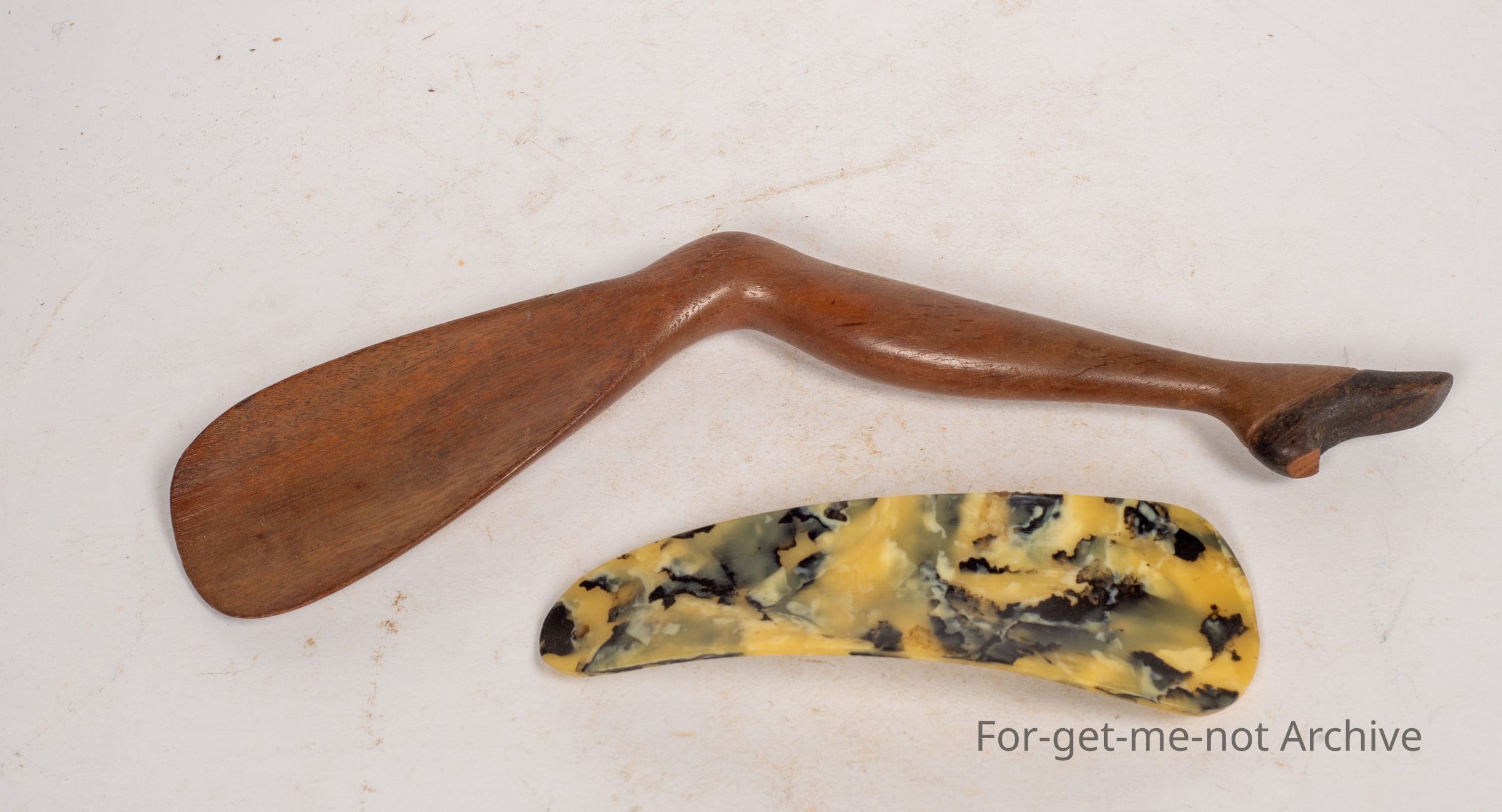 2 shoe horns. One wooden shoehorn in the shape of a lady's leg with a shoe on. The other one, a small nondescript plastic one in a beautiful mottled plastic colour of cream and black.Collection
