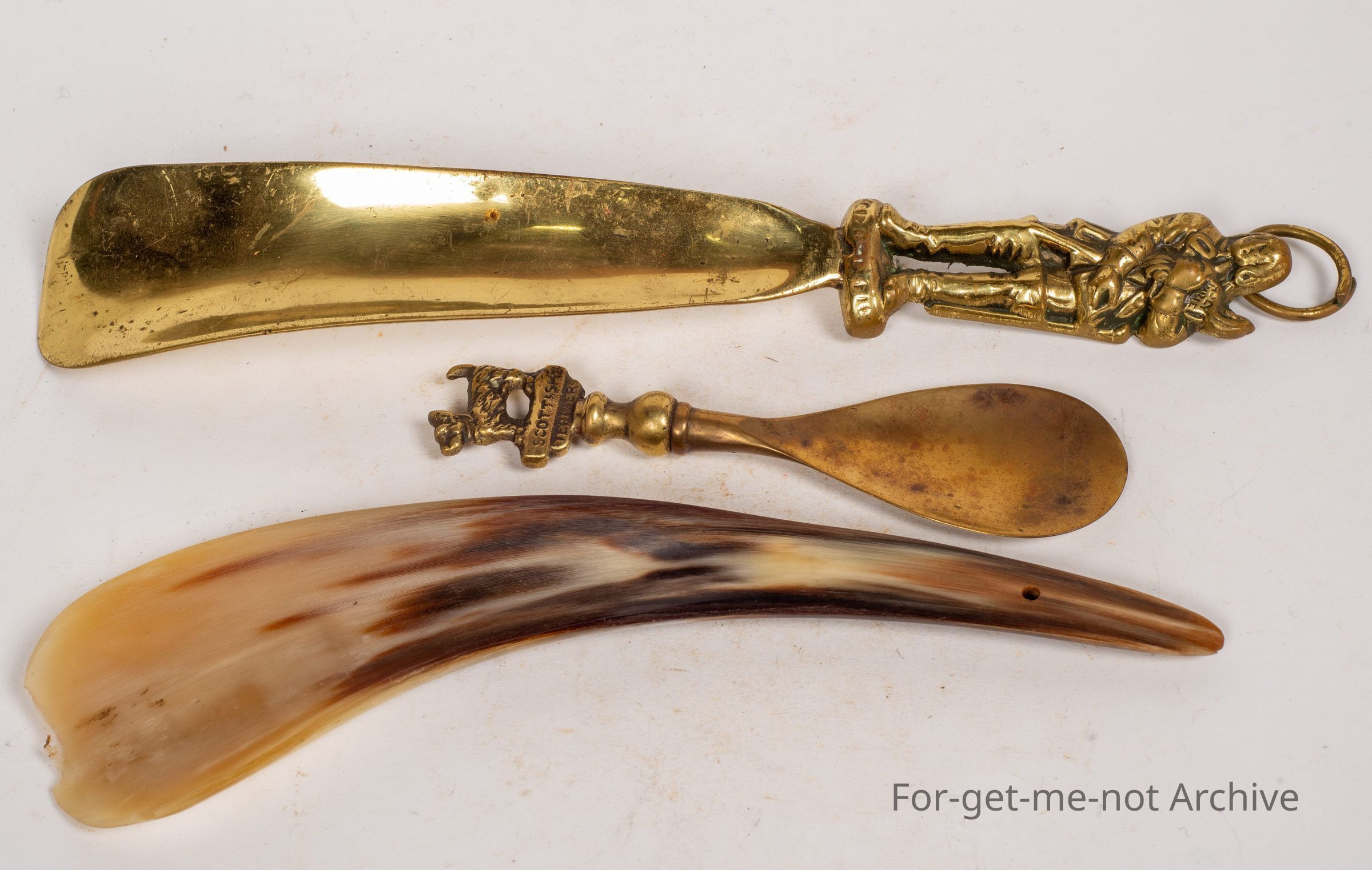 Shoehorns, large brass one, image of bagpipe player perhaps. Second one image Scottish Terrier dog on a smaller one.3rd one is a cow horn shoehorn.