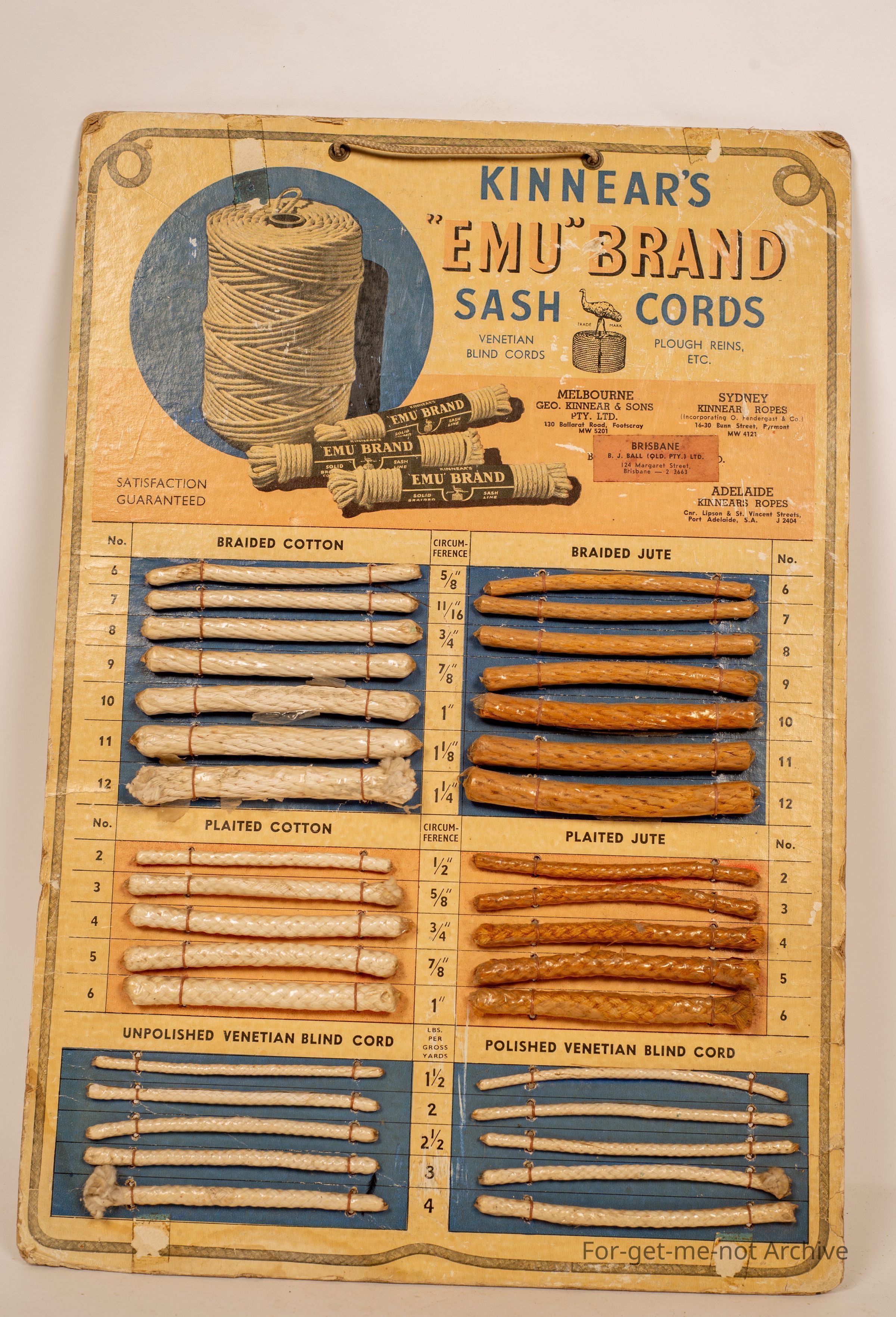 Shop display card for Kineers Emu brand Sash Chords. This one is from Brisbane, BJ Ball, Queensland. Very good condition