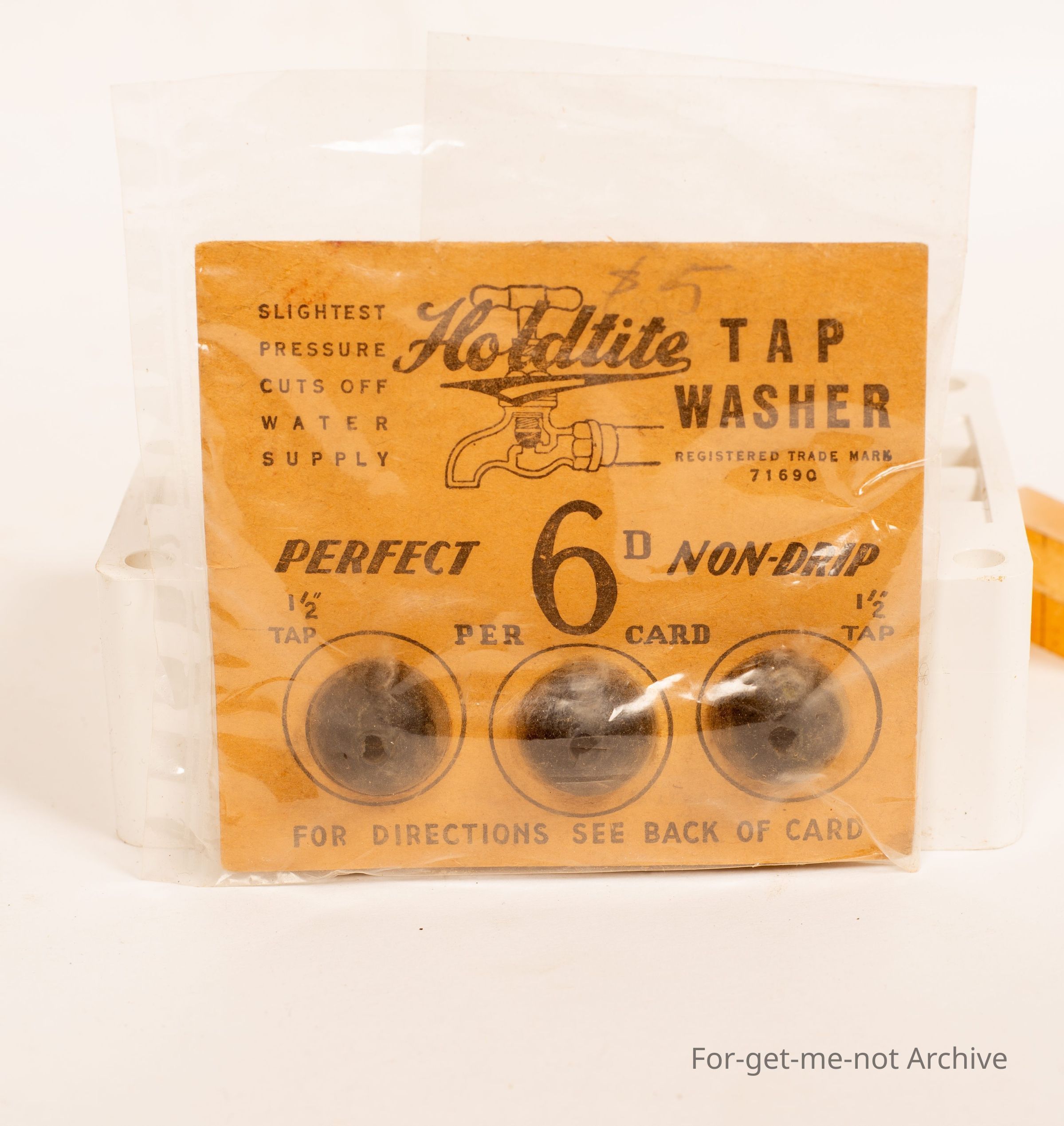 Cardboard wrapper for hold tight tap washers, perfect non drip, 6pence.