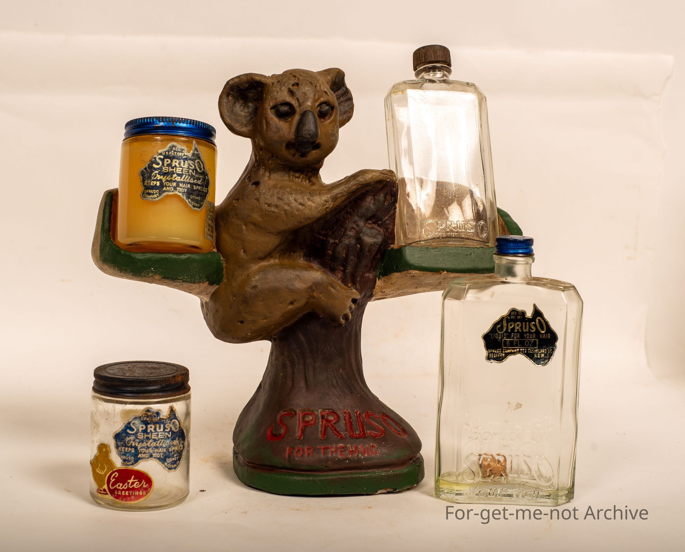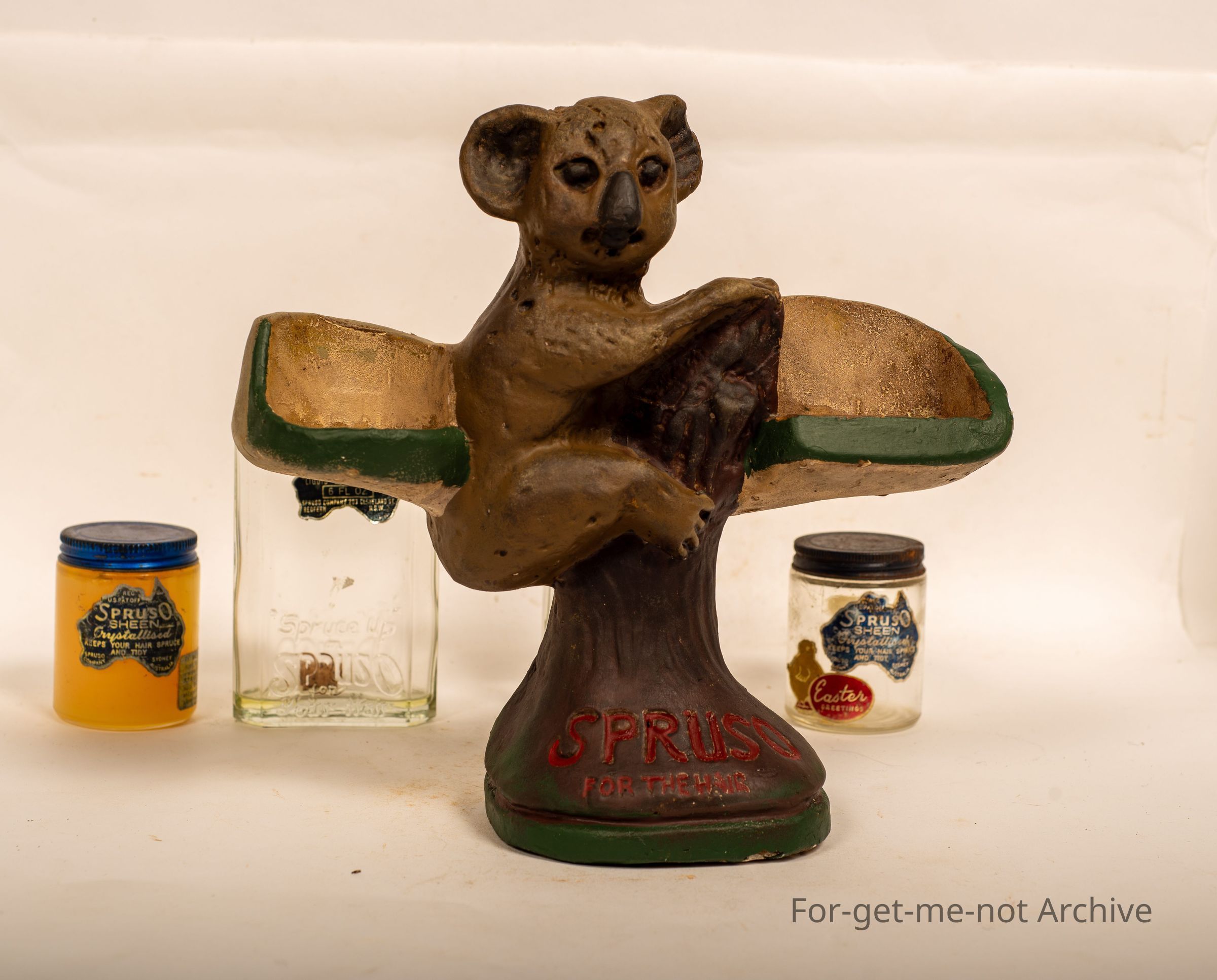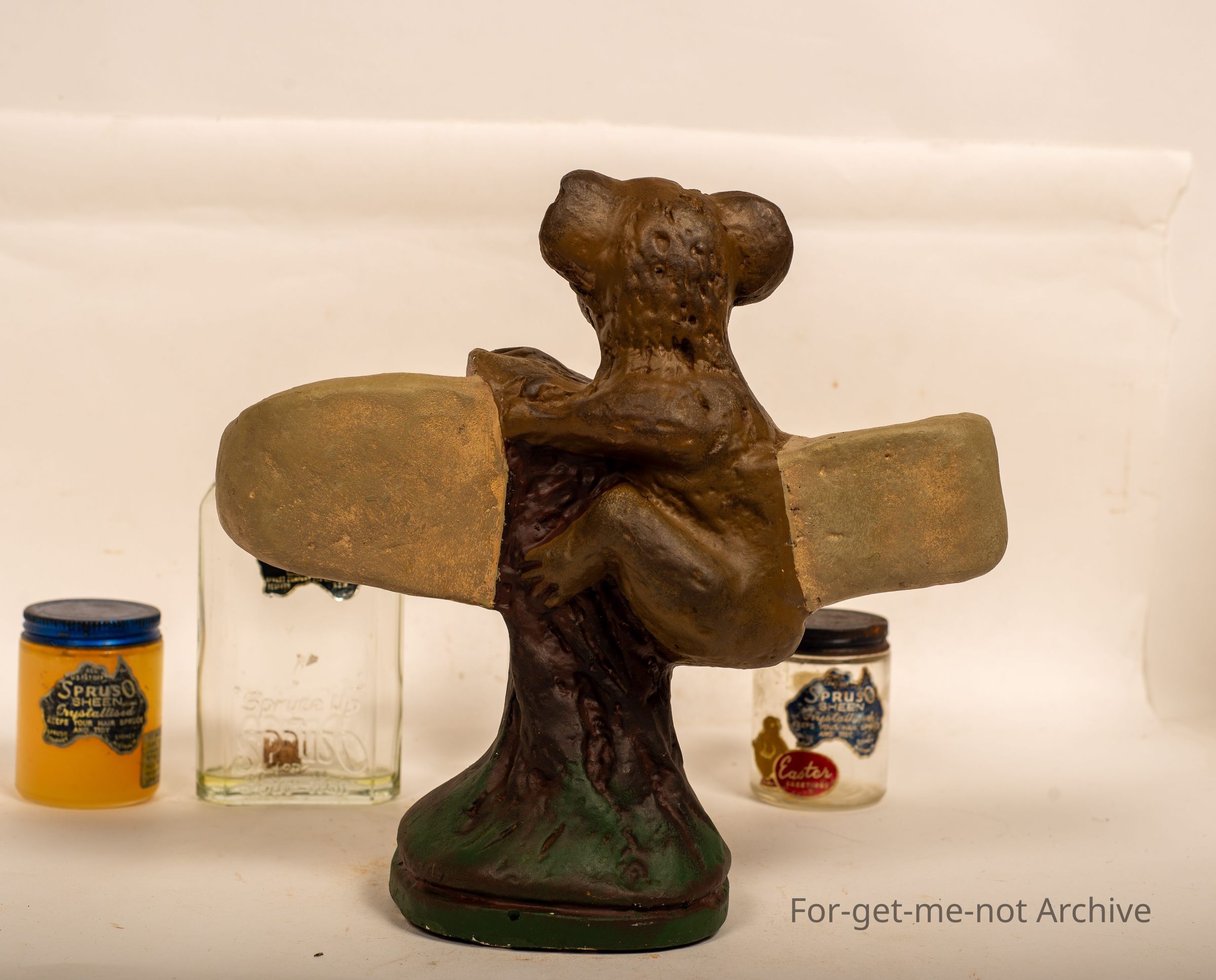 This is an advertising piece of a koala sitting in a tree, with the space for a jar of the spruso paste and a jar of the spruso liquid on either side. Spruso written across the bottom. Spruso was made in Redfern, Sydney, many years ago. This is a very rare advertising piece to see in such wonderful condition.Collection