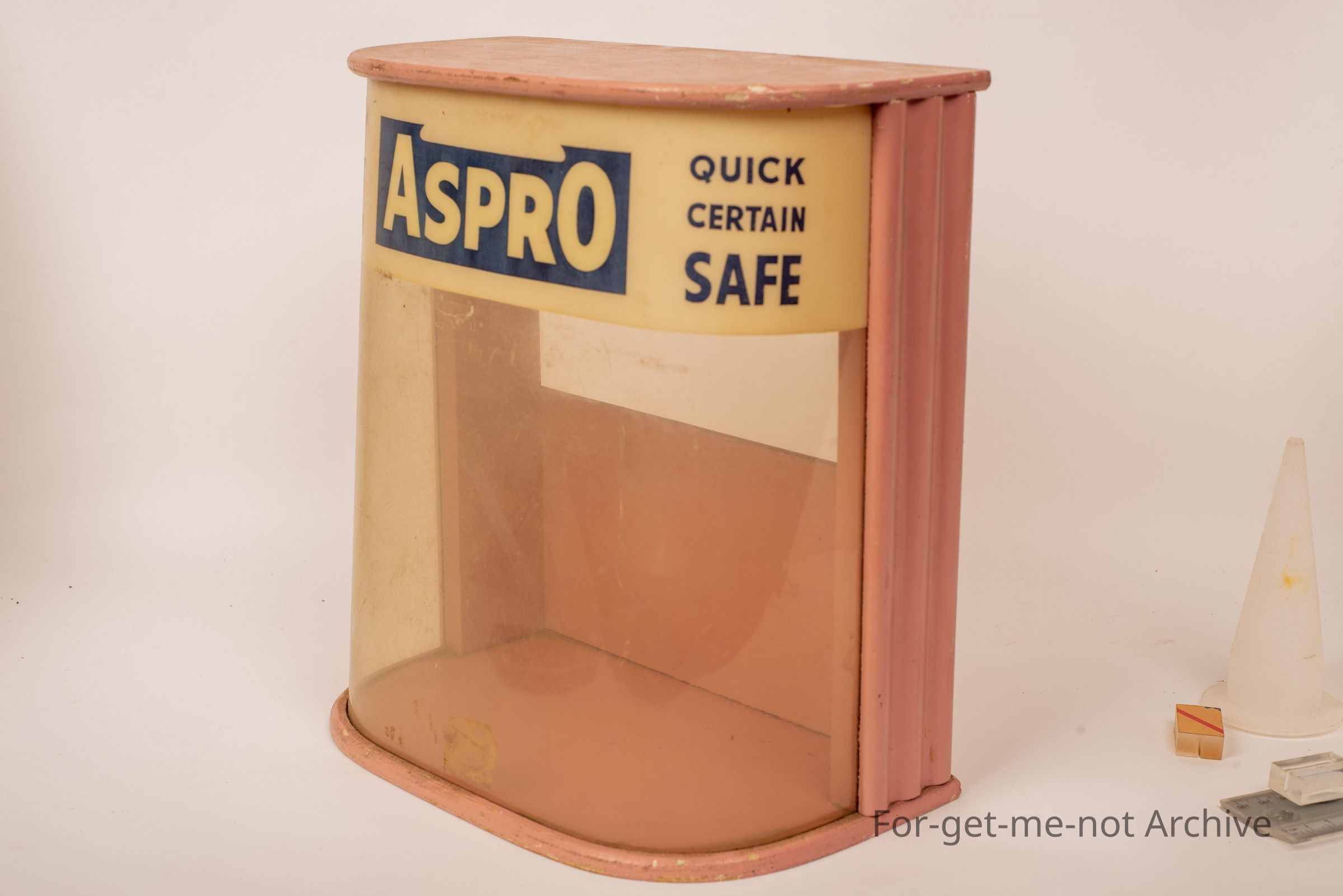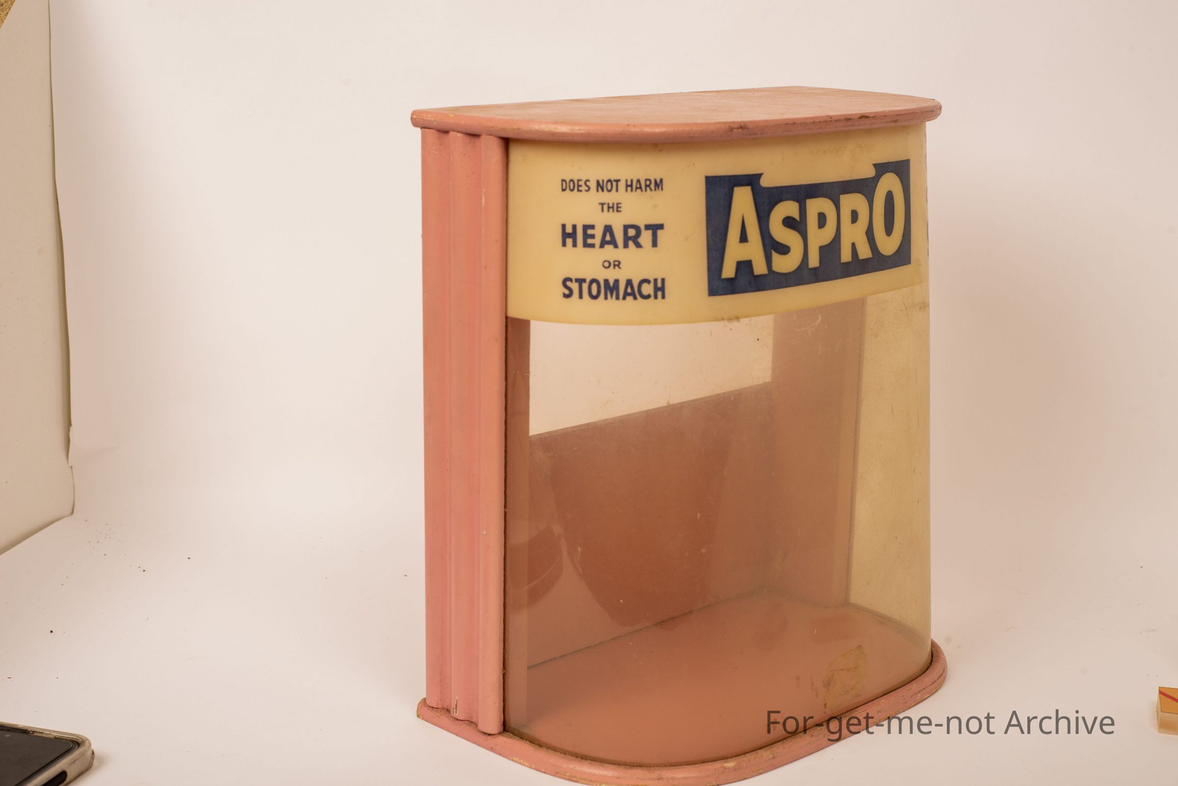 Small shop counter display for Aspro packets ..."does not harm heart or stomach"