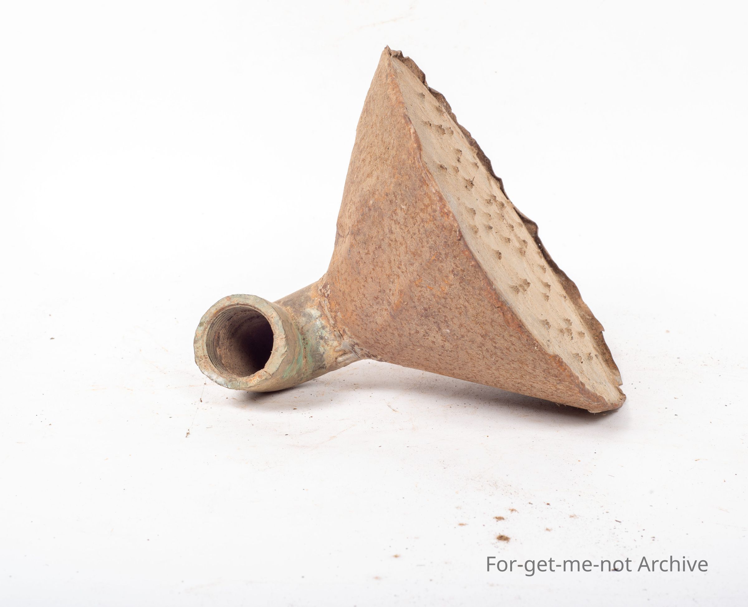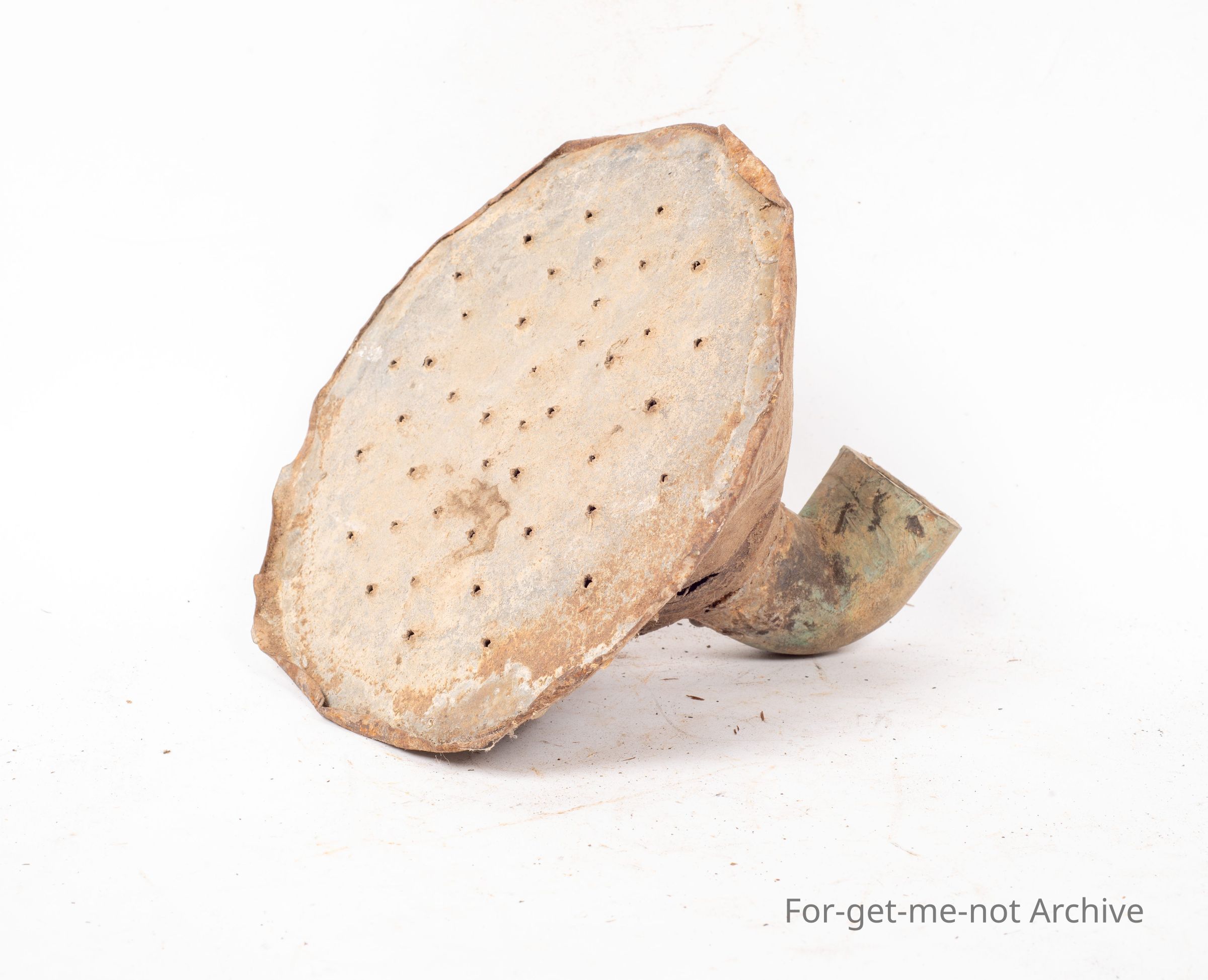 Is a homemade shower rose. Quite a heavy, 90 degree angle piece on the top which is actually made of brass. The tin work itself is made from an early kerosene tin. The base is perforated by nails and, pretty rough soldering to put it together. A lovely bush piece,Collection