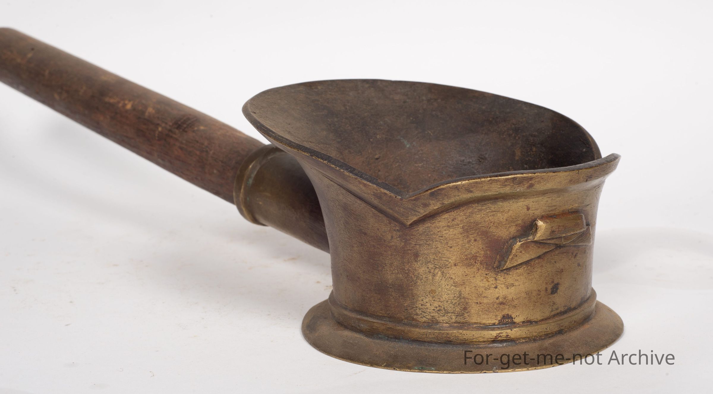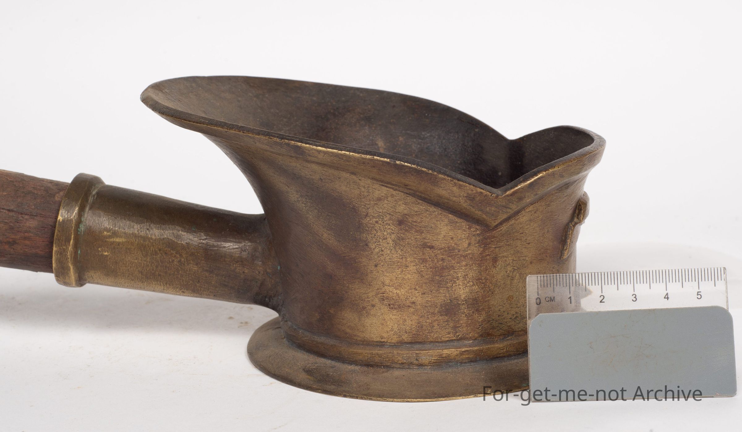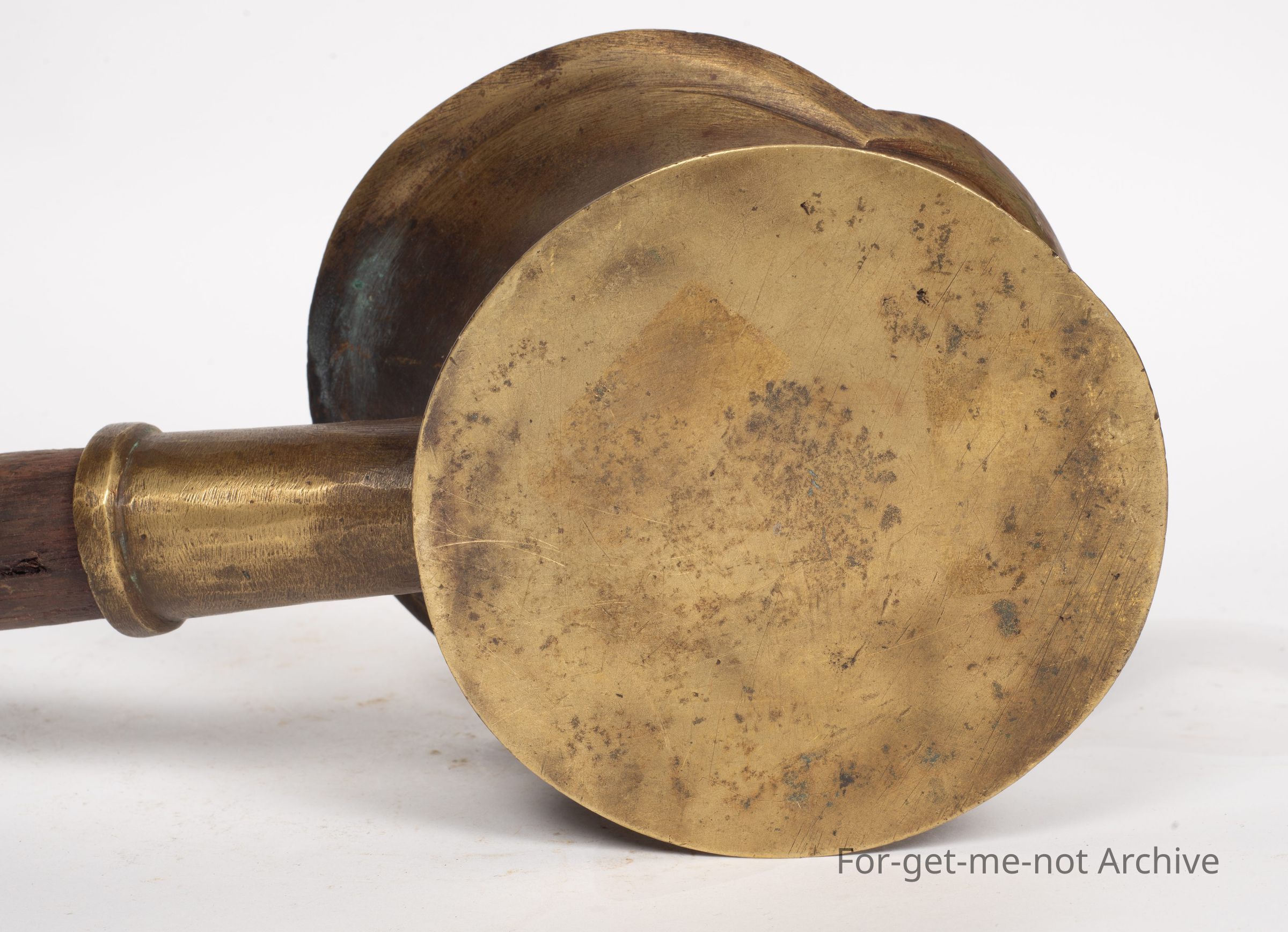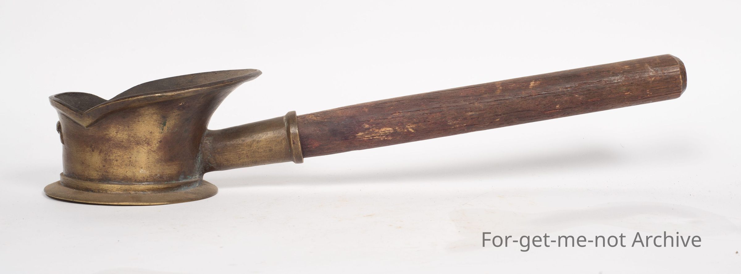 This is a, Chinese silk iron cast brass, wooden handle, probably would have come out with the Chinese that came from Gold Rush. This is a domestic piece for ironing silk when filled with hot coals. The heat radiates through a very smooth, polished base. A lovely piece,Collection