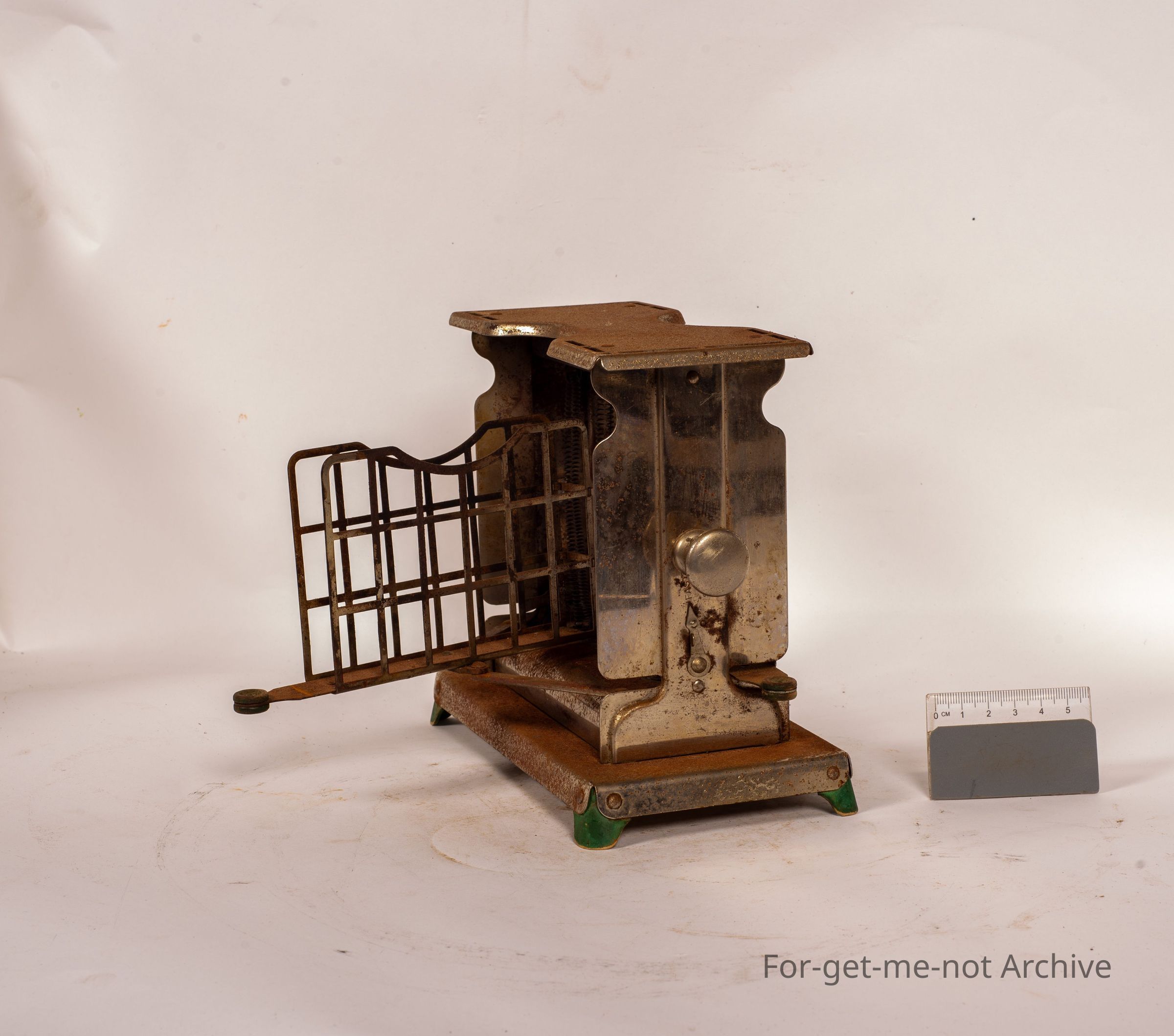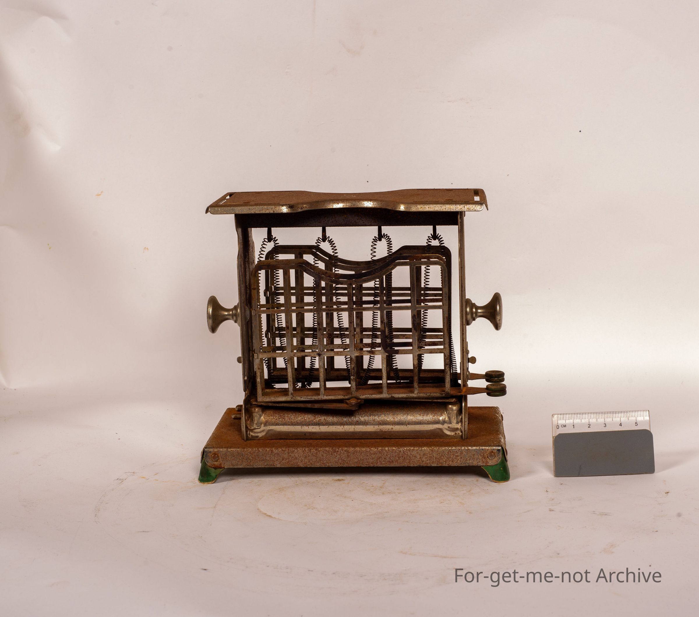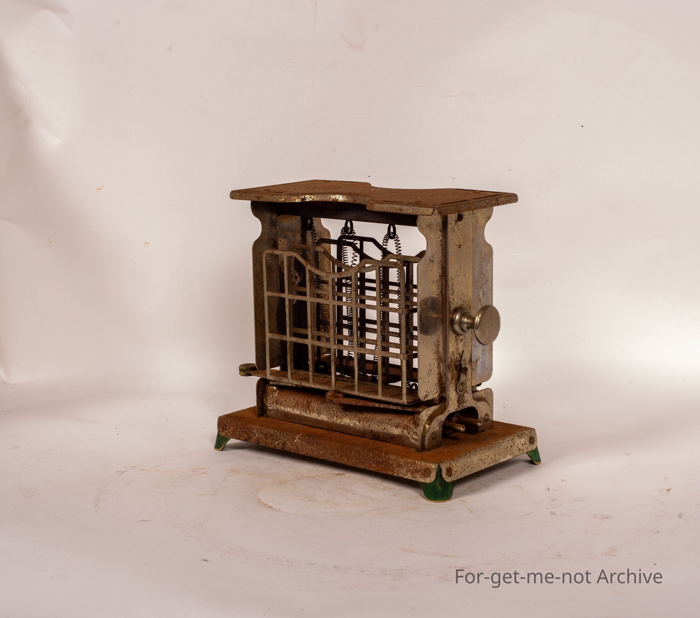 Skeleton toaster. Electric with a lever on the side that when you pull a lever, the piece of toast is rotated to the other side. A very skilfully designed piece. This is all equipped with its element, the legs and, yeah. Very good. This Skeleton Toaster is made in the USA by Electra Light.Collection